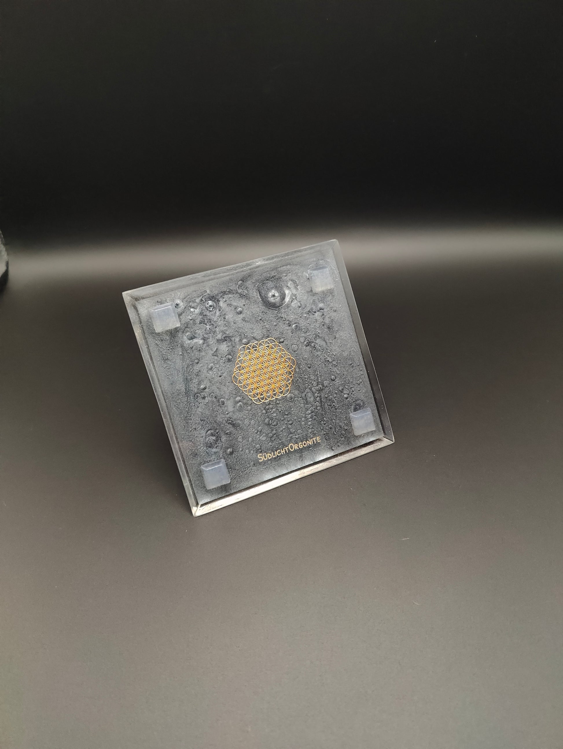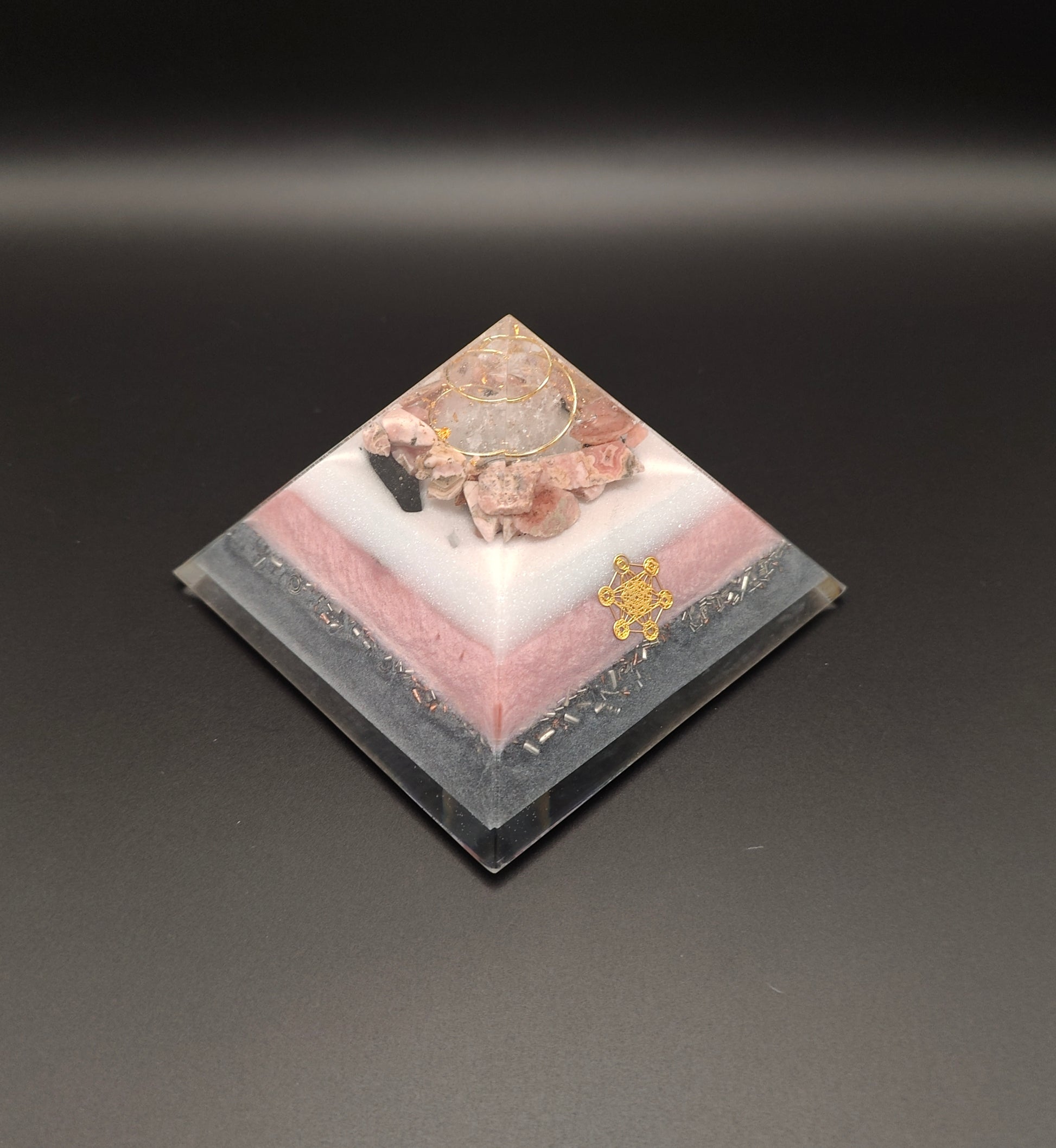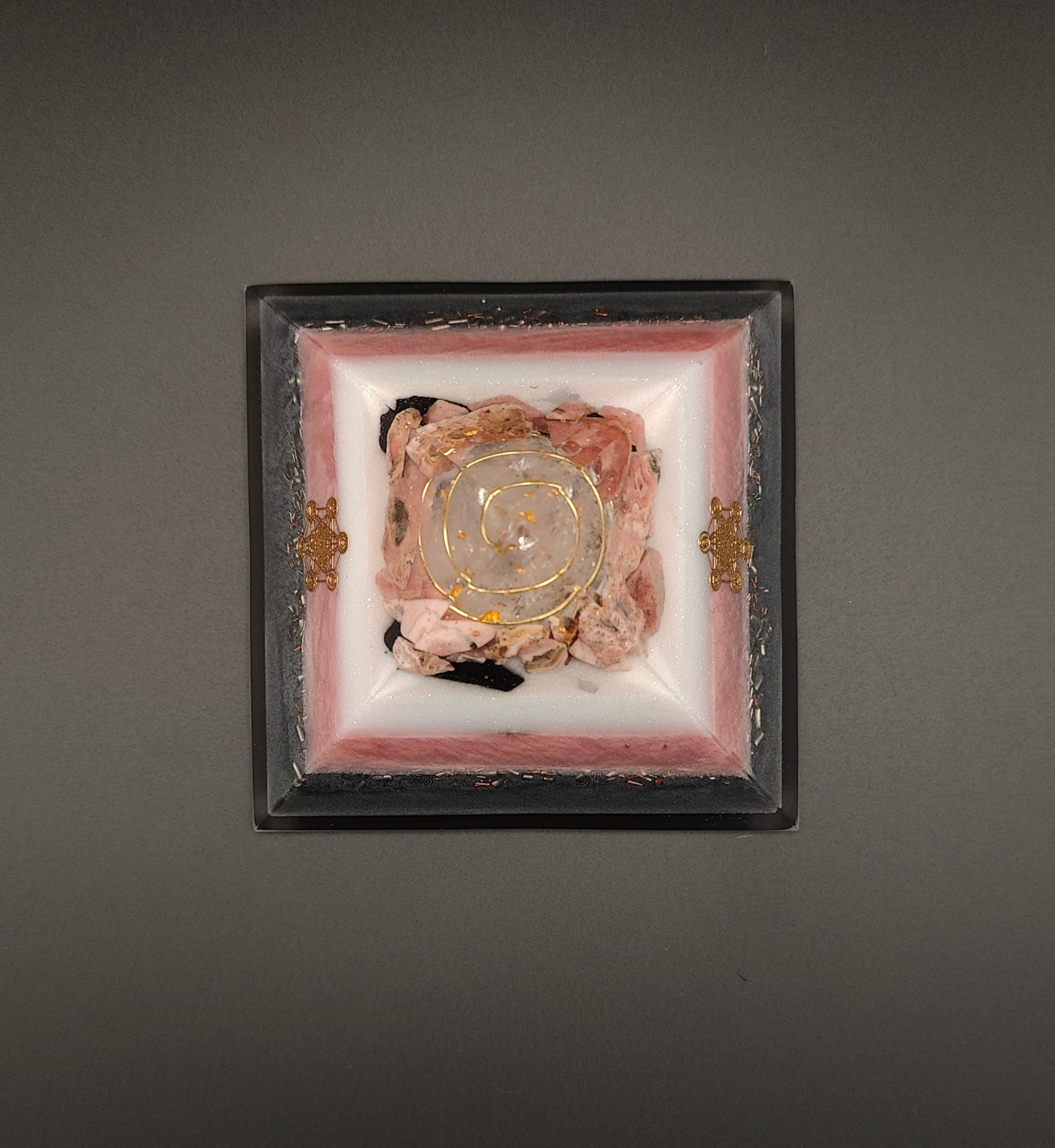 In den auf die Steine abgestimmten Farbschichten finden sich Eisen, Kupfer, Messing, Magnetit und Agnihotraasche. Zwei Seiten sind mit dem goldfarbenen Metatron und der Boden sind mit einer Blume des Lebens geschmückt.