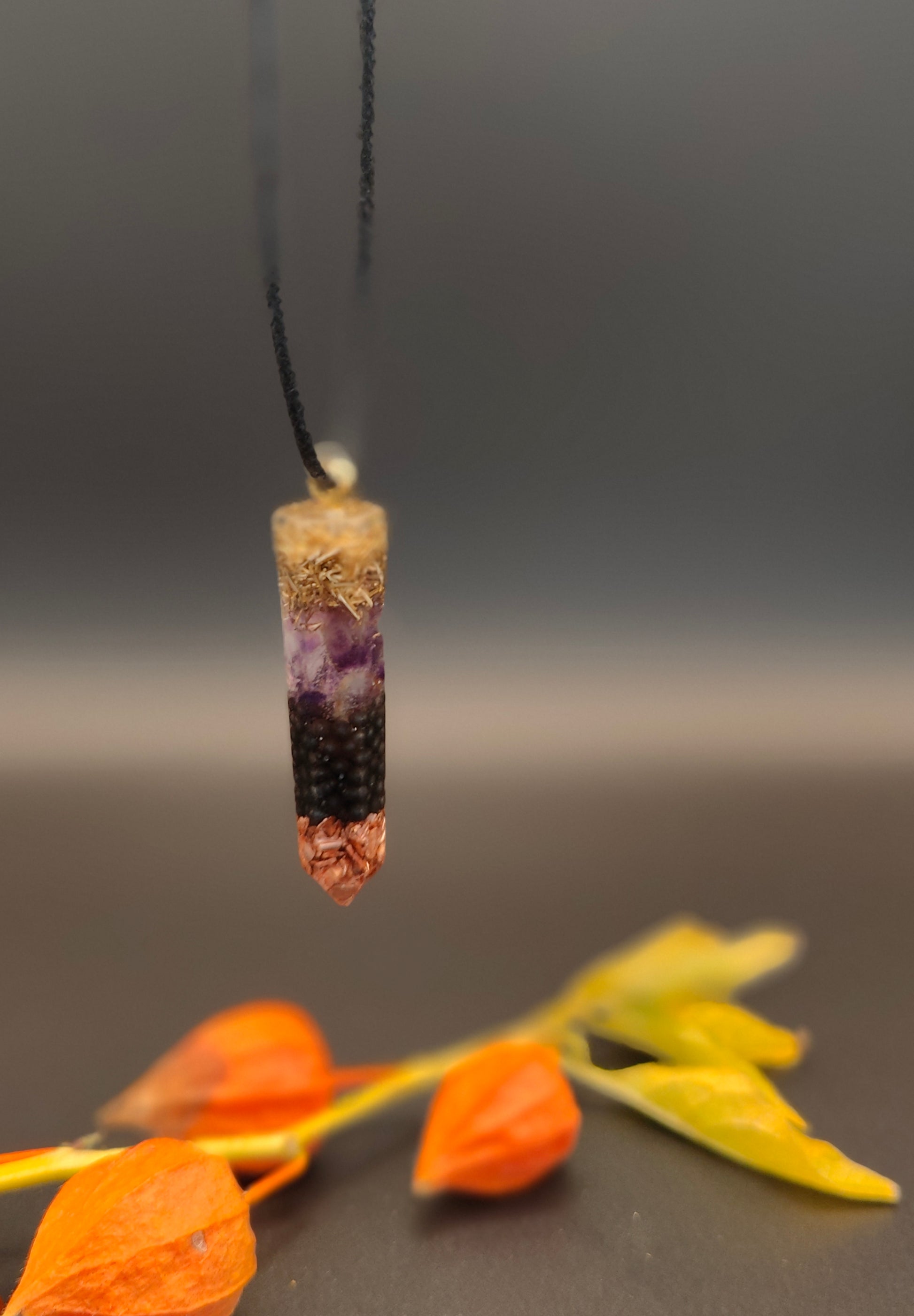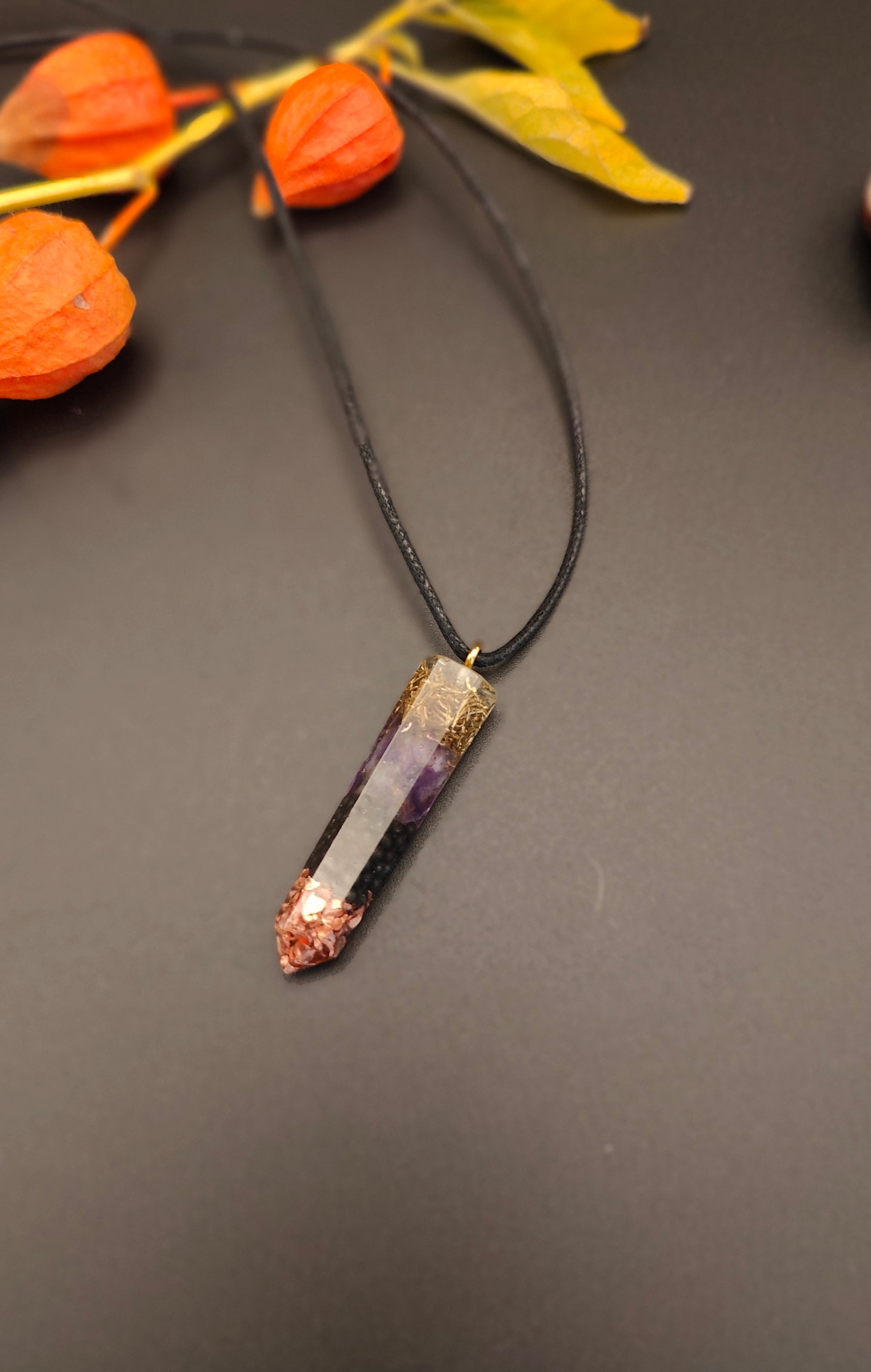 Wunderschöner Anhänger mit Messing, Amethyst, Bergkristall, Stahl und Kupfer. Die Länge beträgt ca, 4,5 cm.