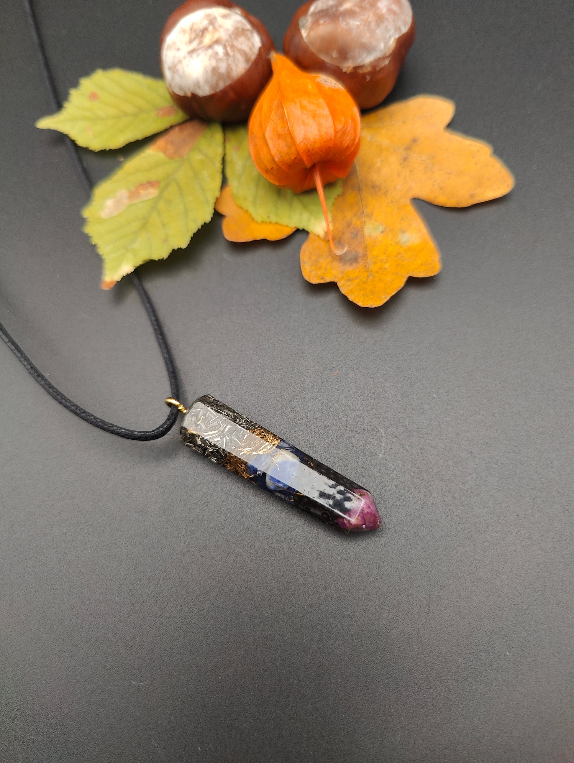 Wunderschöner Anhänger mit Eisen, Messing, Sodalith, Stahl, Bergkristall und Rubin. Die Länge beträgt ca. 4,5 cm.