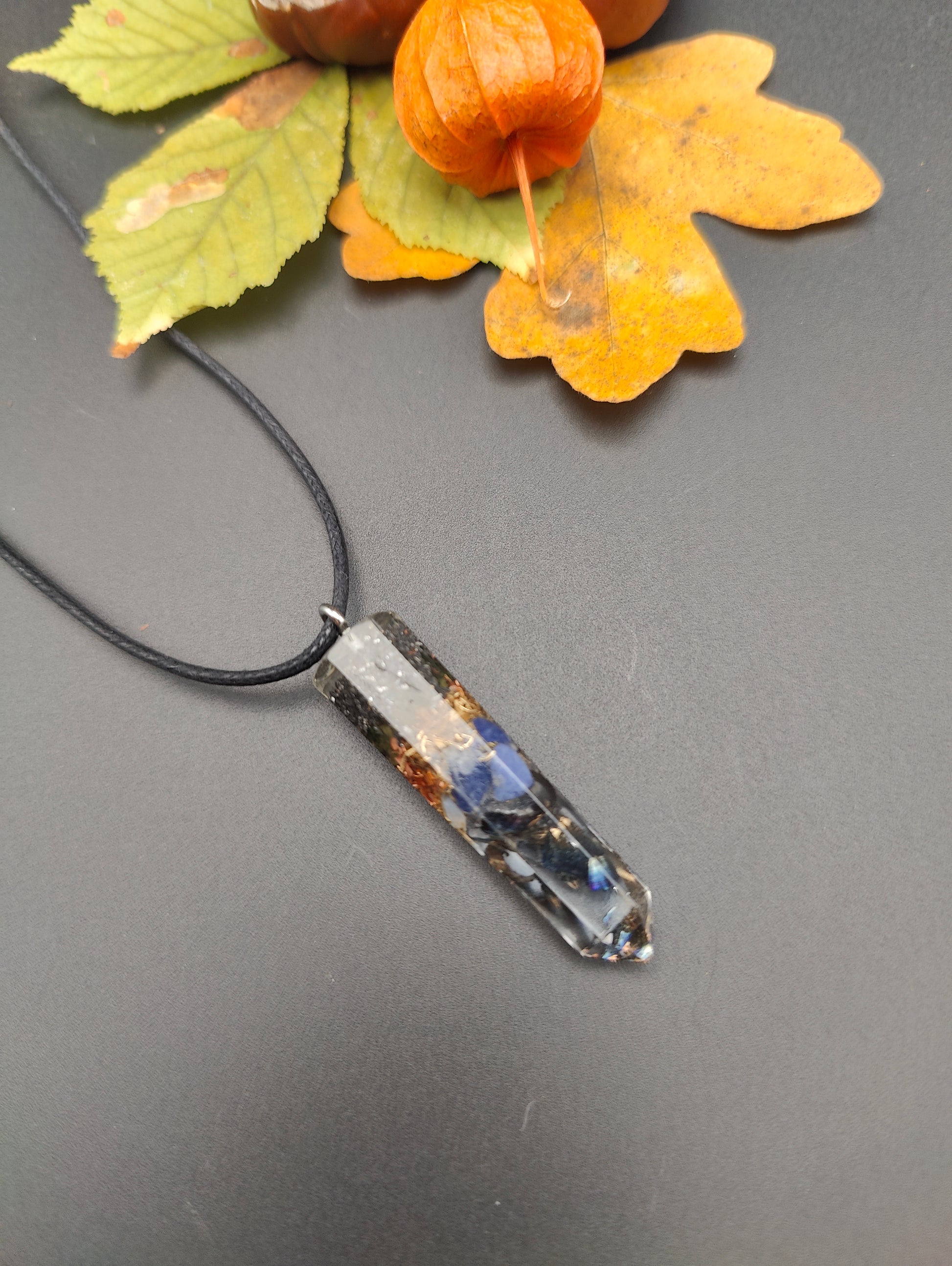 Wunderschöner Anhänger mit Eisengranulat, Kupfer, Messing, Sodalith, Bergkristall und Stahl. Die Länge beträgt ca. 4,5 cm.