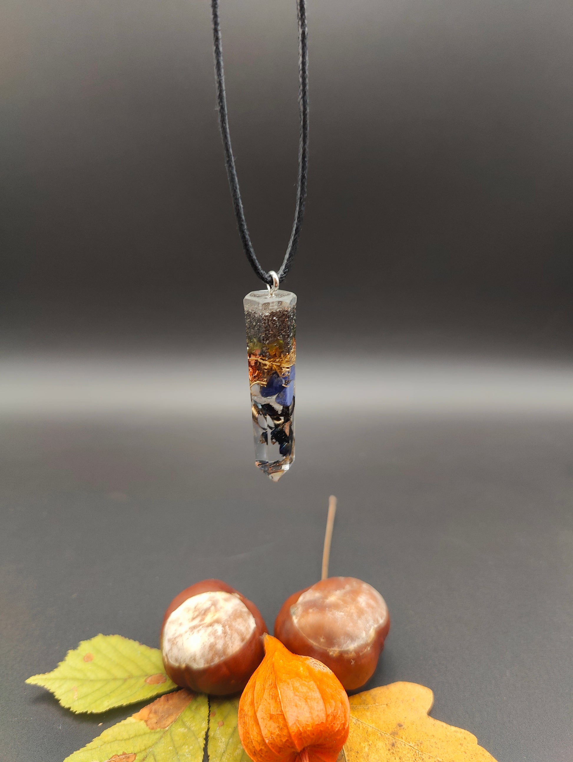 Der Anhänger ist mit einem schwarzen, gewachsten Baumwollband mit verstellbaren Schiebeknoten versehen, um die Länge am Hals beliebig zu variieren.