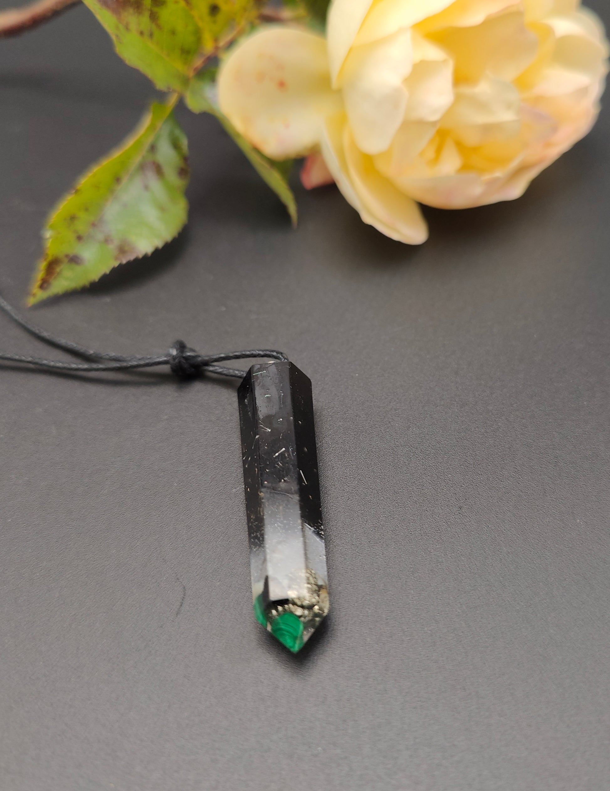 Wunderschöner Anhänger in schwarz mit Malachit, Pyrit, Achat und Bergkristall in der Spitze. In der Farbe ist viel des Schutzsteines Shungit in Pulverform, Kupfer, Messing und Eisen mit eingegossen. Die Länge beträgt ca, 4,5 cm.