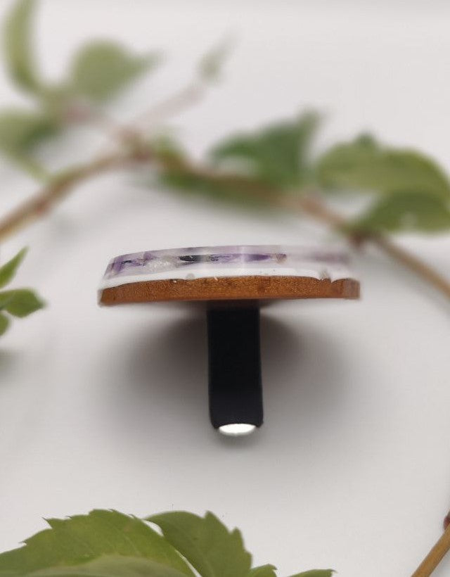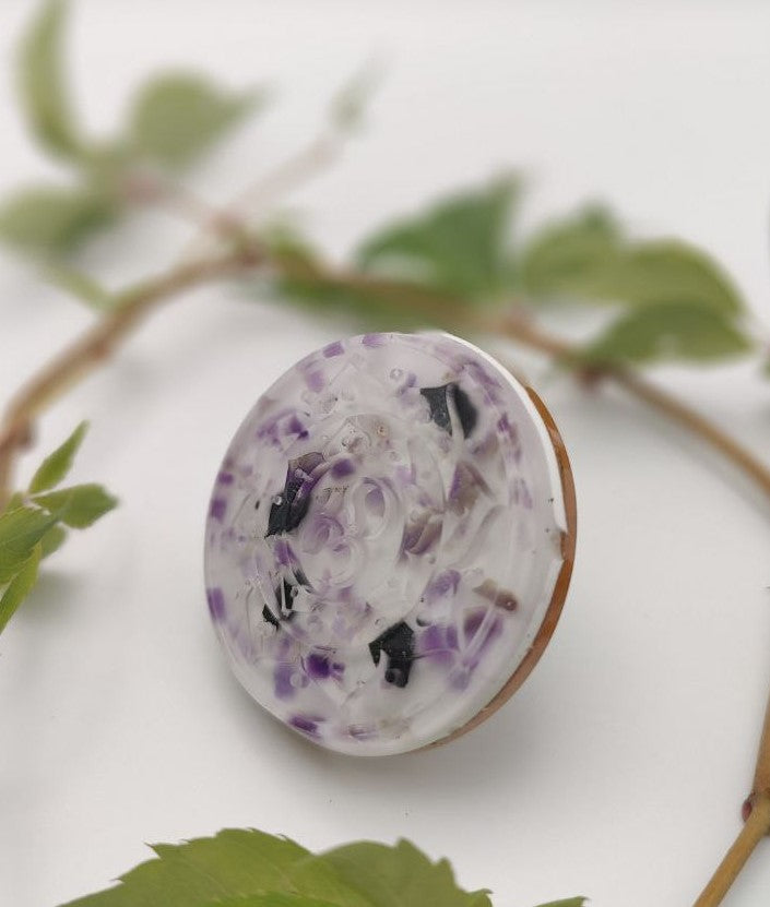 Ein mit klarem Harz gegossenes Om ziert die obere Schicht. Darunter liegen Bergkristall, Amethyst und Shungit. In den Farbschichten befinden sich Eisenoxid, Bergkristallpulver, Agnihotraasche, Kupfer, Messing und Eisen.