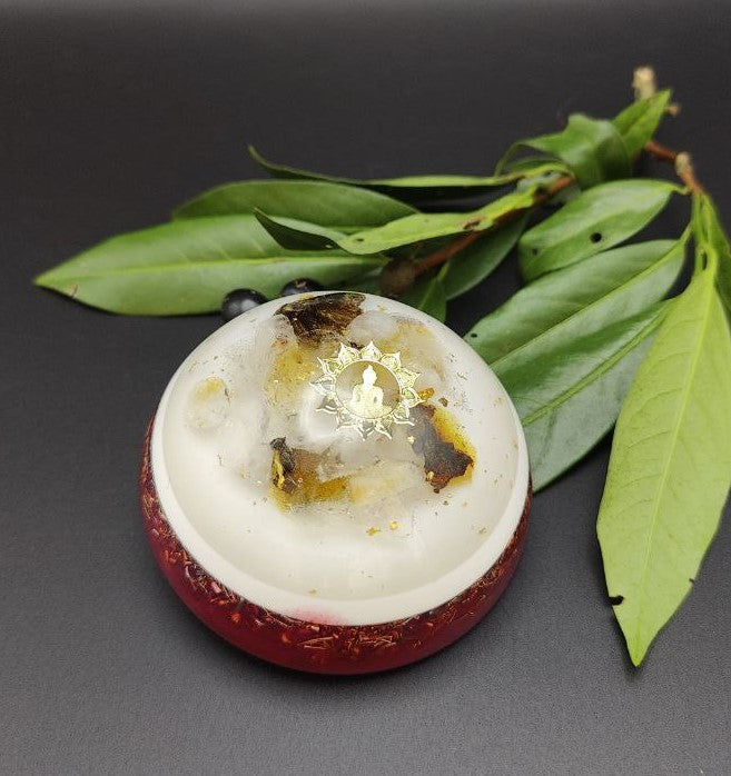 Dieser beispielhafte Chakra-Orgonite für das 1. Chakra enthält Rubin, Rosenquarz, Schneequarz, Amethyst und natürlich Bergkristall, diesen sowohl in Rohstein- als auch Pulverform.
