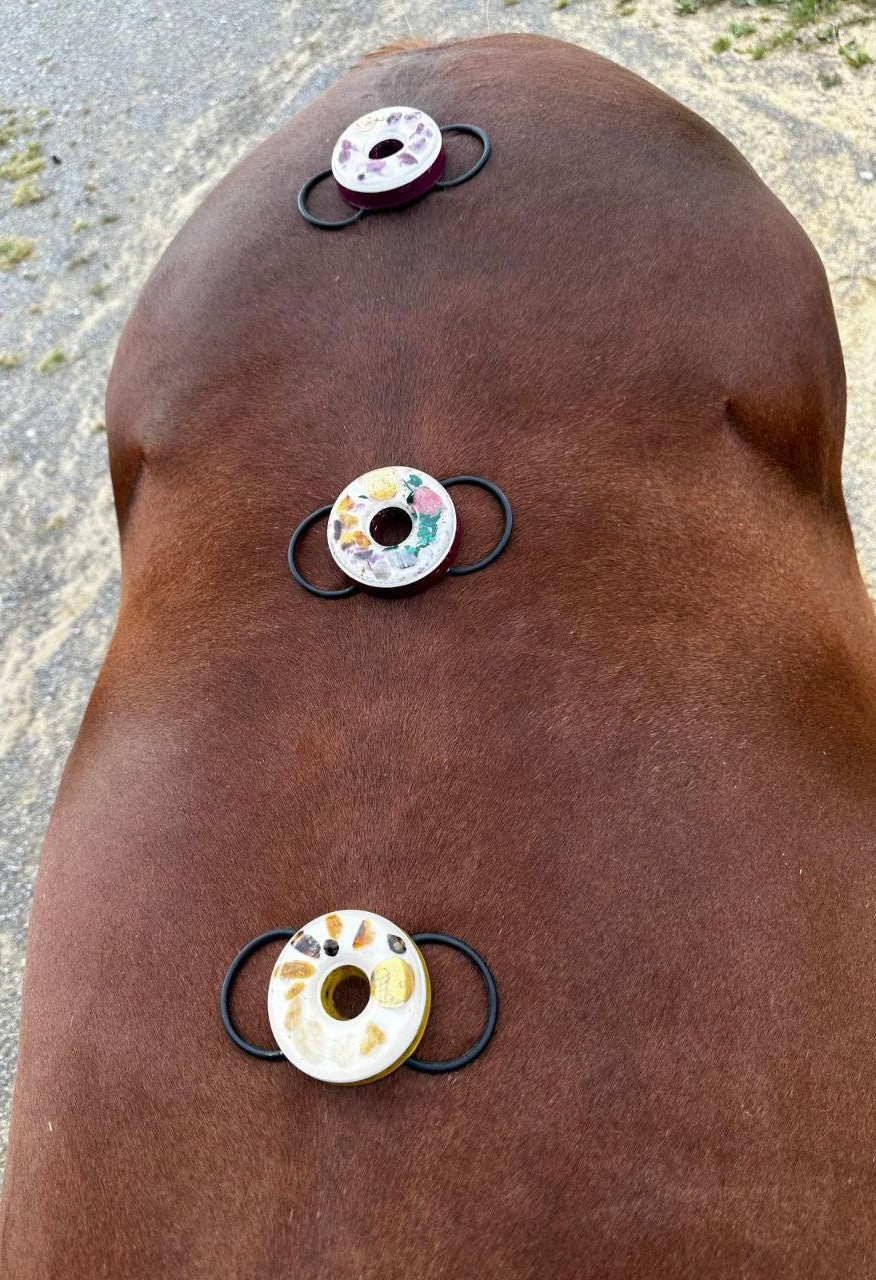 Mithilfe der eingearbeiteten Kautschuk-Ringe können diese Orgonite mit verschiedenen Gurten am Pferd, bzw. auch am Halsband eines Hundes befestigt werden.