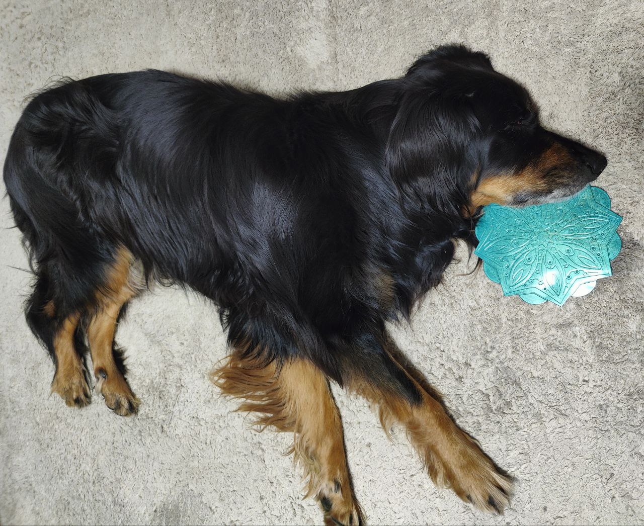 Für Pferde gibt es wunderbare Fuß- oder Halsbänder zur Befestigung, für Hunde liefere ich die Taschenorgonite gelocht mit O-Ring zur Befestigung am Halsband. Oder aber natürlich in Plattenform für das Körbchen.