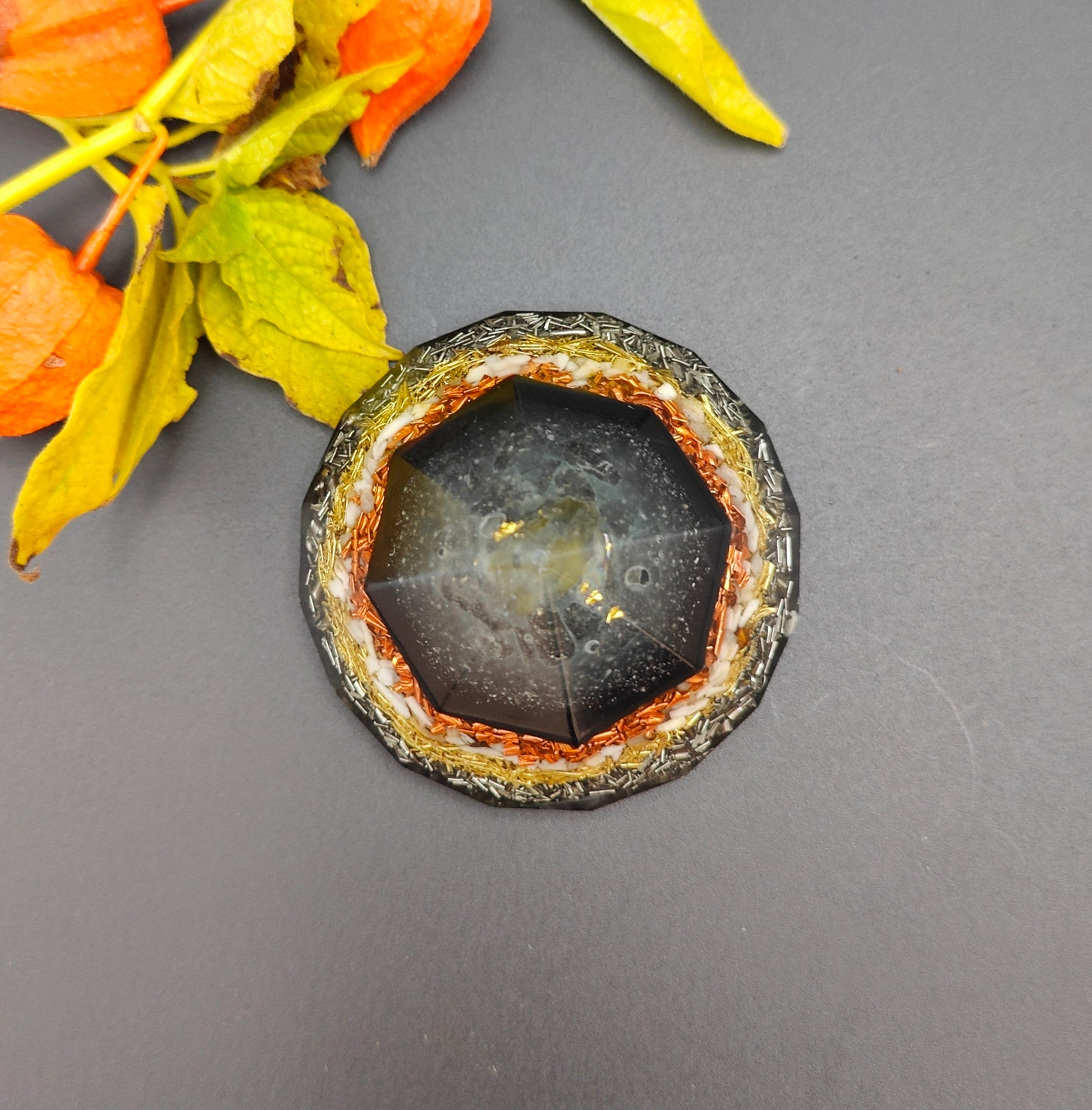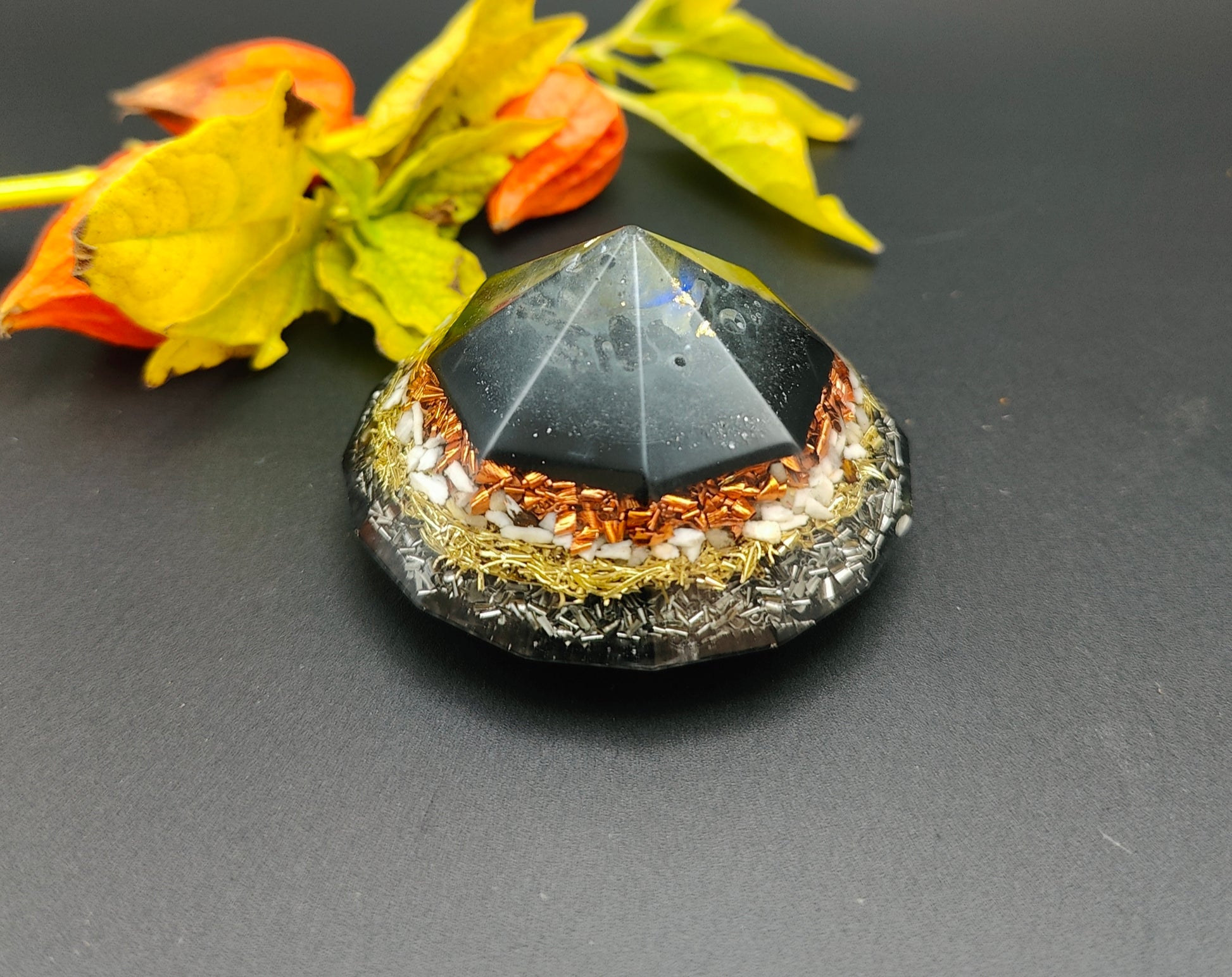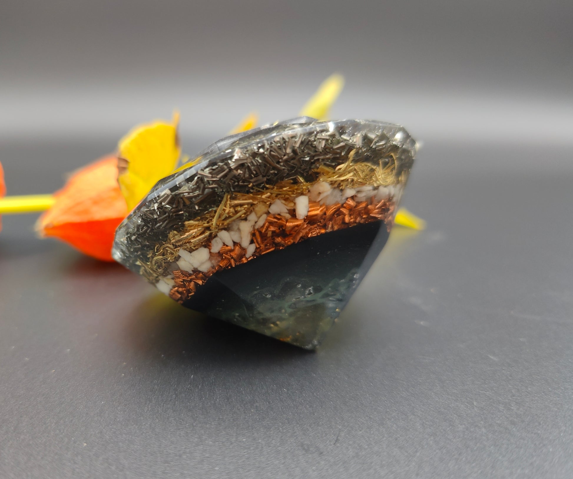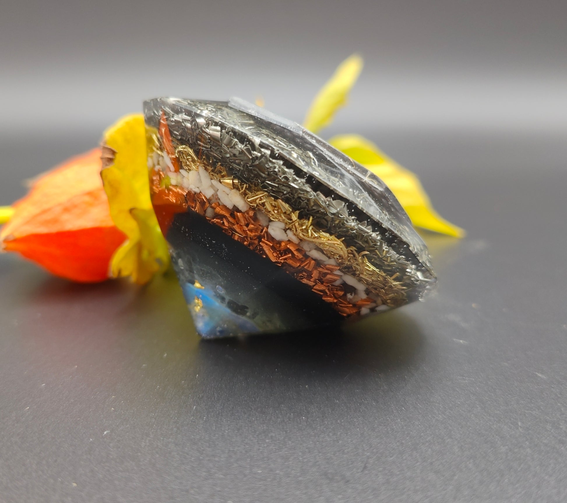 Verbaut sind in dieser ästhetischen und kraftvollen Diamant-Form in der Spitze ein Labradorit, der je nach Lichteinfall seinen Farbglanz zeigt. Darunter liegt Bergkristall, gefolgt in der nächsten Schichten von Shungitpulver, Kupfer, Baryt, Messing, Eisen und Stahl. In den Metallschichten liegt zudem Agnihotraasche.