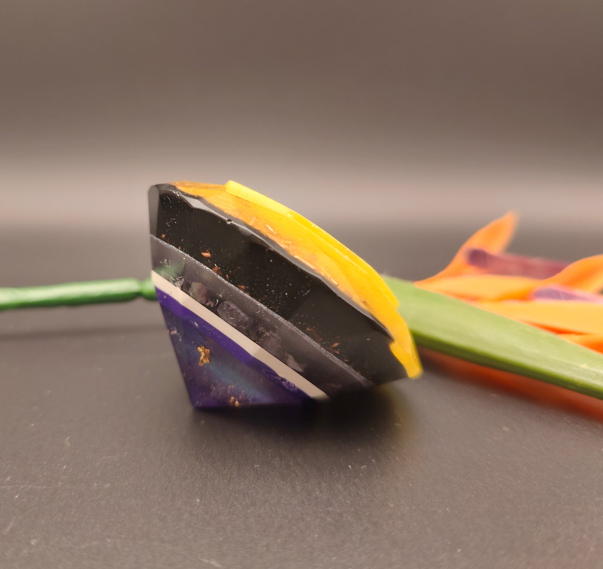 Verbaut sind in dieser ästhetischen und kraftvollen Diamant-Form mit 24K Blattgold in der Spitze, Bergkristallpulver in der weißen Schicht, darunter Amethyst-Steine in der klaren Schicht und Shungit in Pulverform in der schwarzen Schicht. In den Farbschichten finden sich Kupfer, Messing und Eisen, zudem Agnihotraasche.