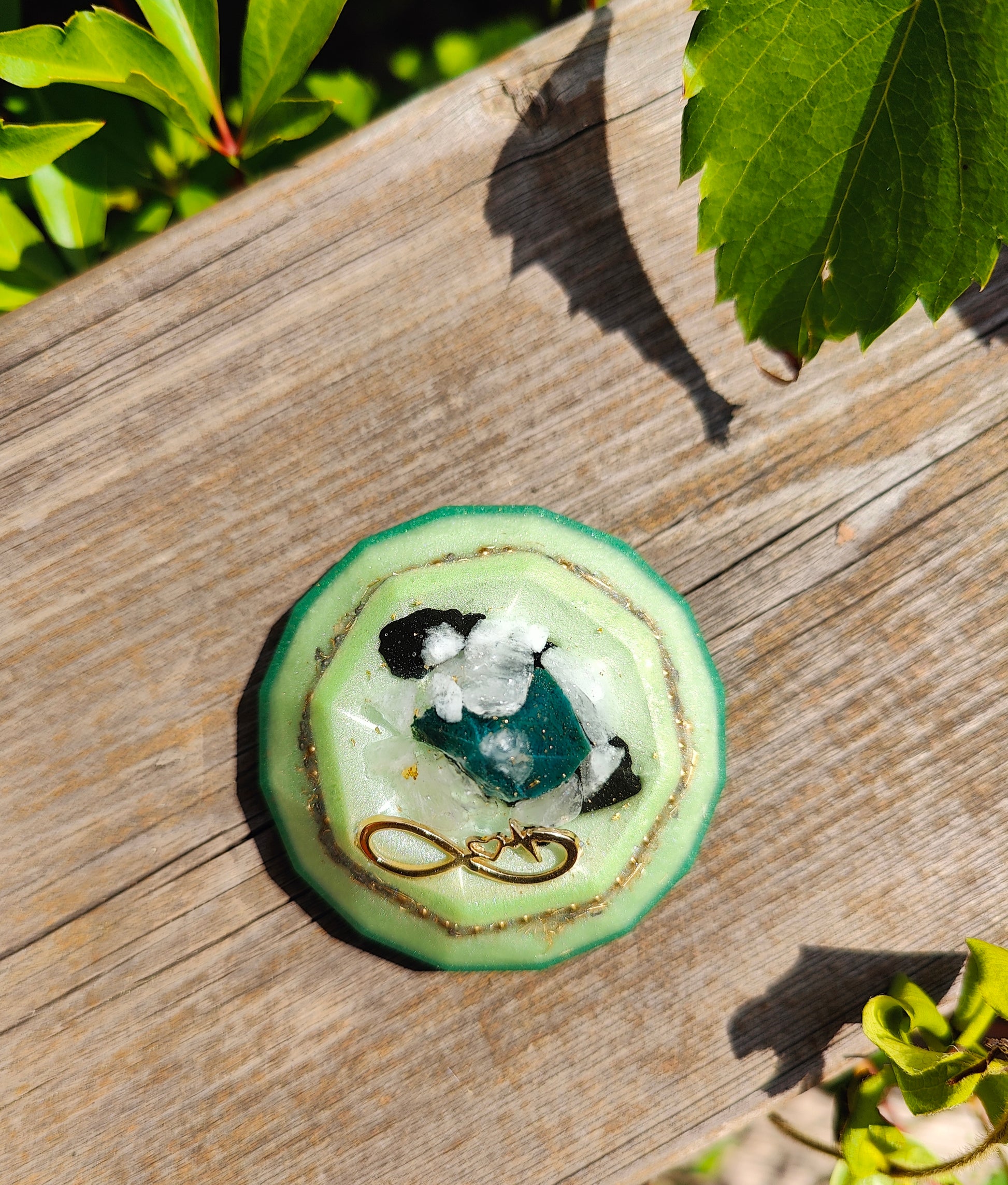 Verbaut sind in dieser ästhetischen und kraftvollen Diamant-Form in der Spitze, neben dem Unendlichkeitszeichen mit Herz und Herzschlag, ein Heliotrop, umringt von Bergkristall, Schneequarz, Shungit und schwarzem Turmalin.
