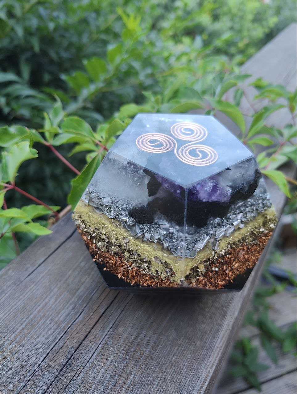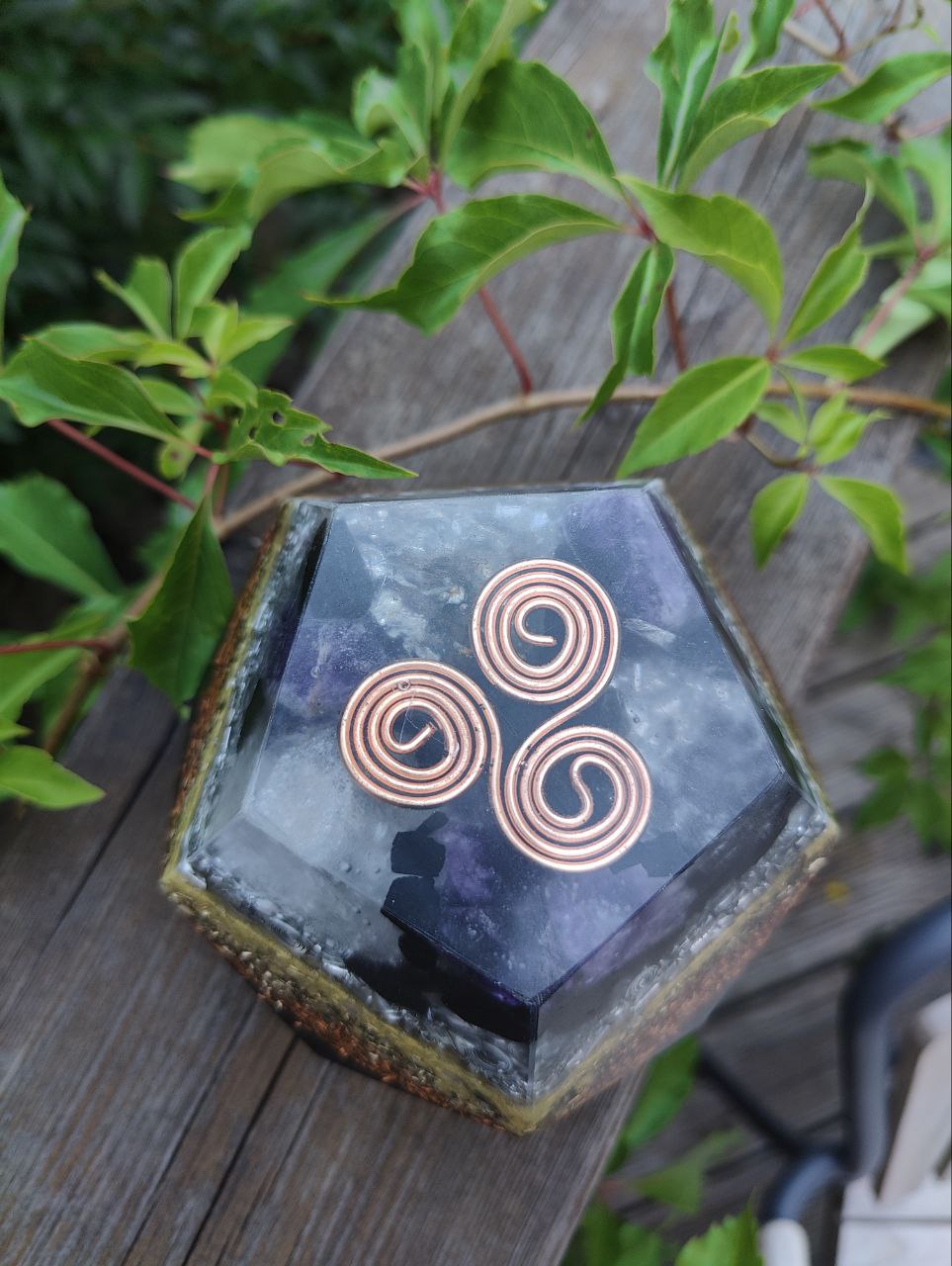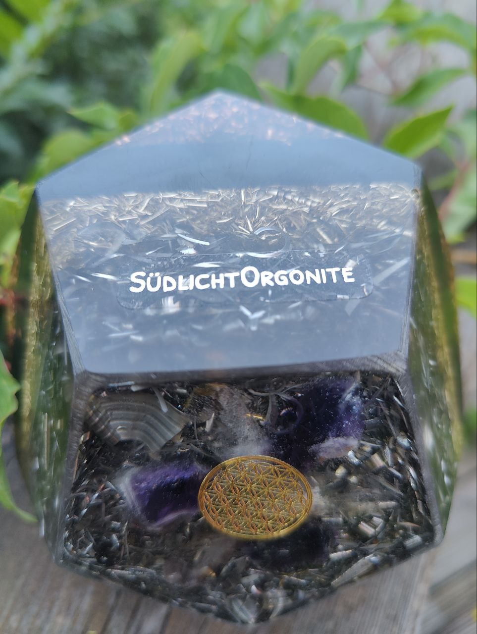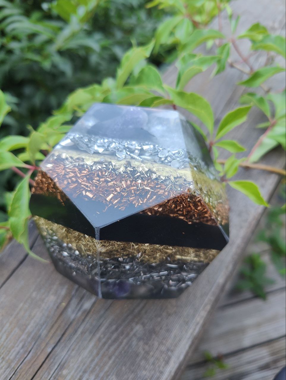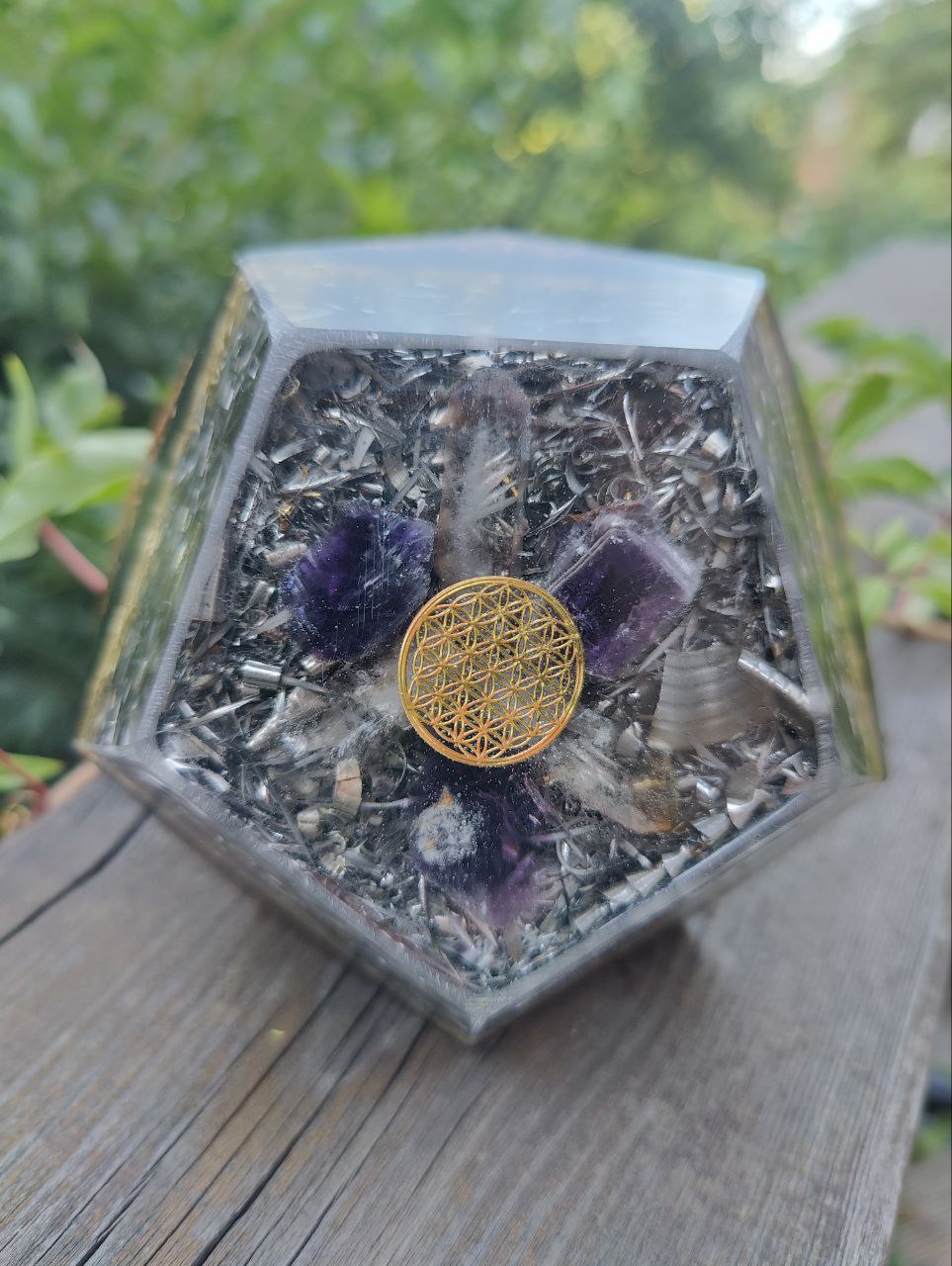 In diesem Dodekaeder ist viel Amethyst verbaut, zudem natürlich Bergkristall, Shungit und Shungitpulver, außerdem Agnithotraasche, Kupfer, Messing, Aluminium, Bronze und Eisen.