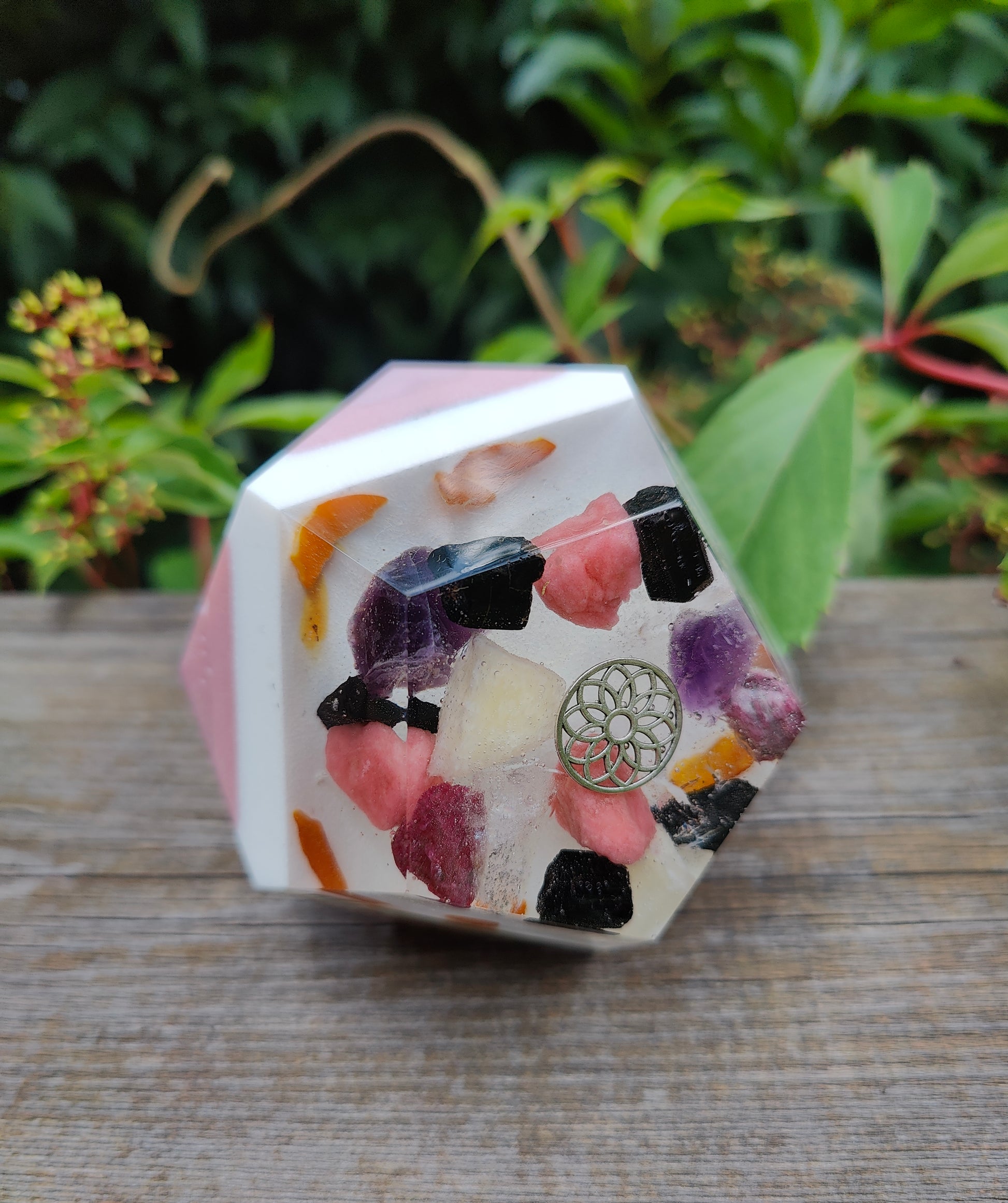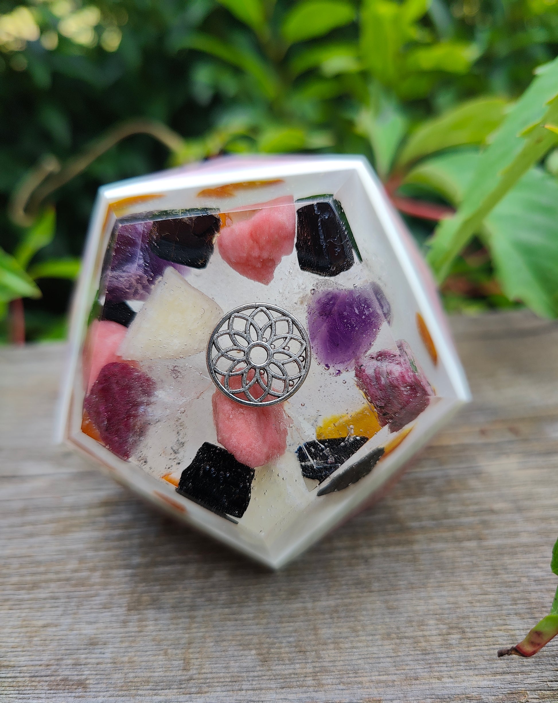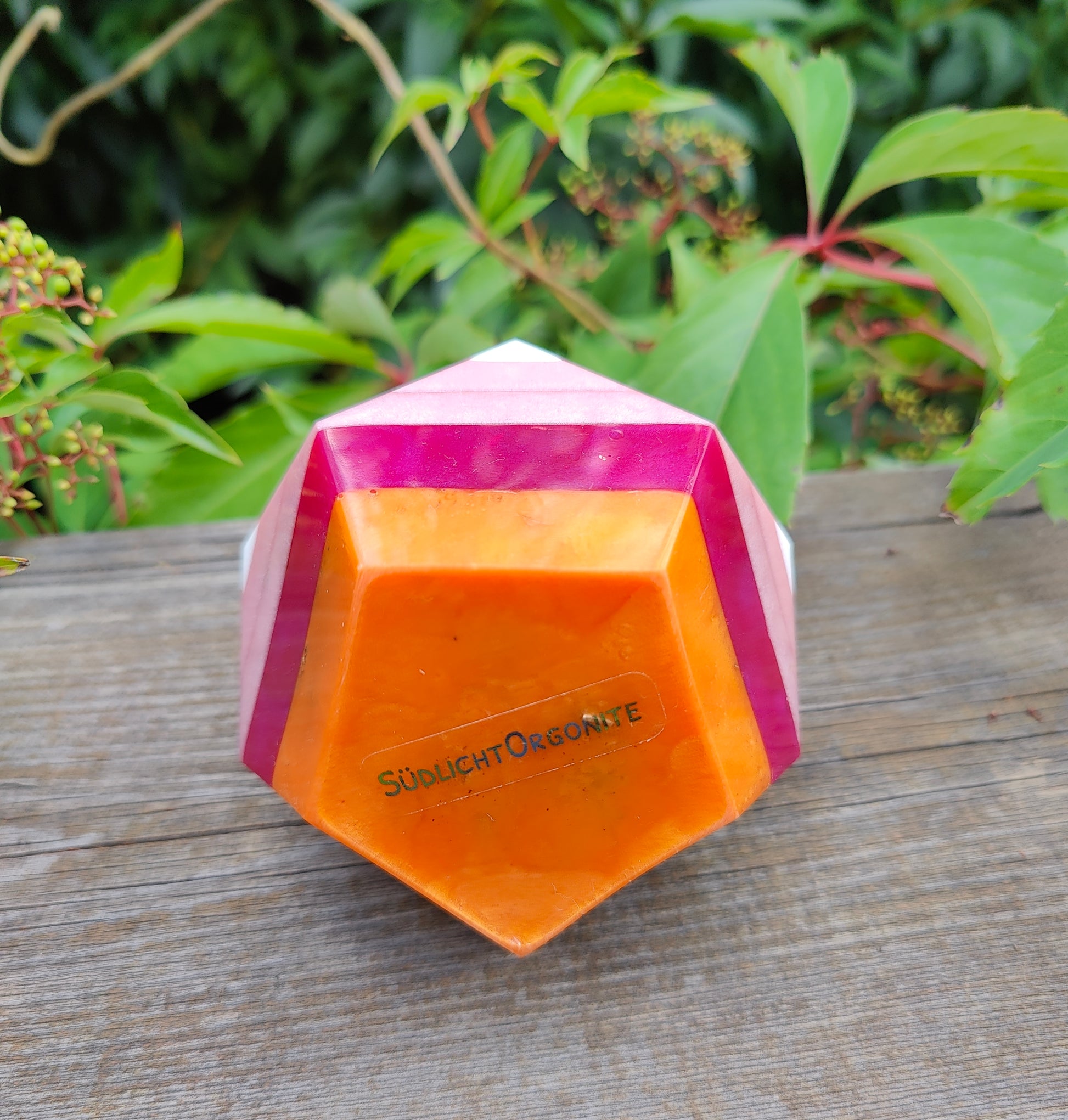In diesem Dodekaeder sind Bergkristall, Bernstein, Amethyst, Rubin, Calcit, Thulit, Shungit und schwarzer Turmalin in der klaren Schicht verbaut. In der weißen Schicht sind Eisenoxid und Bergkristallpulver enthalten, in den schön bunten Farbschichten befinden sich zudem Agnithotraasche, Kupfer, Messing und Eisen.