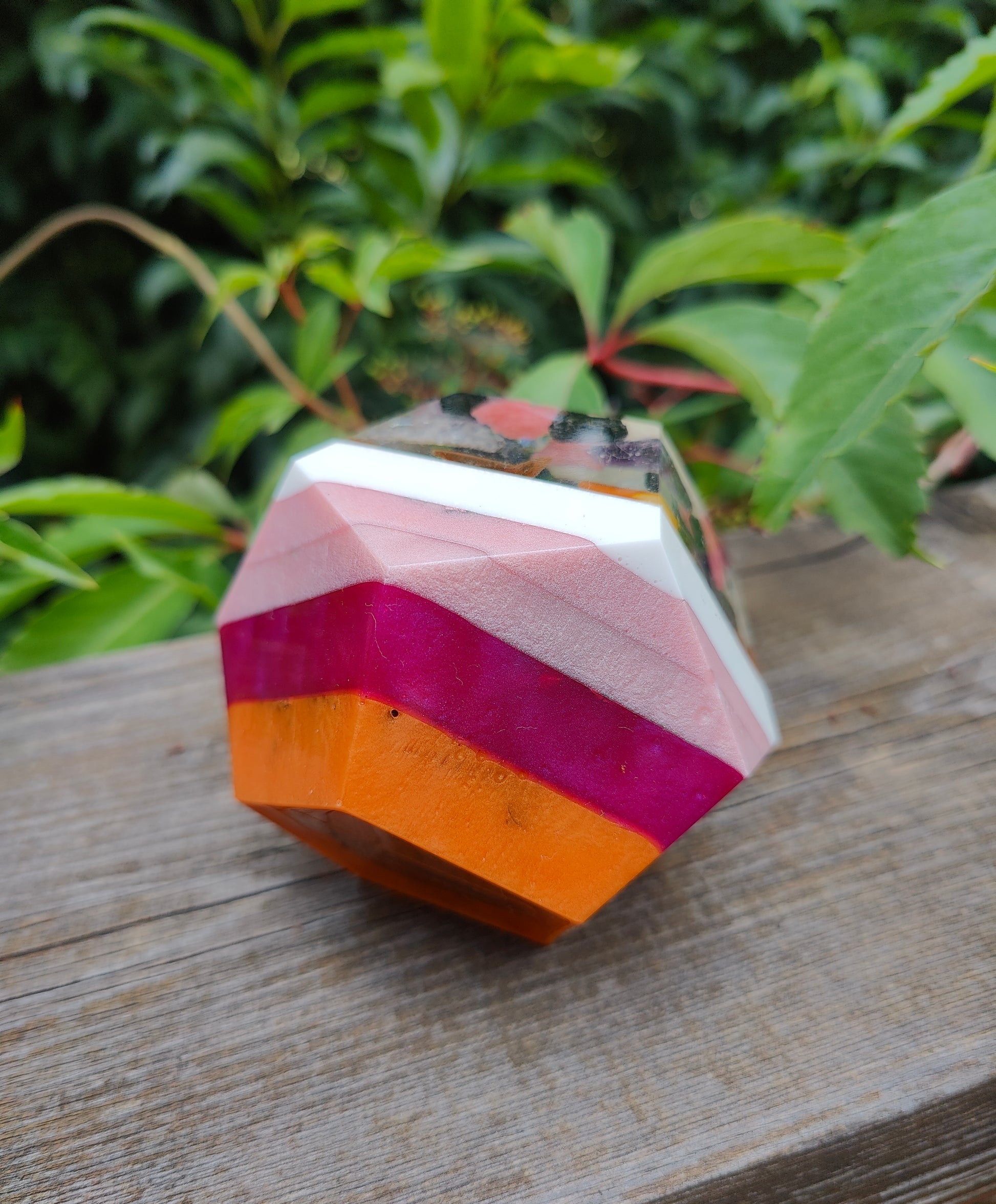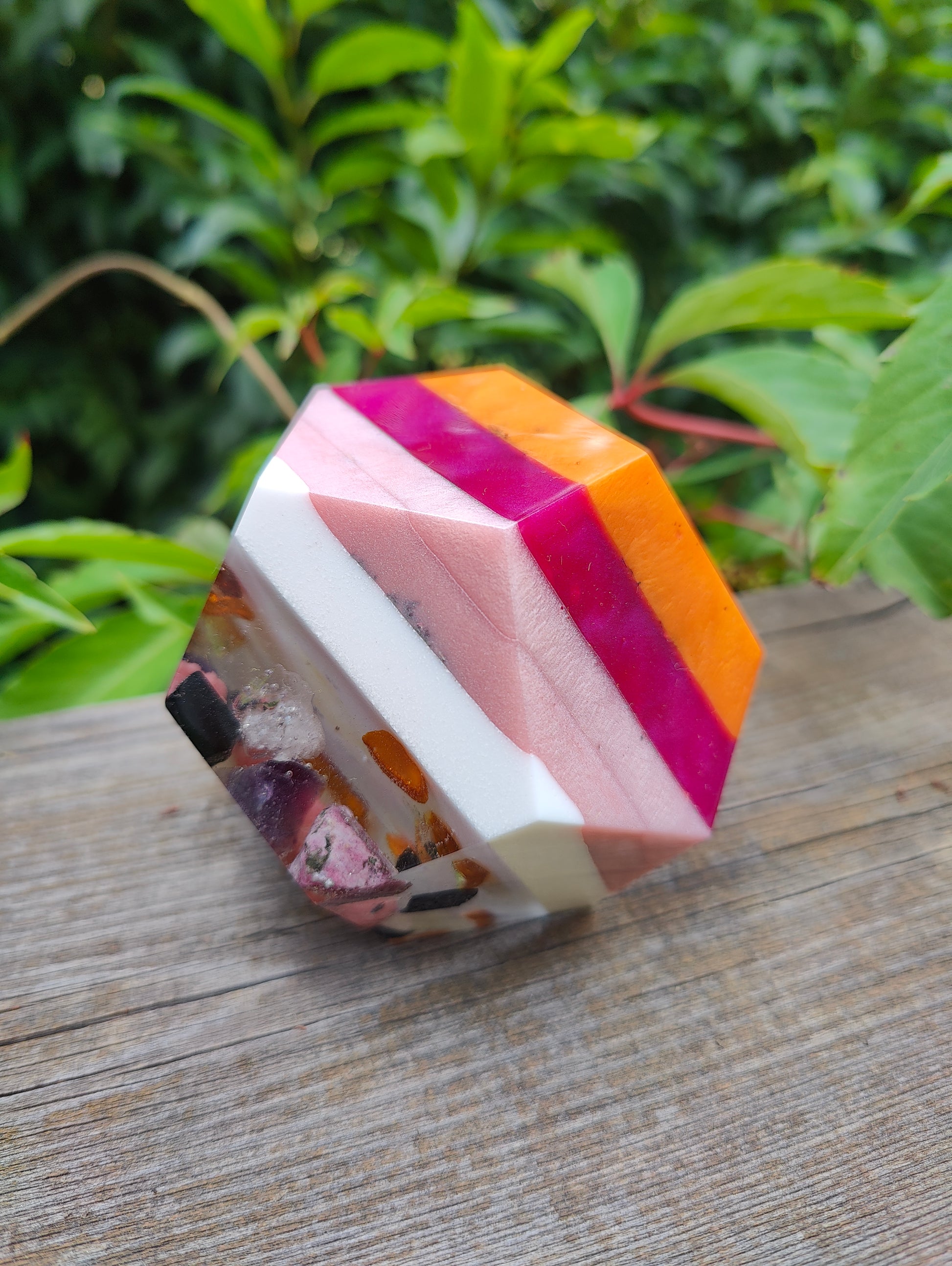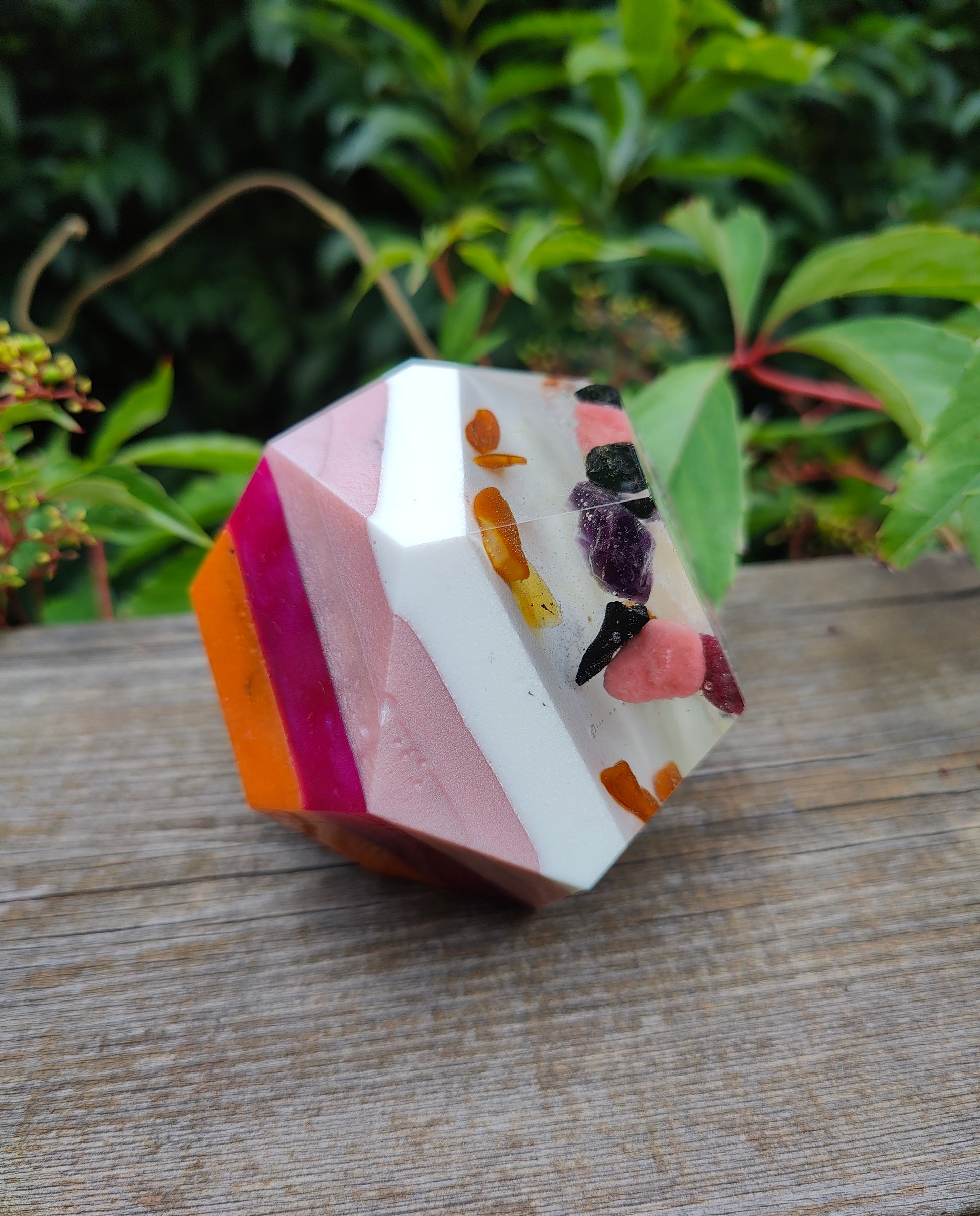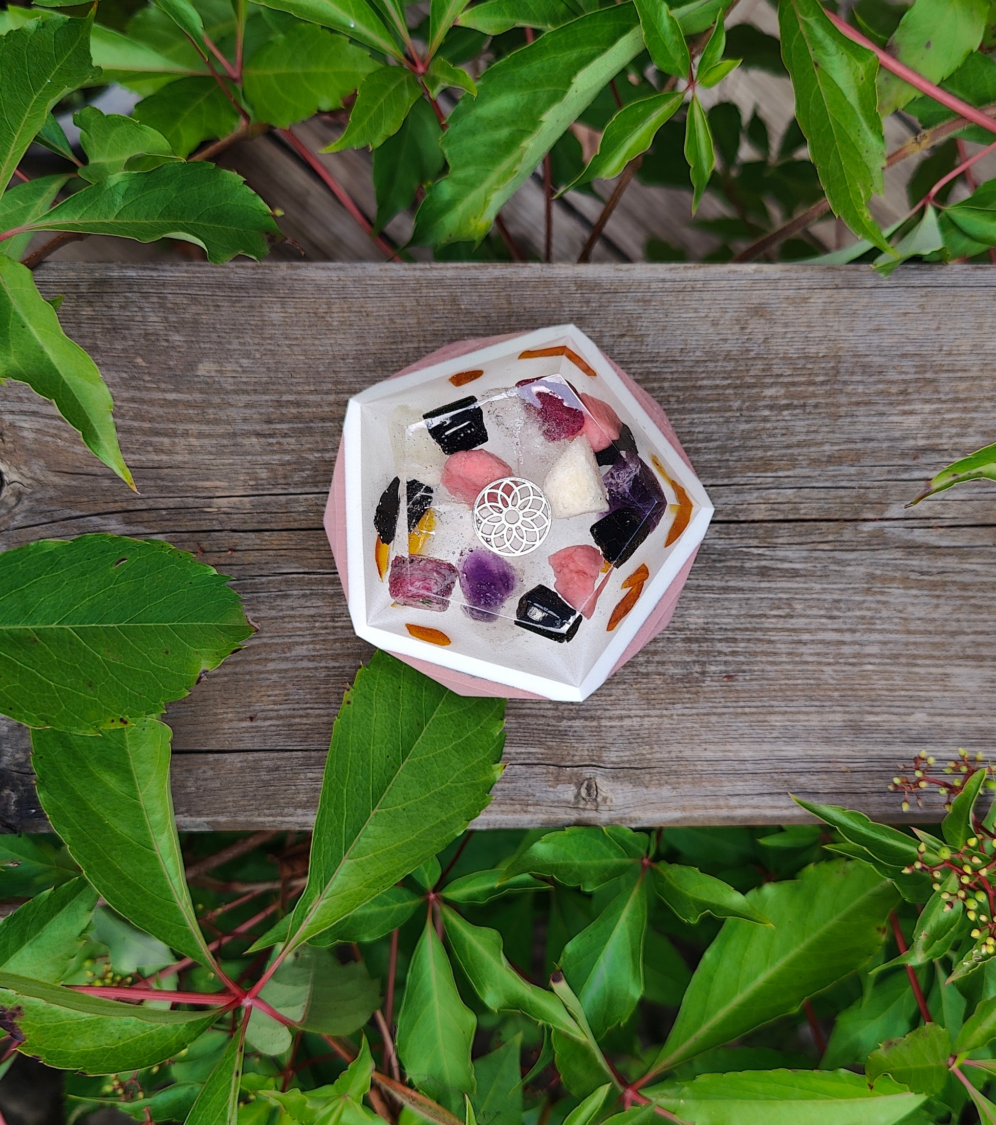 In diesem Dodekaeder sind Bergkristall, Bernstein, Amethyst, Rubin, Calcit, Thulit, Shungit und schwarzer Turmalin in der klaren Schicht verbaut. In der weißen Schicht sind Eisenoxid und Bergkristallpulver enthalten, in den schön bunten Farbschichten befinden sich zudem Agnithotraasche, Kupfer, Messing und Eisen.