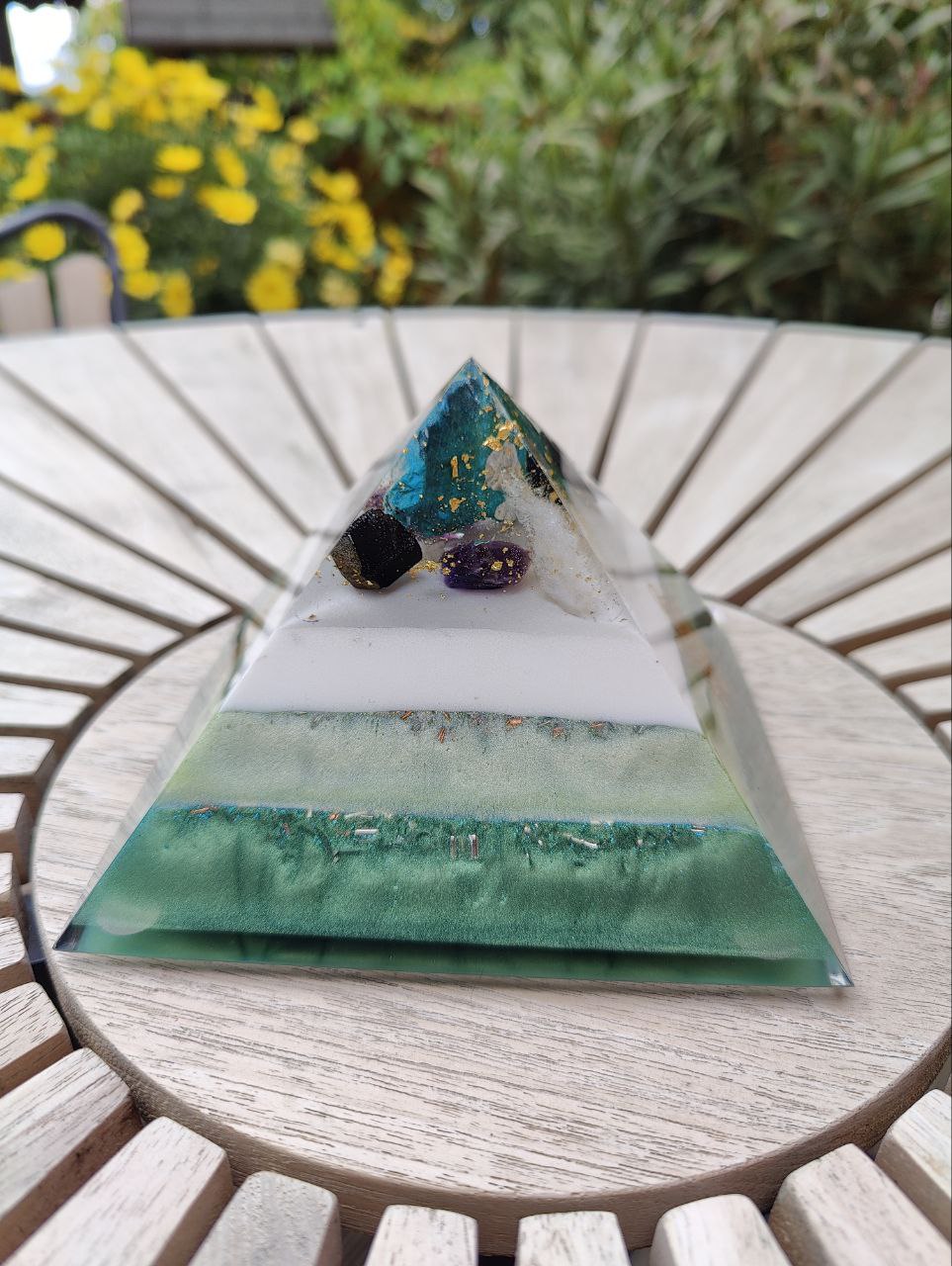 Gefüllt ist die Schöne in den Farbschichten mit Eisen, Eisenoxid, Eisengranulat, Messing, Kupfer und Agnihotraasche, wie immer in Epoxitharz gehüllt.