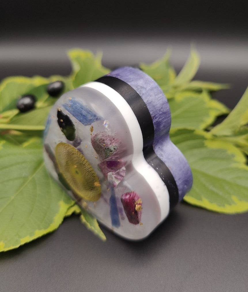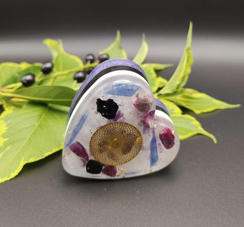 Dieses Herz enthält im oberen Bereich Cyanit, Rubin, Schneequarz, Turmalin, Bergkristall, und 24K Blattgold. Eine Torus-Metall-Aufkleber ziert diesen Bereich.