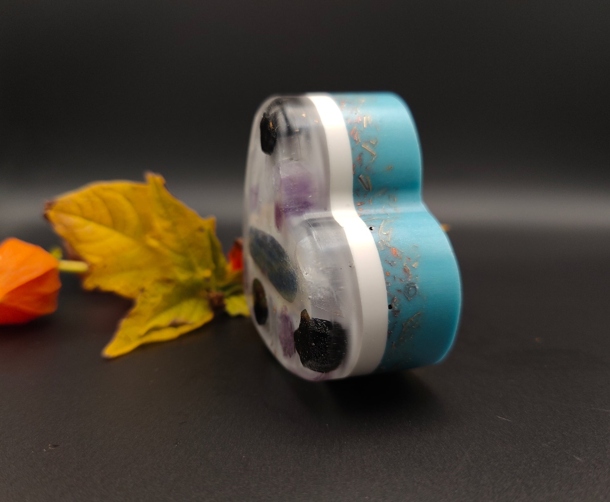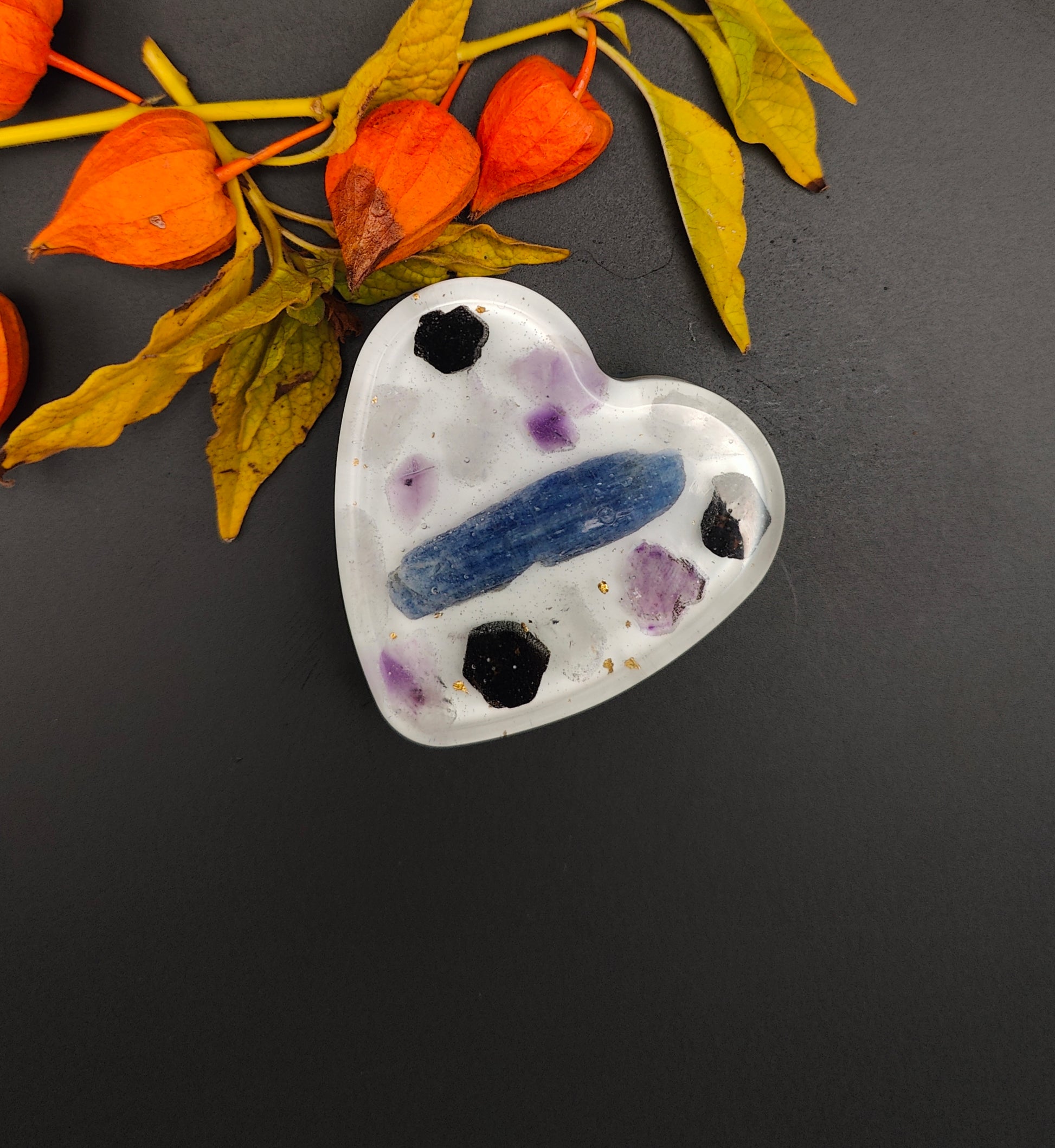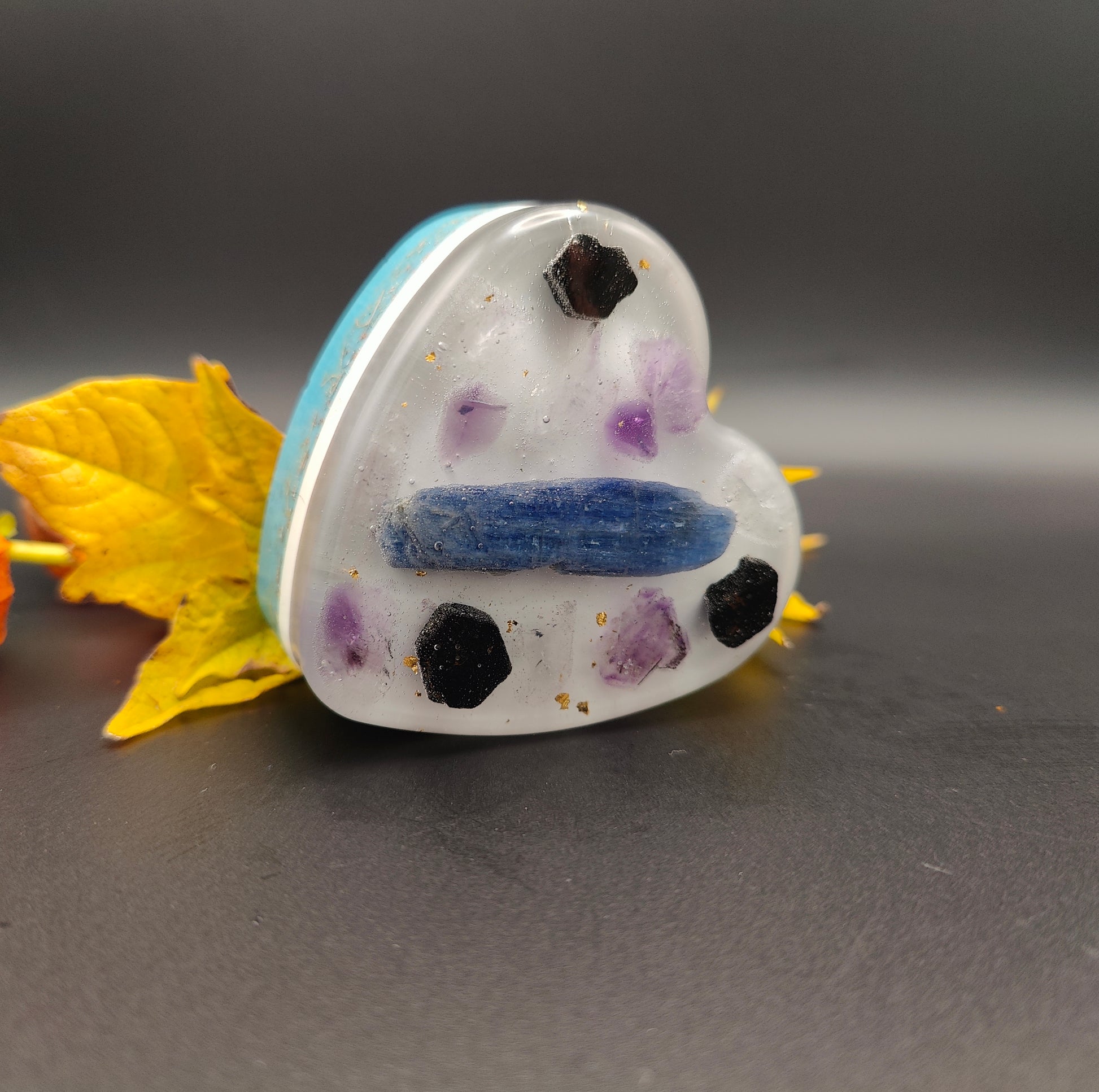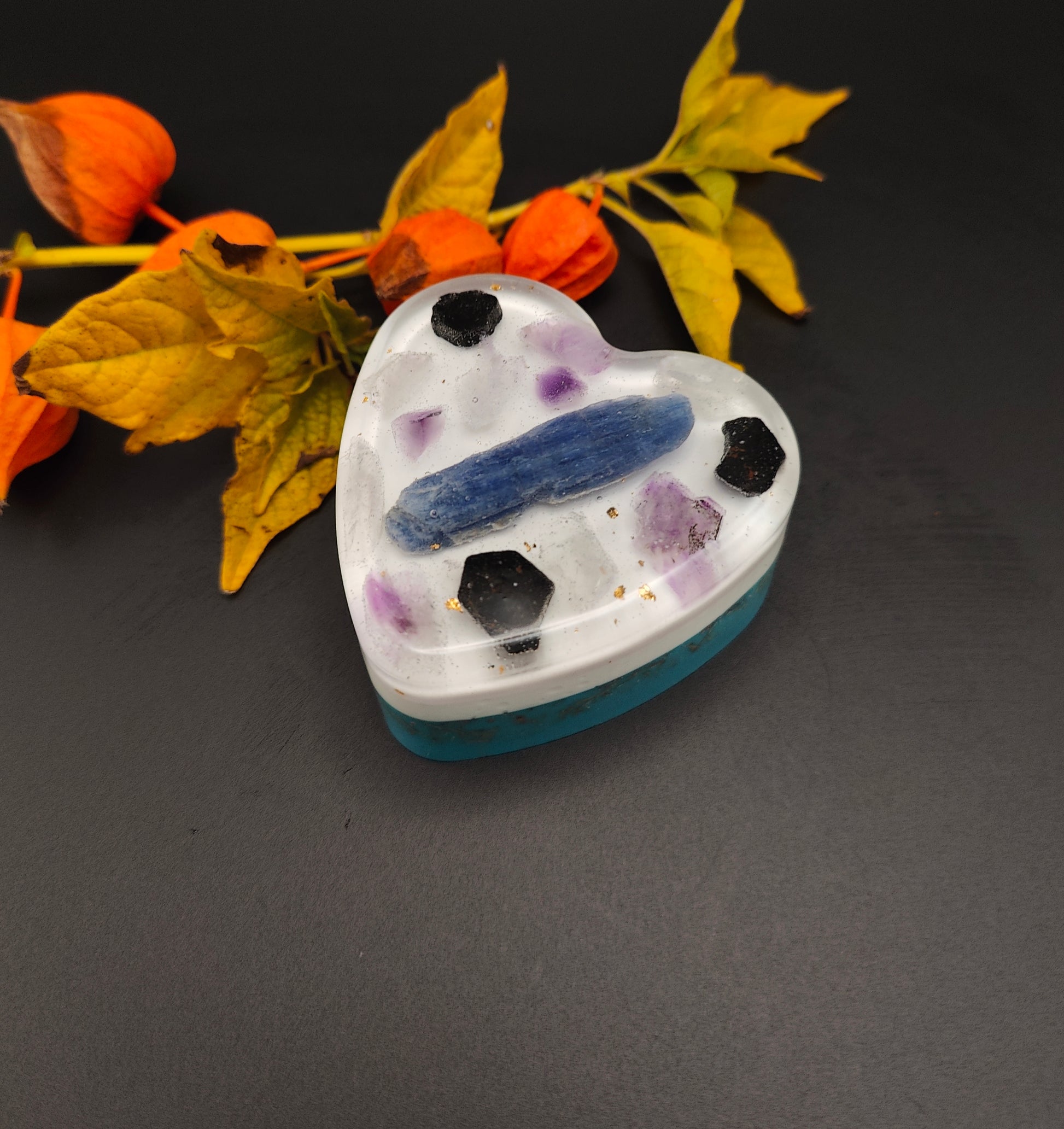 Dieses Herz enthält im oberen Bereich Cyanit, Amethyst, Turmalin, Bergkristall und 24K Blattgold. Bergkristall als Pulver ist zudem in der weißen Schicht.