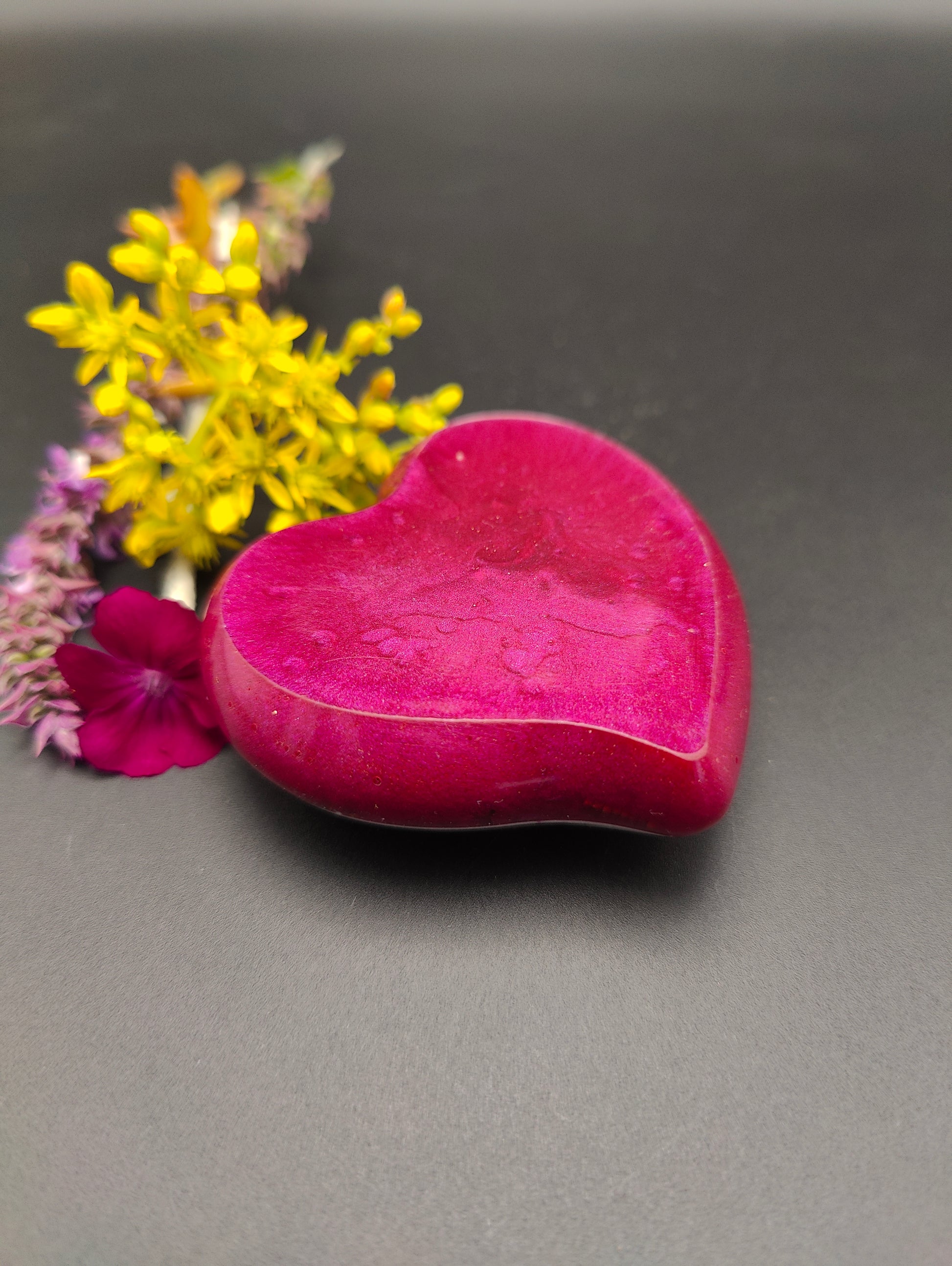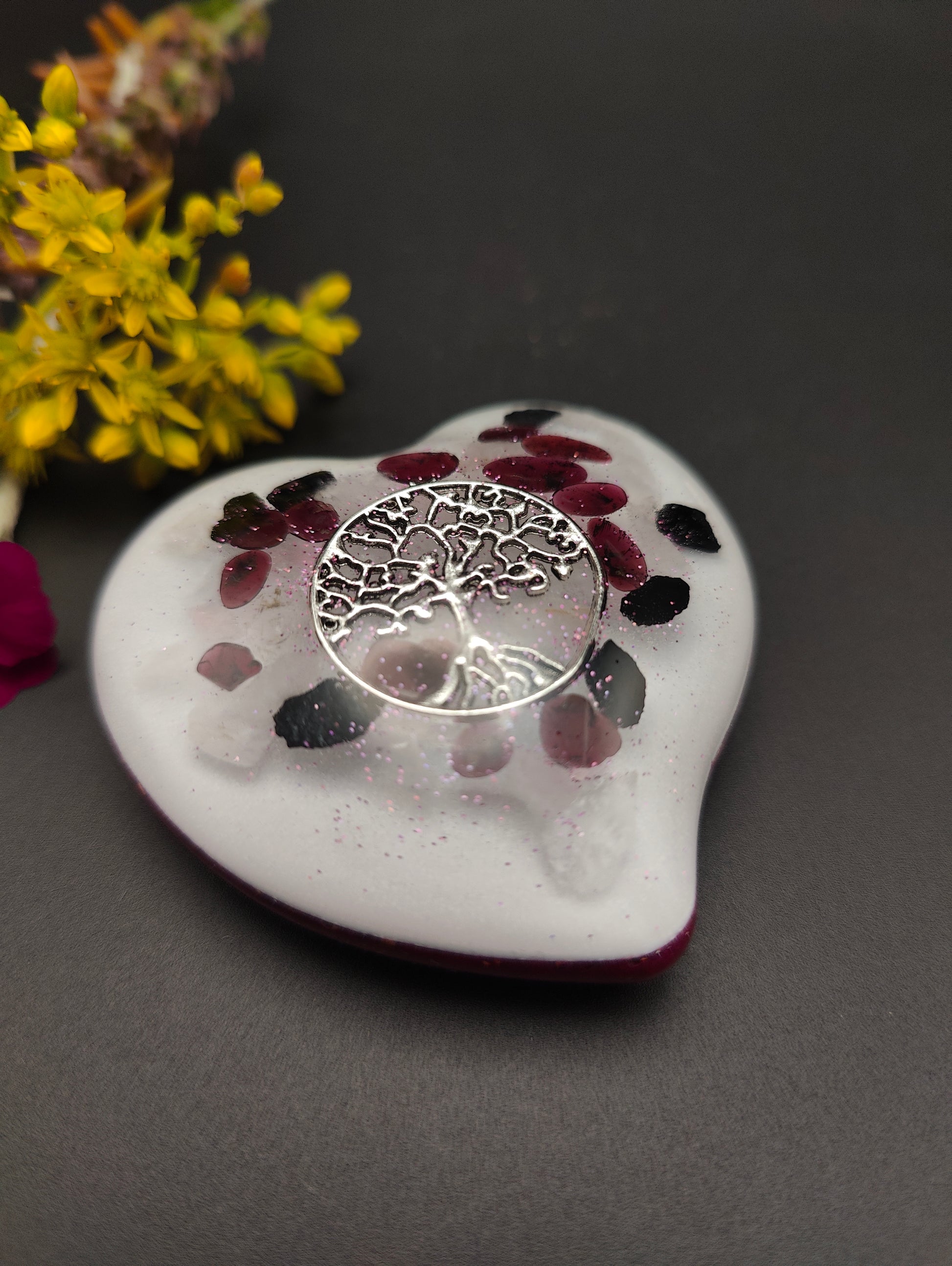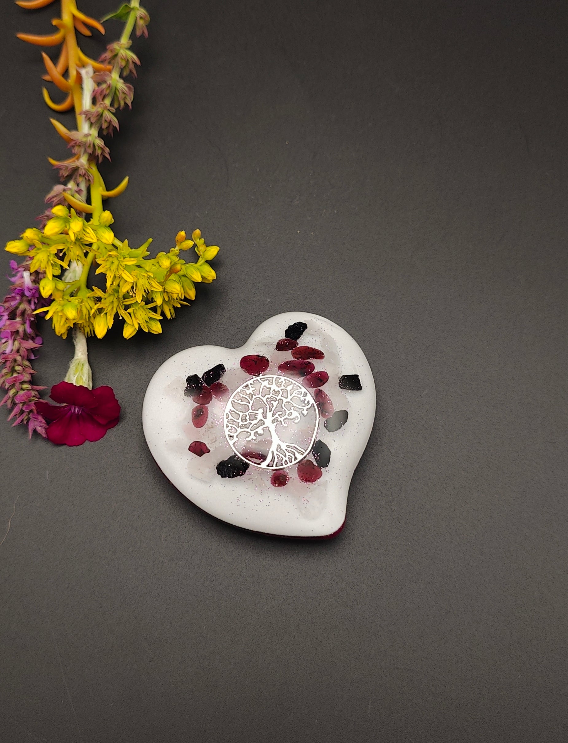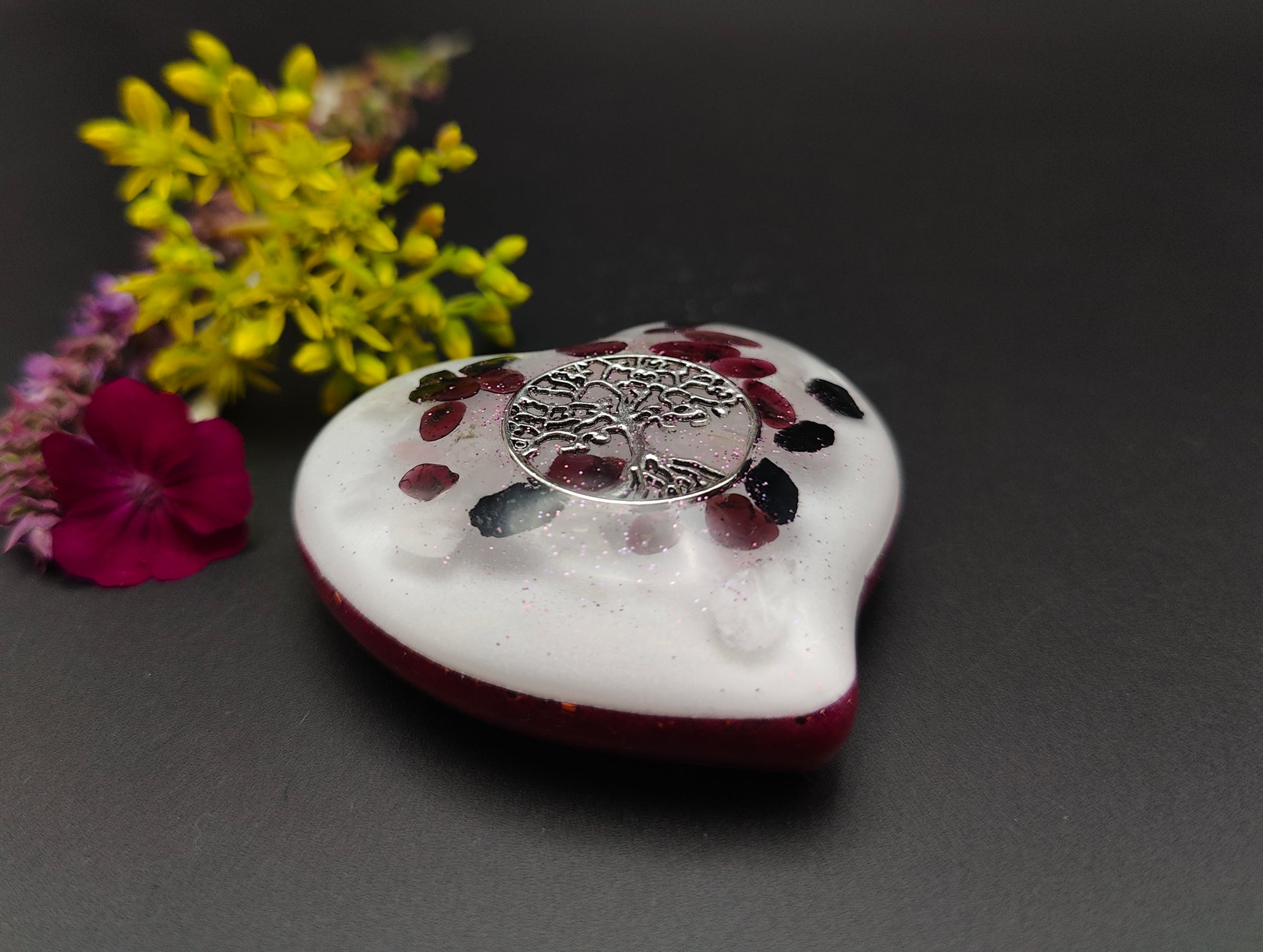 Dieses Herz enthält im oberen Bereich Granat, Rosenquarz, schwarzer Turmalin, Bergkristall und einen Baum des Lebens aus Metall. In dieser klaren Schicht ist zudem ein wenig Glitzer in Pink eingearbeitet.