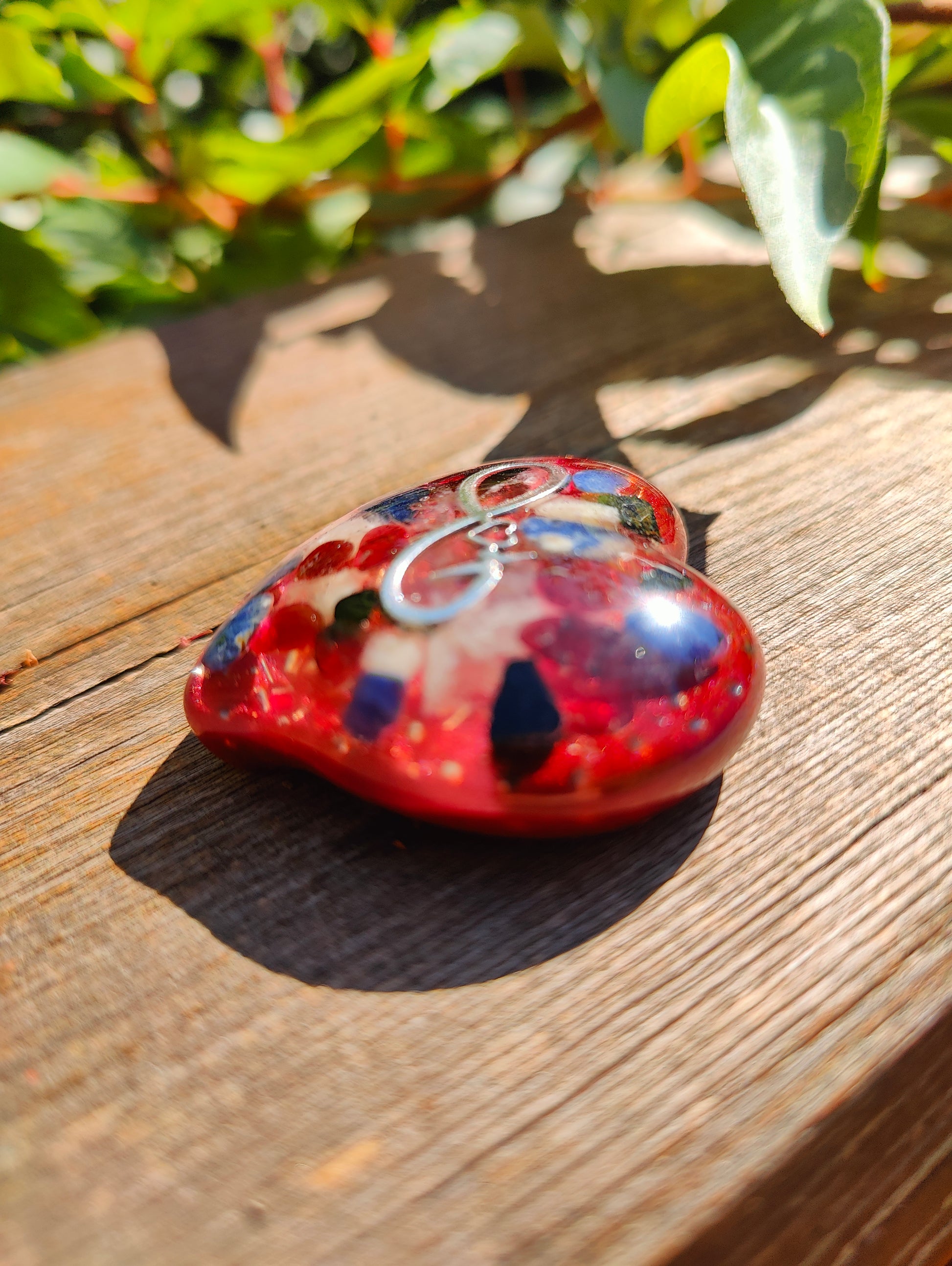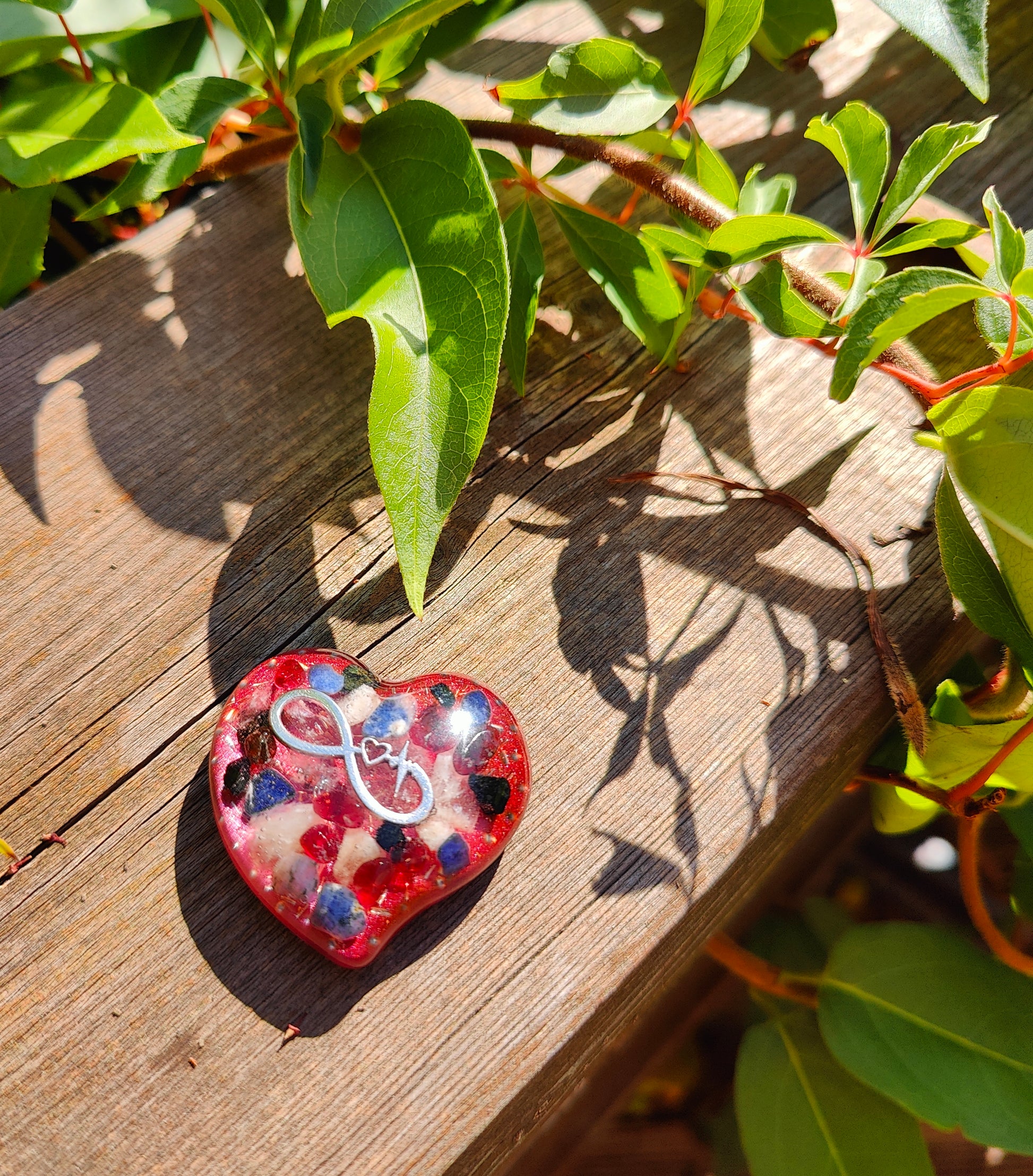 Dieses Herz enthält im oberen Bereich Bergkristall, Granat, Calcit, Sodalith, schwarzer Turmalin, Shungit und ein Unendlichkeitezeichen mit Herz und Herzschlag aus Metall.