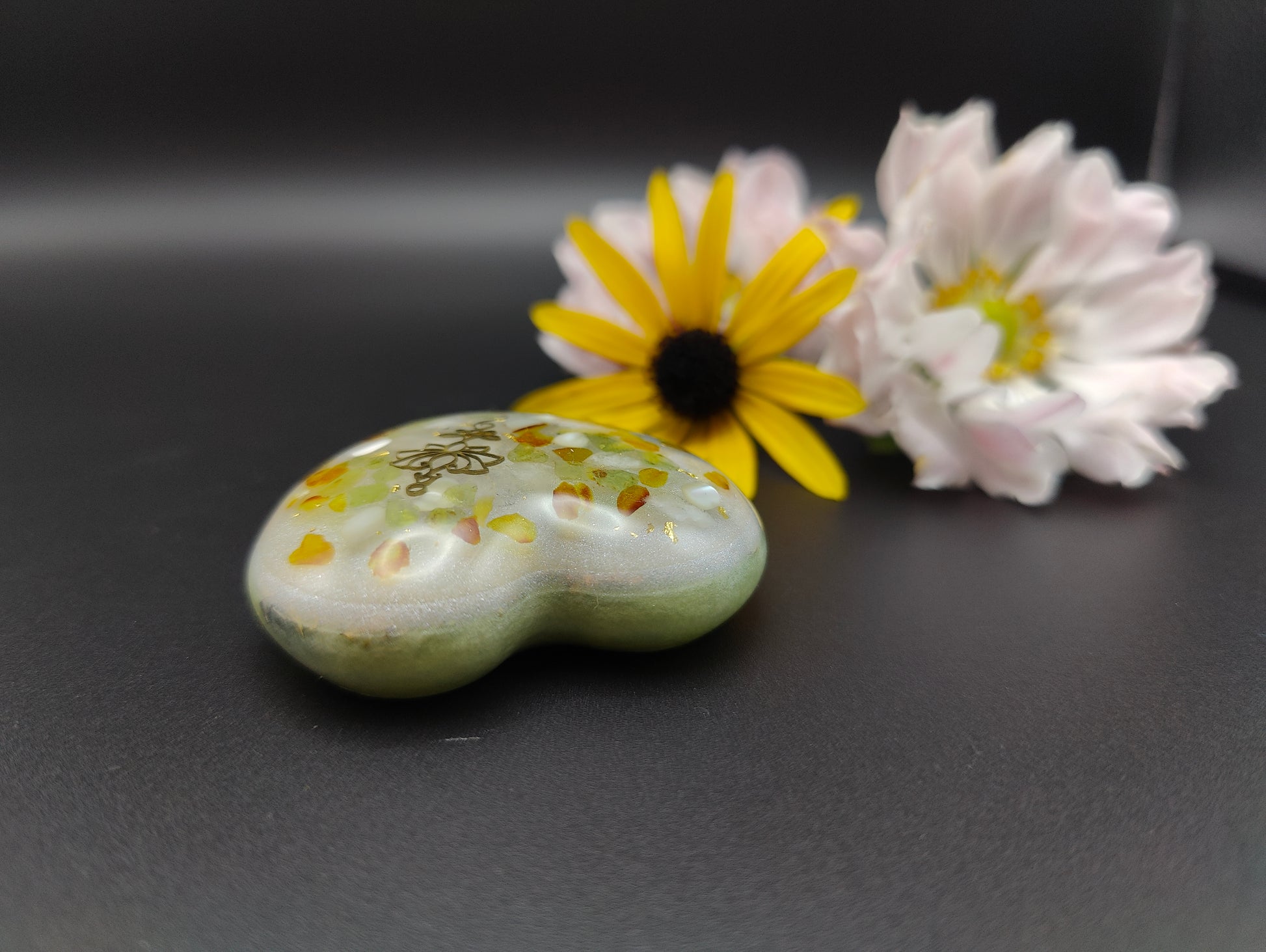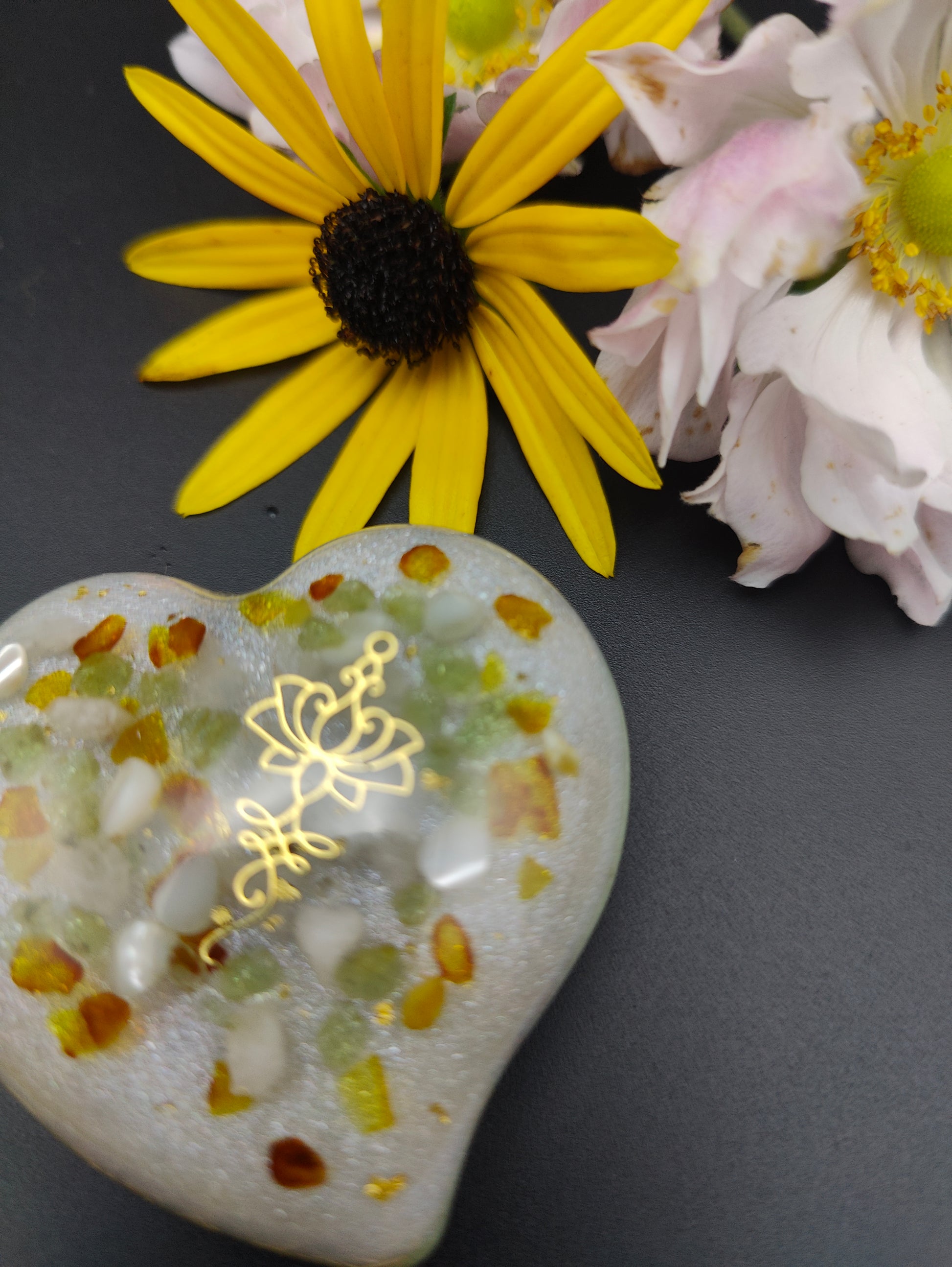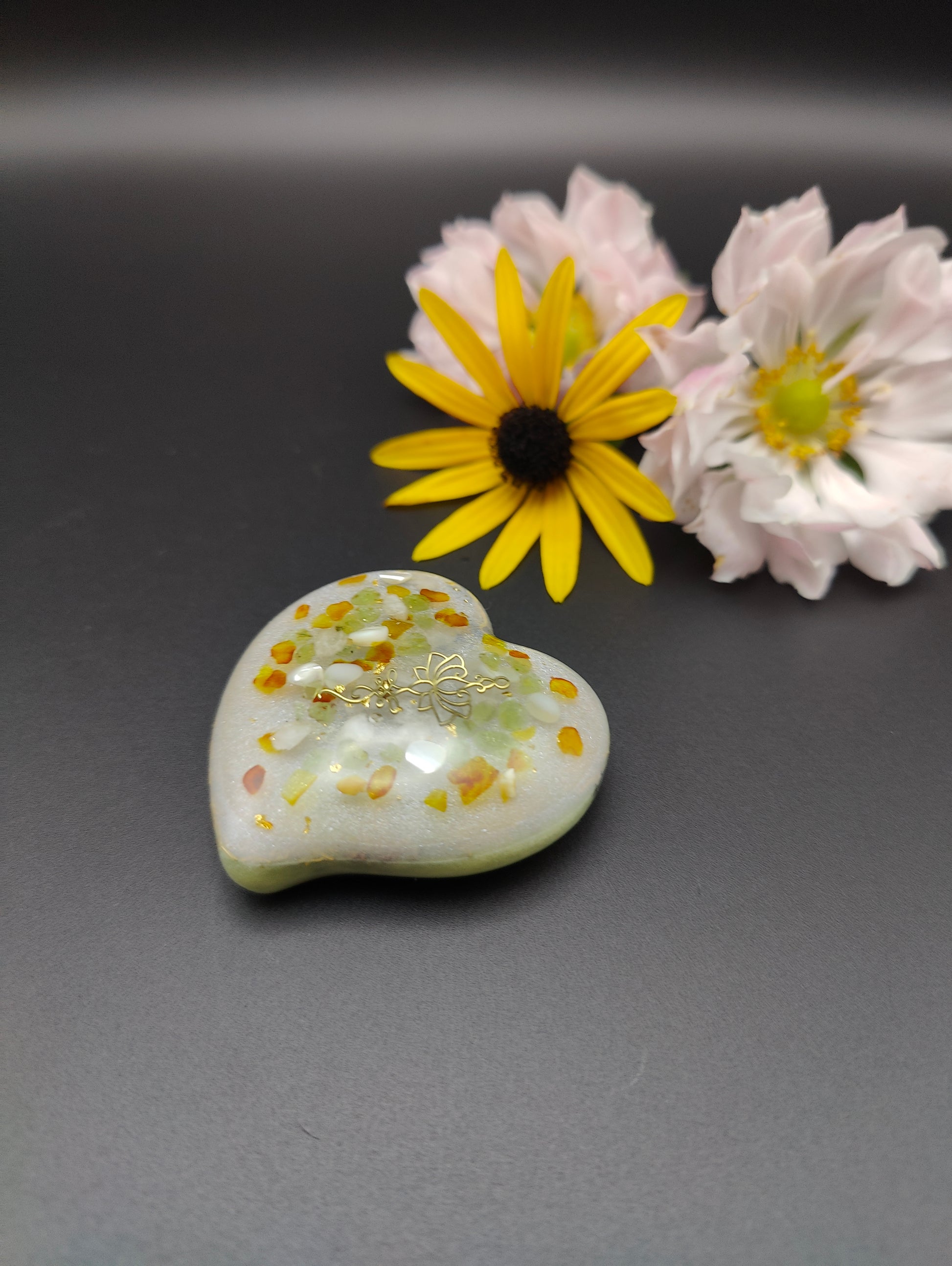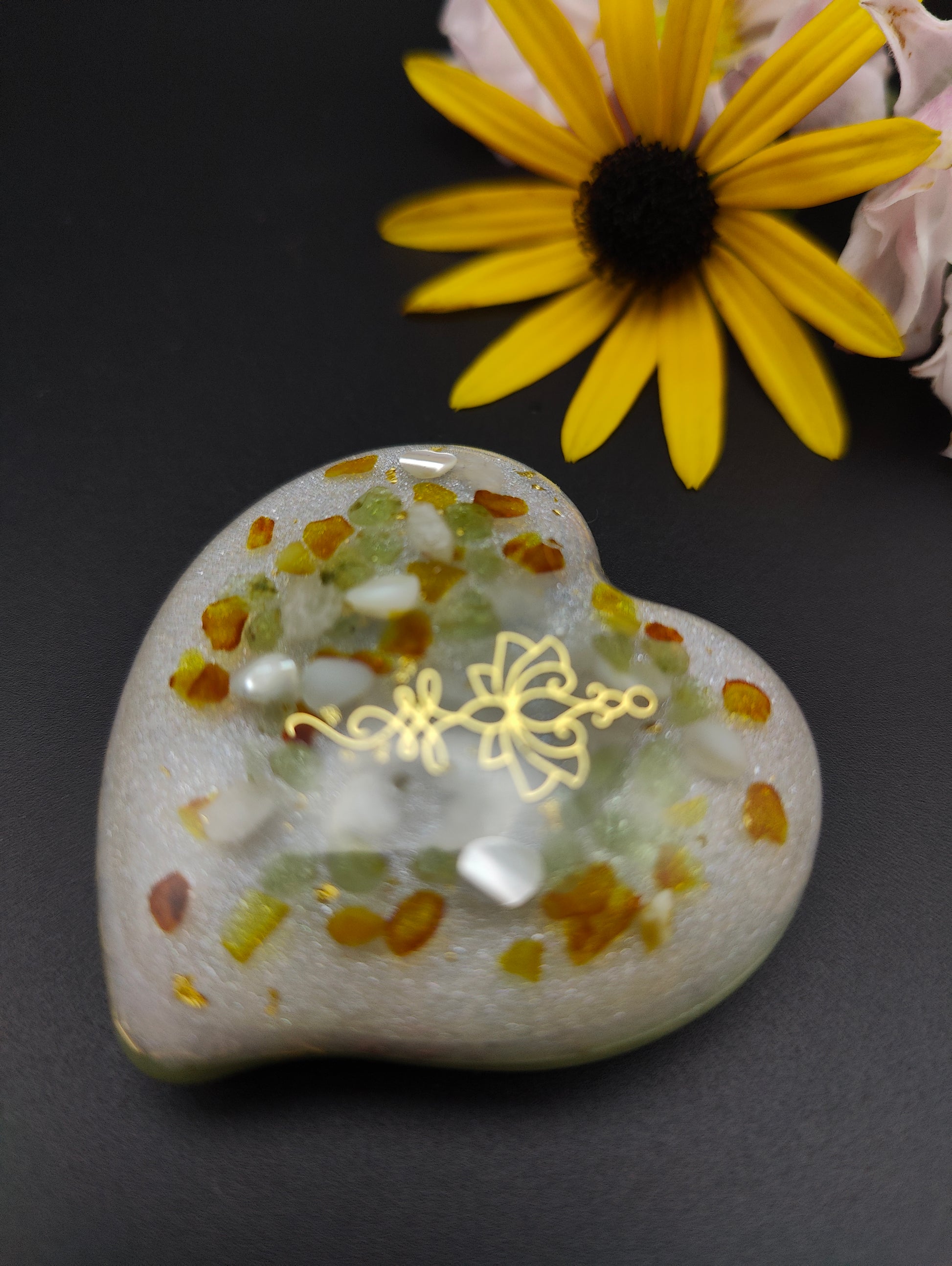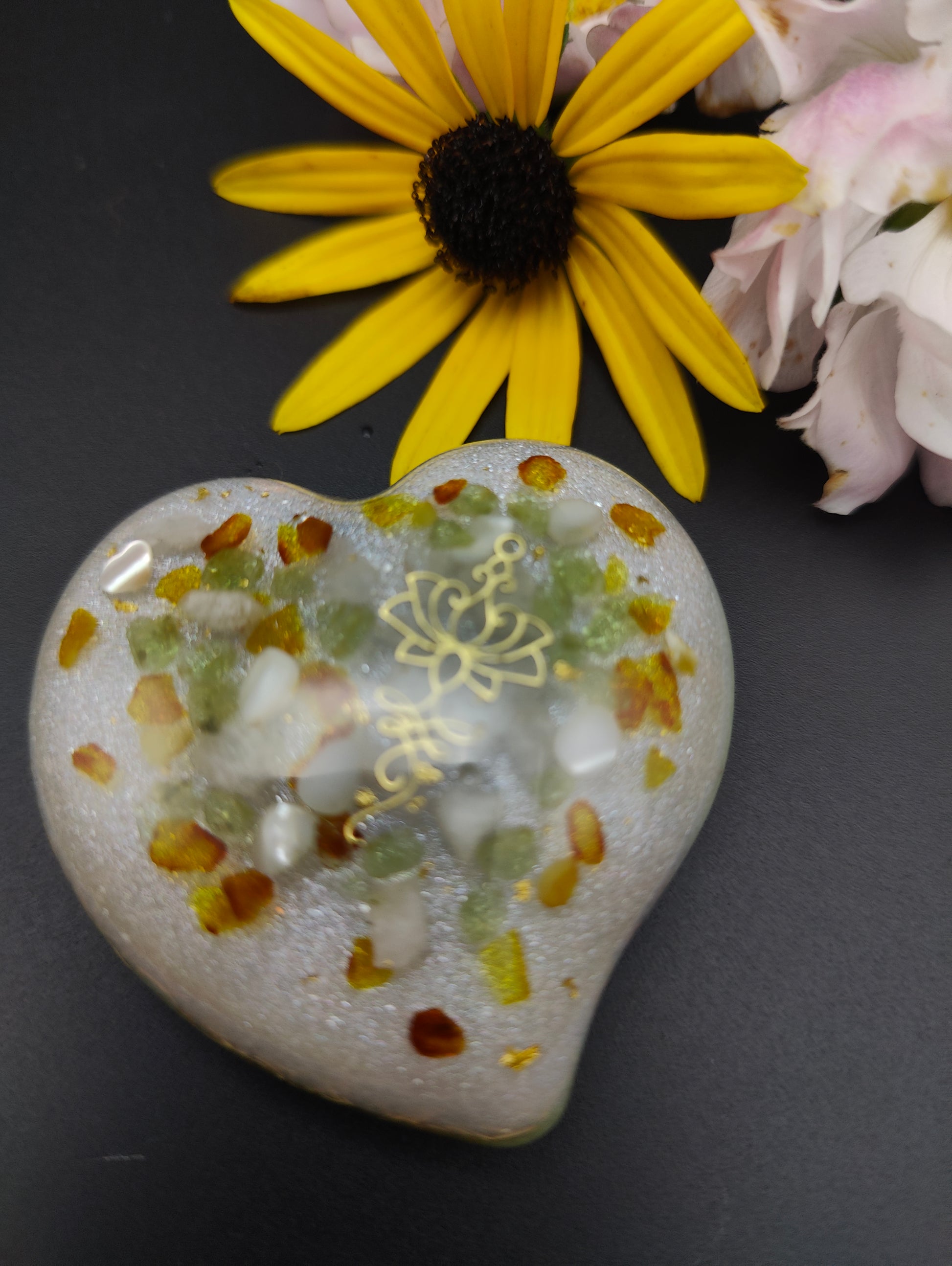 Dieses Herz enthält im oberen Bereich Bernstein, Peridot, Perlmutt und Bergkristall, veredelt mit 24K Blattgold, um eine zarte goldfarbene Lotusblüte aus Metall herum. Eine schimmernde Trennschicht liegt zwischen dieser klaren Schicht und der Farbschicht in einem hellen grün. Diese enthält Kupfer, Eisen, Messing und Agnihotraasche.
