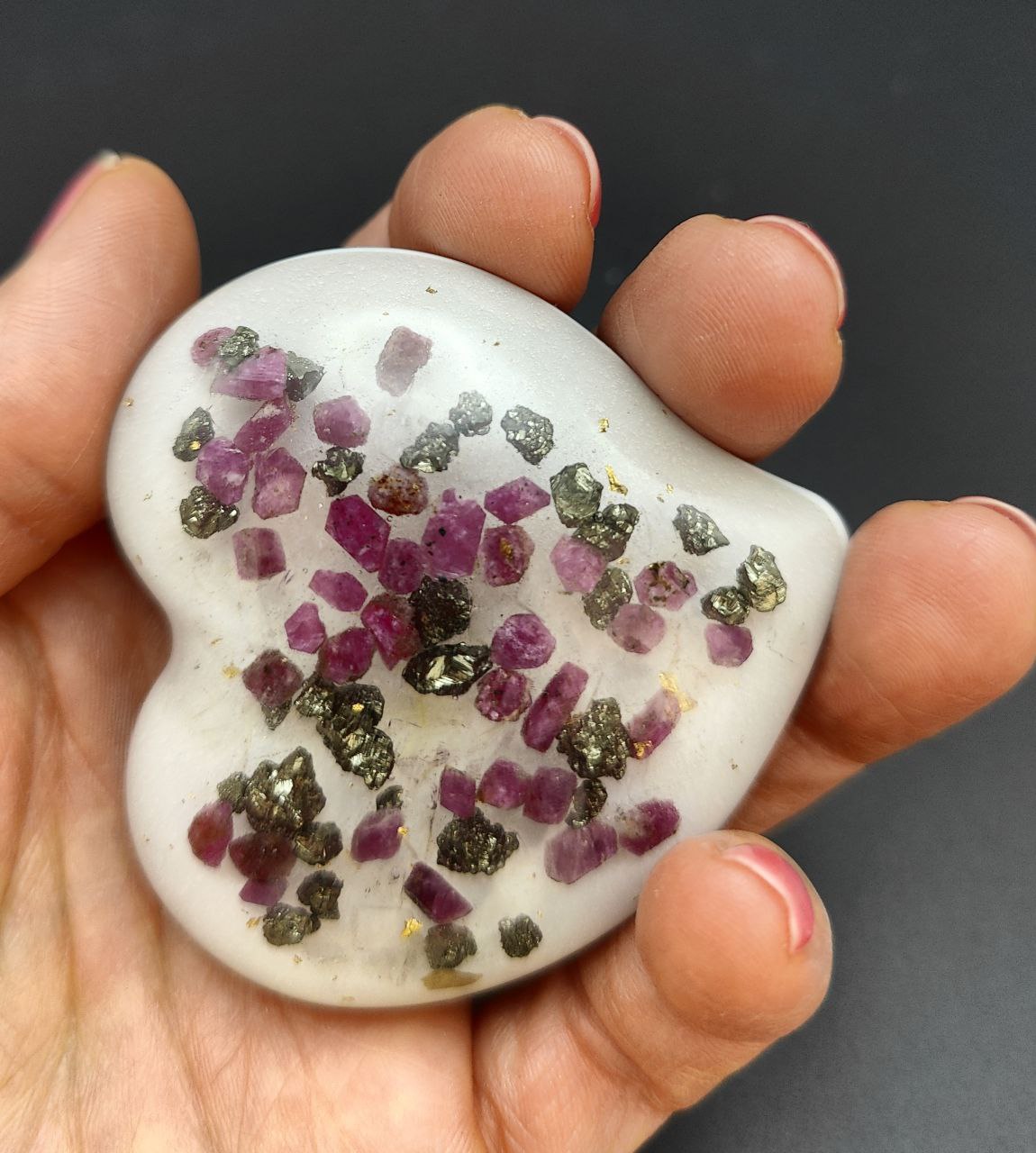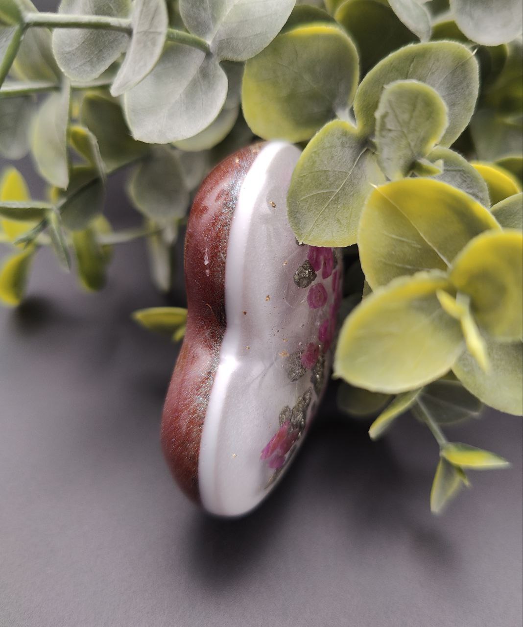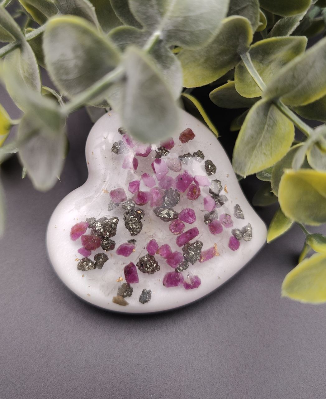 Dieses Herz enthält im oberen Bereich Rubin, Pyrit, Bergkristall und 24K Blattgold. Die schöne, leicht schimmernde und glitzerende, Farbschicht in einem rotbraun, ist mit Eisen, Eisenoxid, Messing, Kupfer und Agnihotraasche gefüllt.