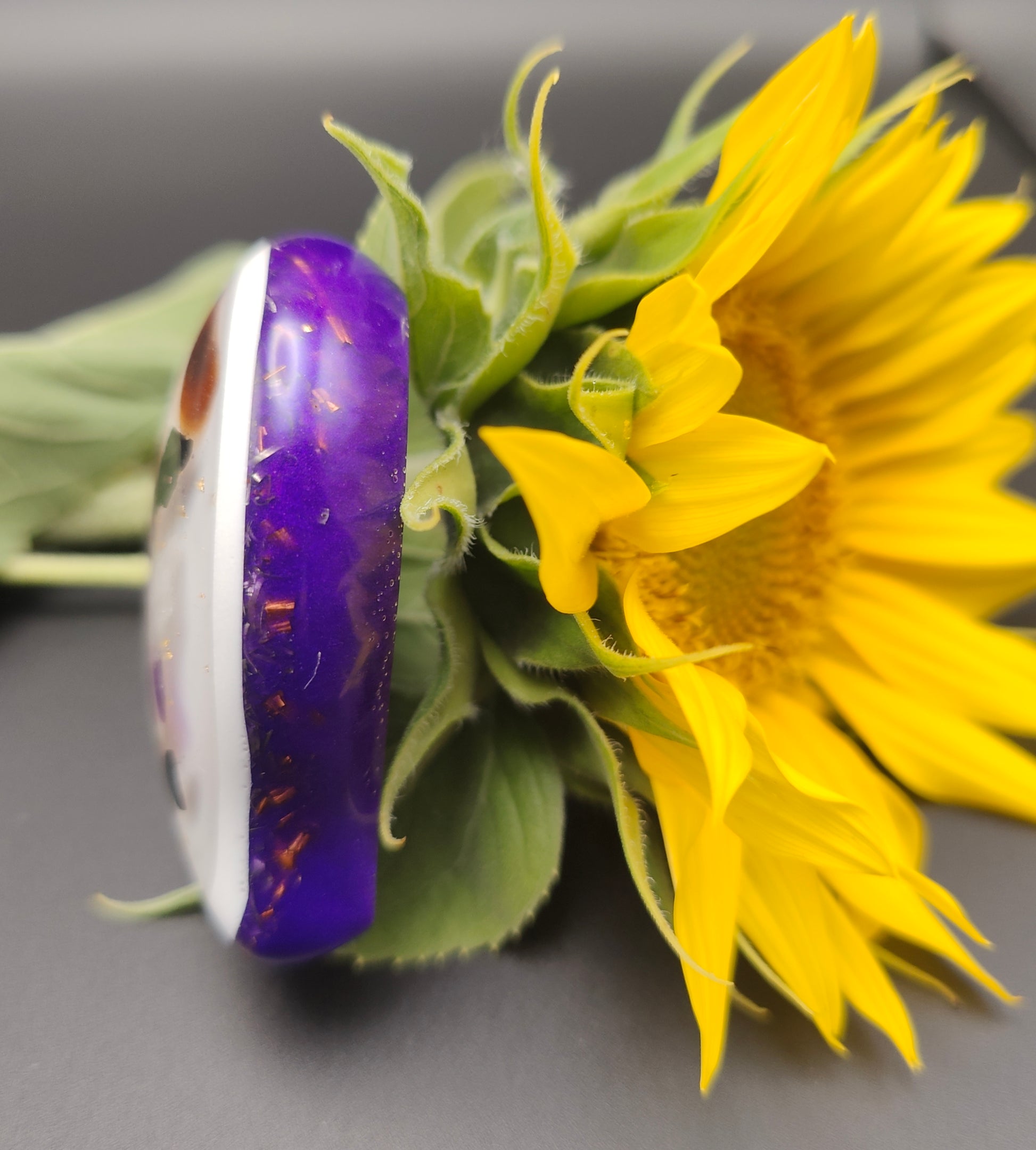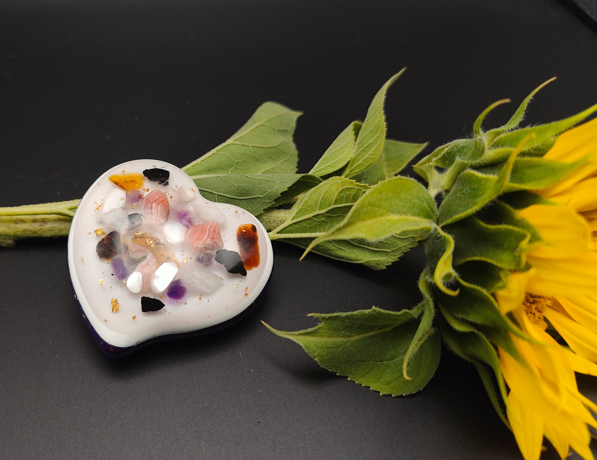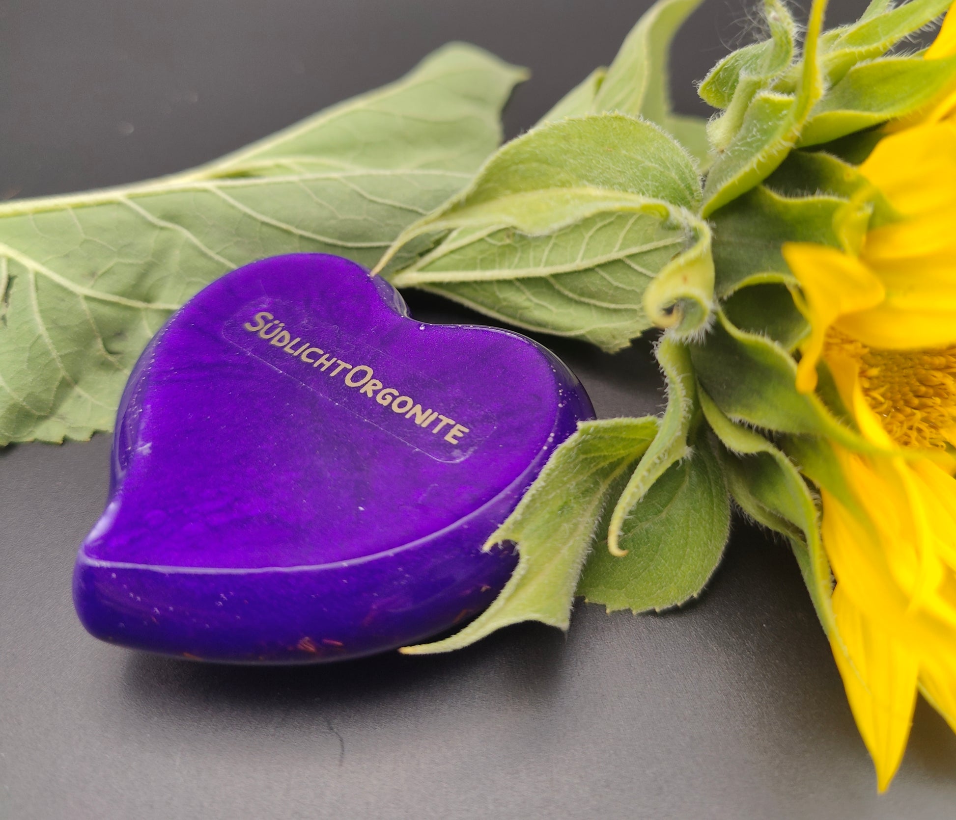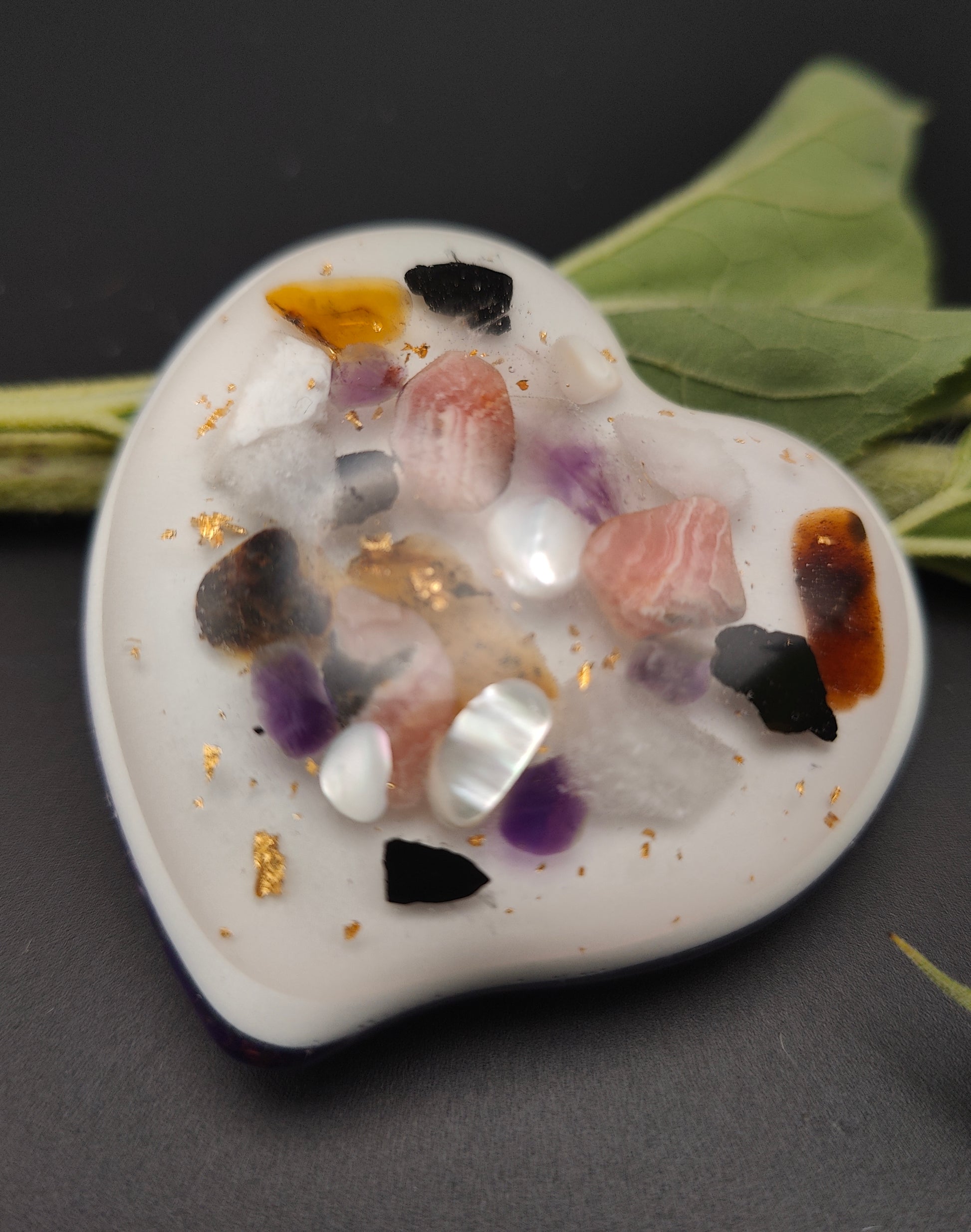 Dieses Herz enthält im oberen Bereich Rhodochrosit, Bernstein, Rosenquarz, Perlmutt, Amethyst, Bergkristall, Shungit und 24K Blattgold. Die weiße Farbschicht enthält Bergkristallpulver und Eisenoxid, die lilaFarbschicht ist mit Eisen, Messing, Kupfer und Agnihotraasche gefüllt.