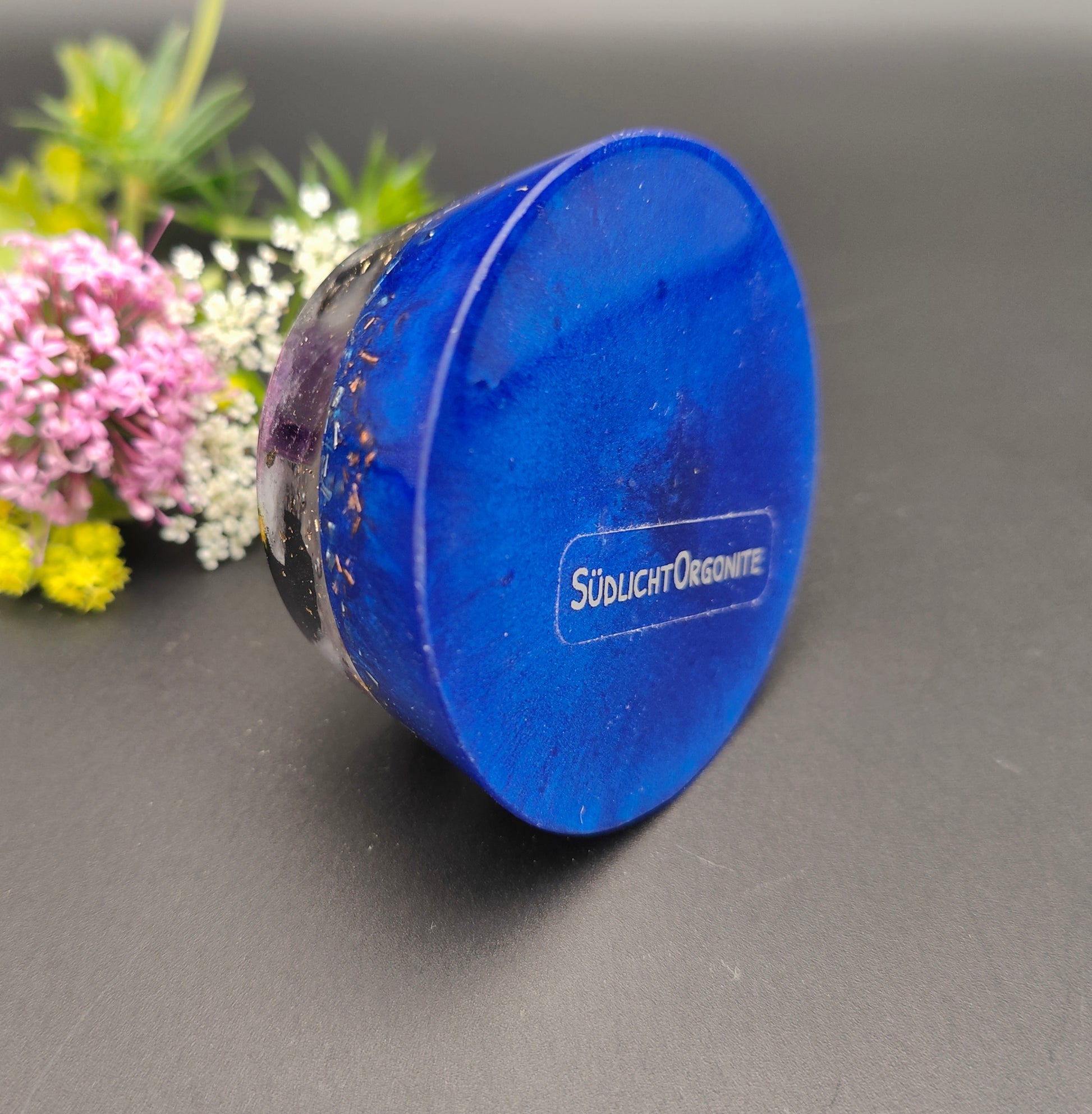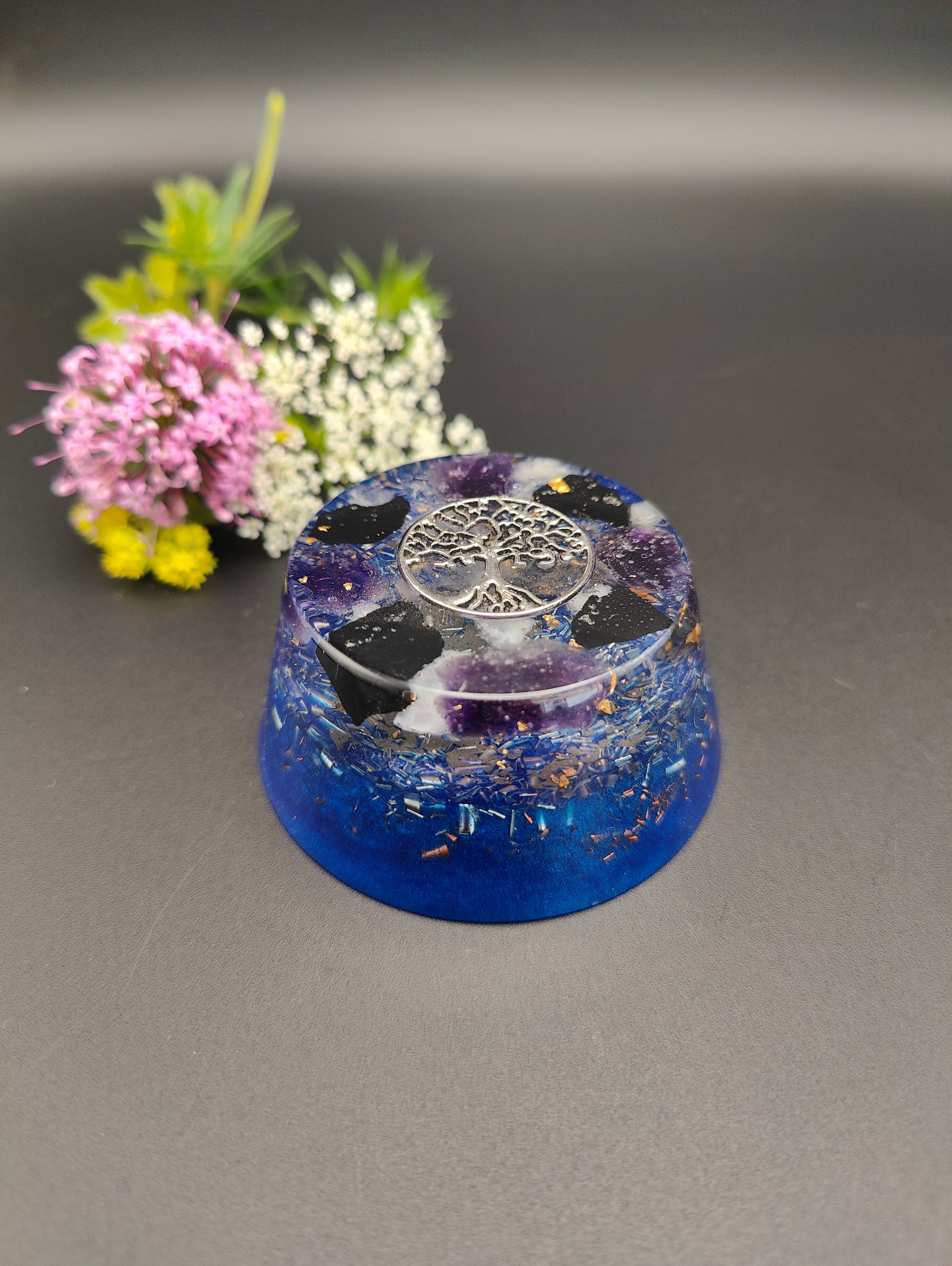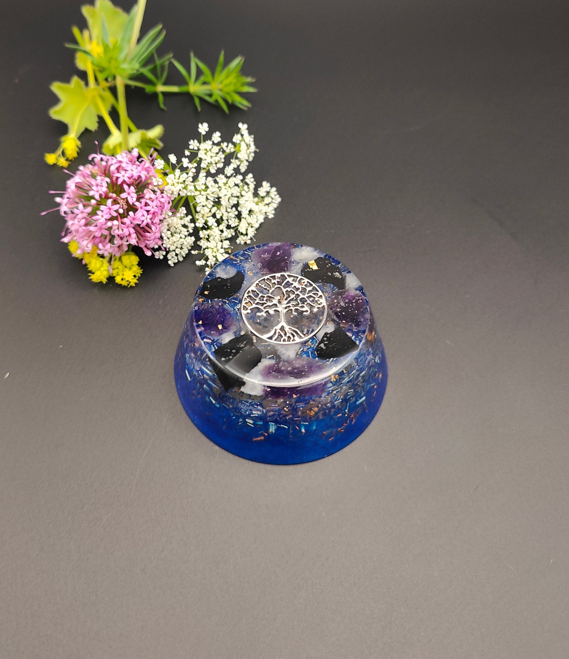 Dieser Orgonit enthält einen Baum des Lebens aus Metall, dazu Bergkristall, Amethyst und Shungit mit ein wenig 24K Blattgold. Die Farbschicht in Dunkelblau ist mit Kupfer, Eisen, Messing und Agnihotraasche gefüllt.