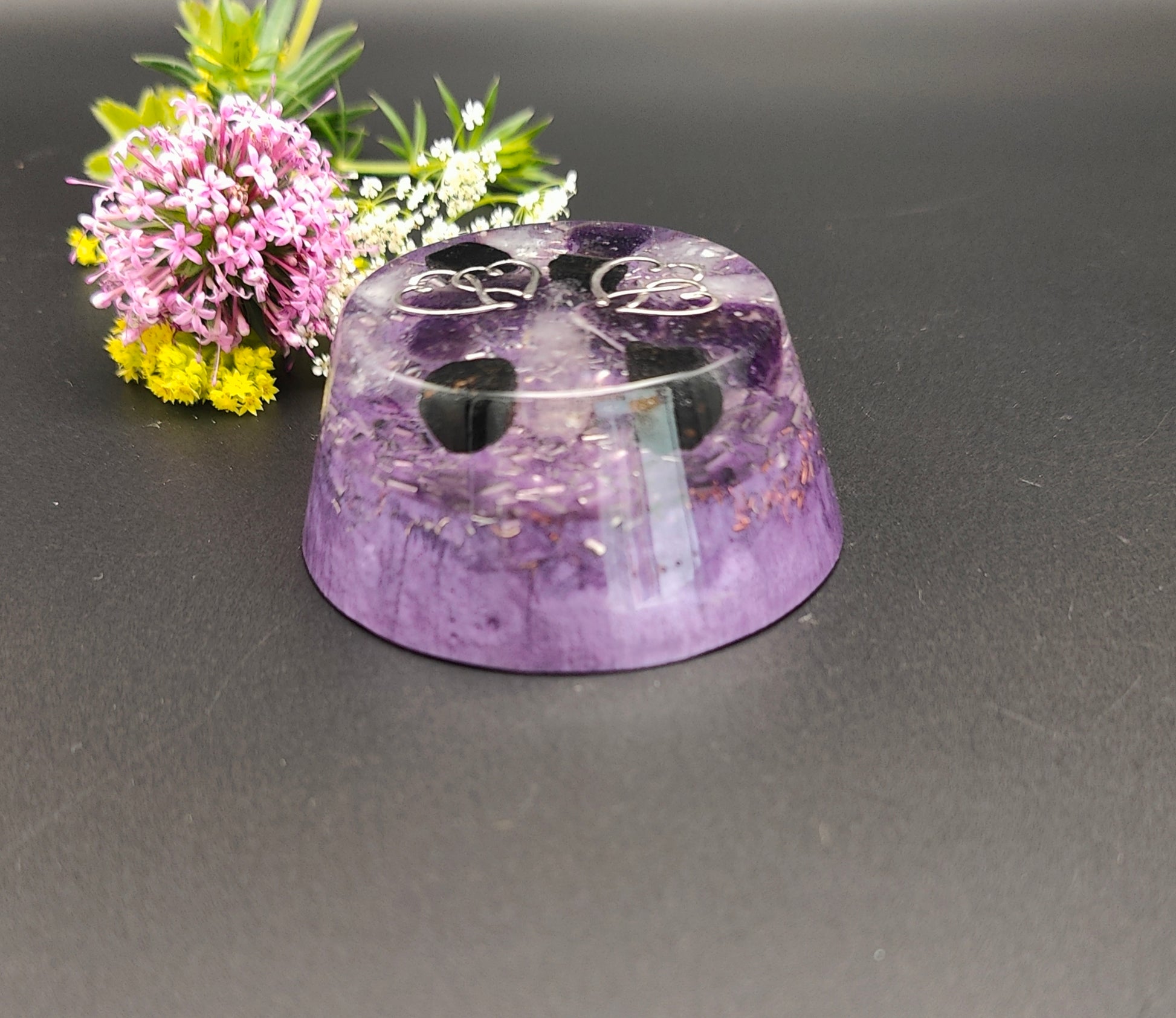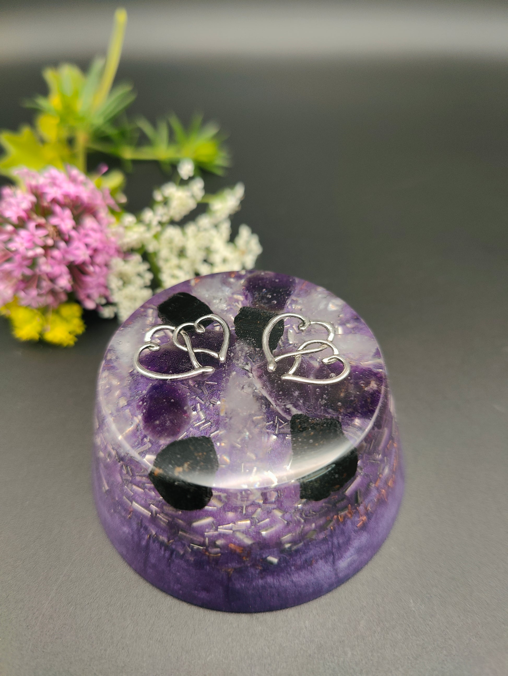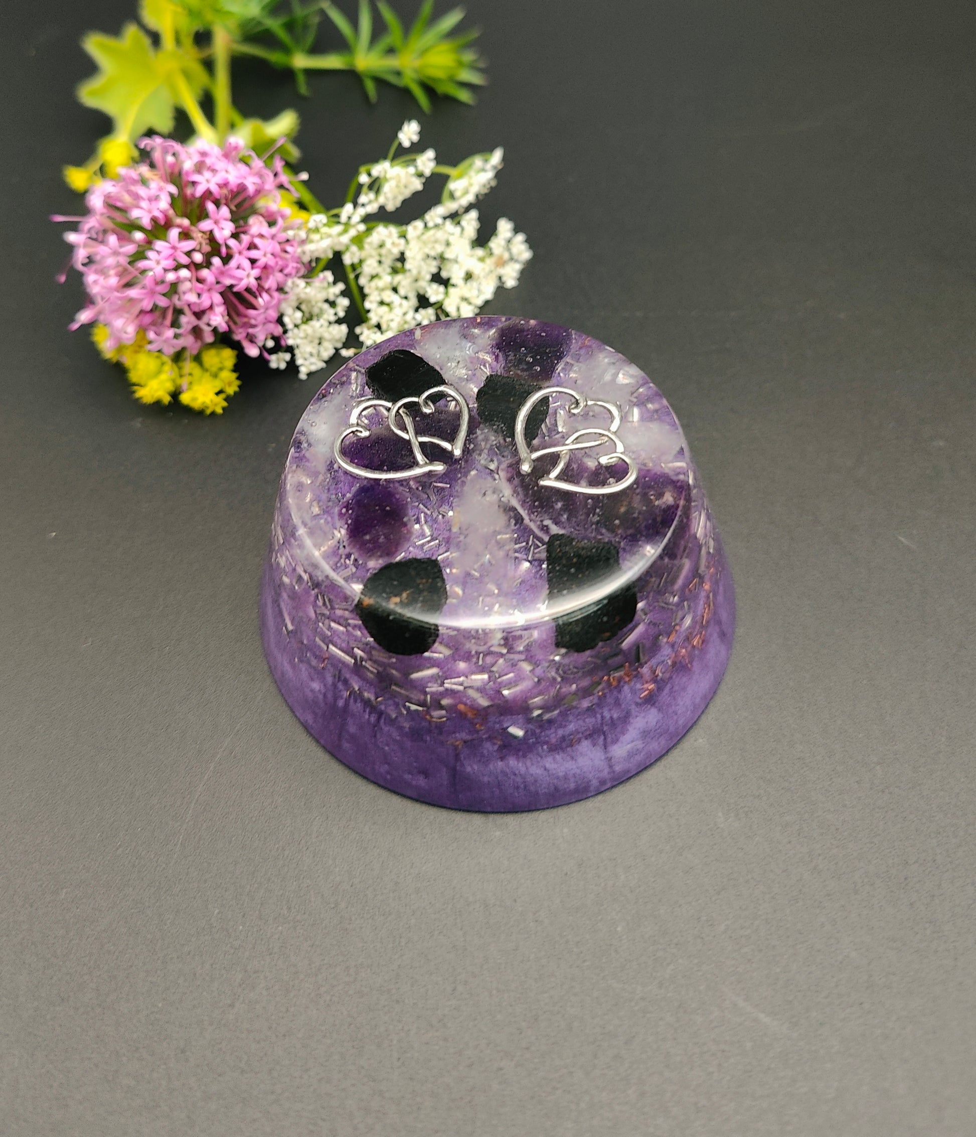 Dieser Orgonit enthält unter den zwei Metall-Herzen viel Bergkristall, Amethyst und Shungit. Die schöne Farbschicht in Lavendel ist mit Kupfer, Eisen, Messing und Agnihotraasche gefüllt.