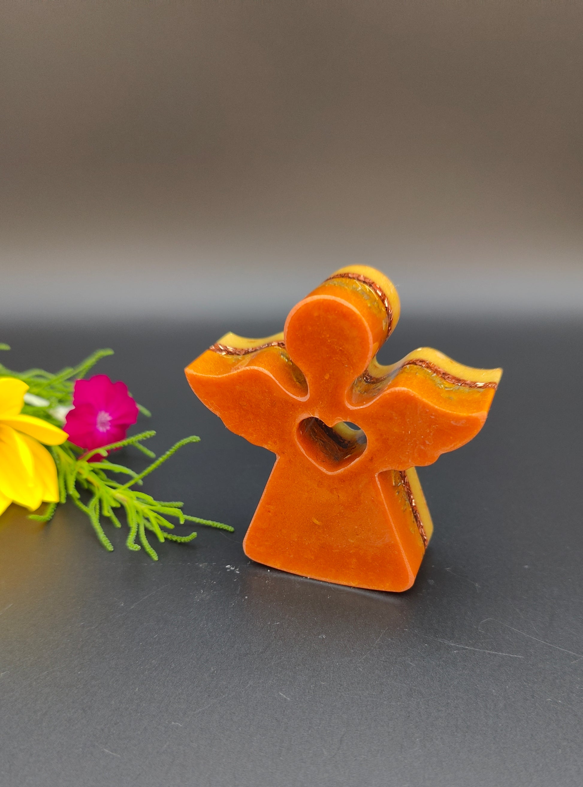 Verbaut sind in diesem strahlenden Engel viel Bergkristall-Pulver und kleine -Rohsteine. Zudem in den weiteren Schichten natürlich Messing, Eisen, Kupfer und Agnihotraasche.