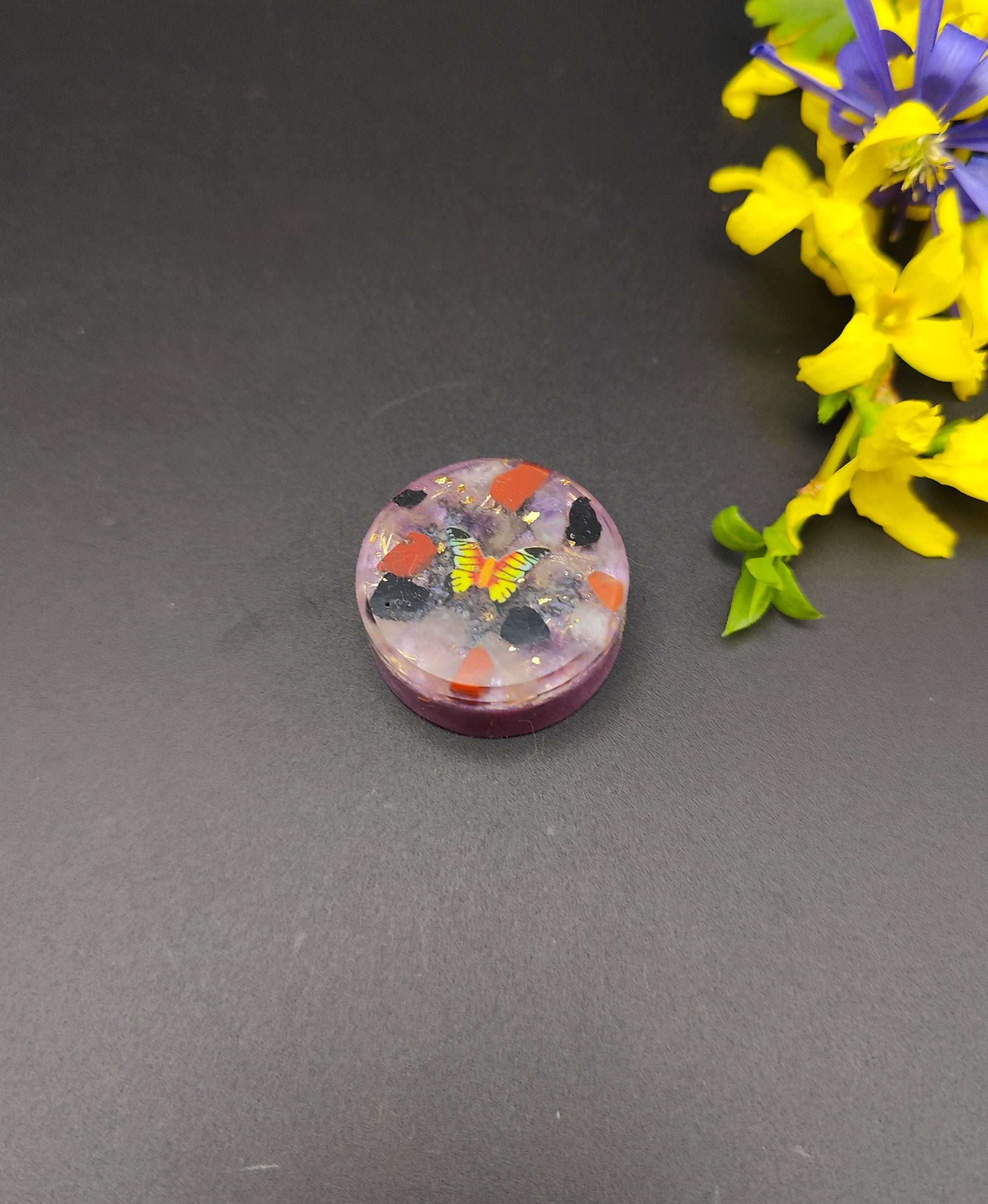Dieser kleine Taschenorgonit beherbergt mittig einen kleinen Schmetterling, umrahmt von Bergkristall, Rosenquarz, Amethyst, schwarzem Turmalin und rotem Jaspis. In der schönen Farbschicht liegen Kupfer, Eisen, Messing und Agnihotraasche.