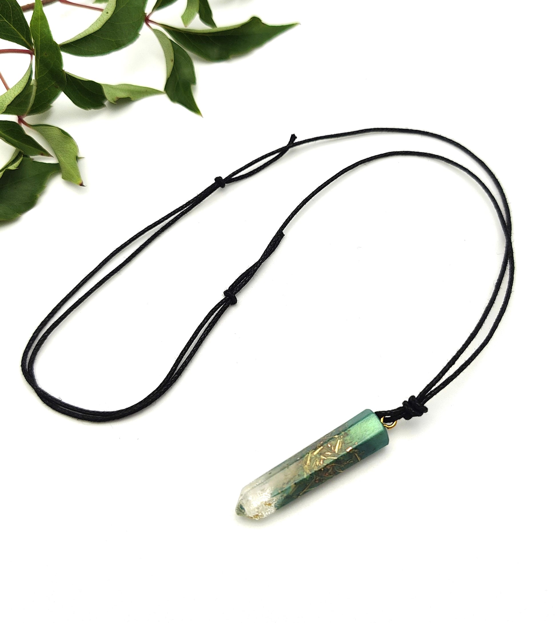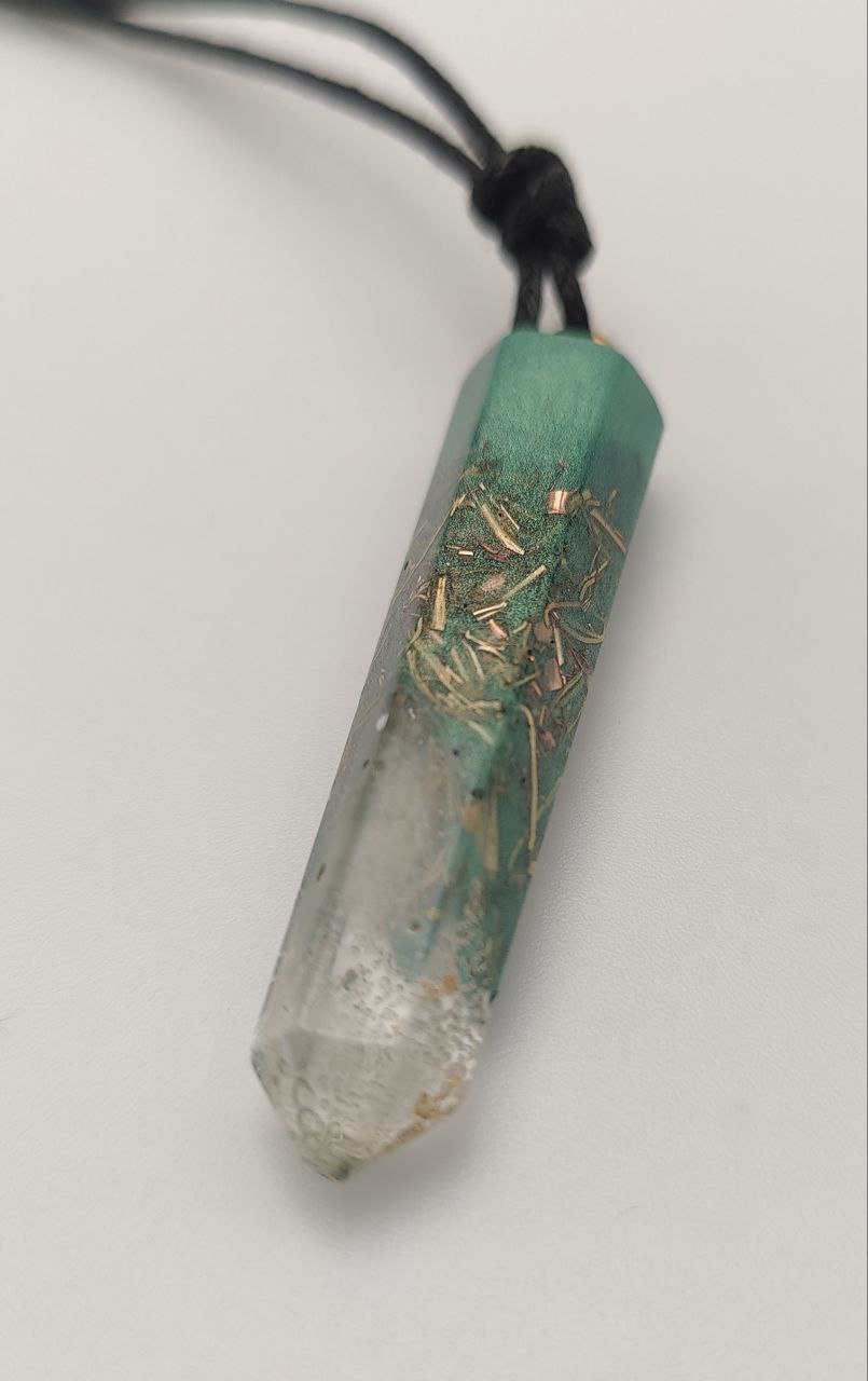 Wunderschöner Anhänger in grün mit Bergkristall und 24K Blattgold in der Spitze. In der