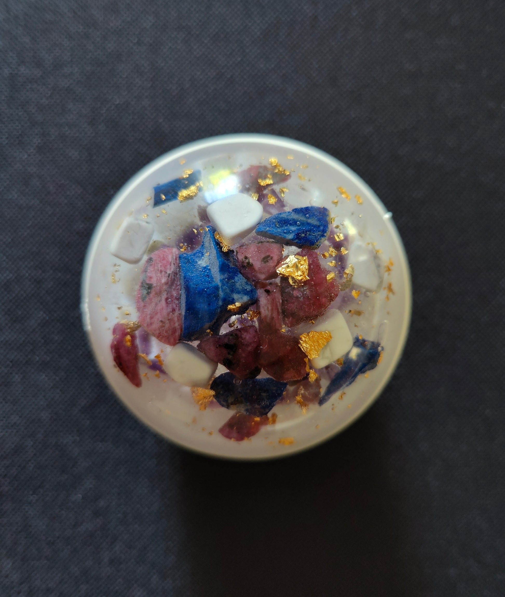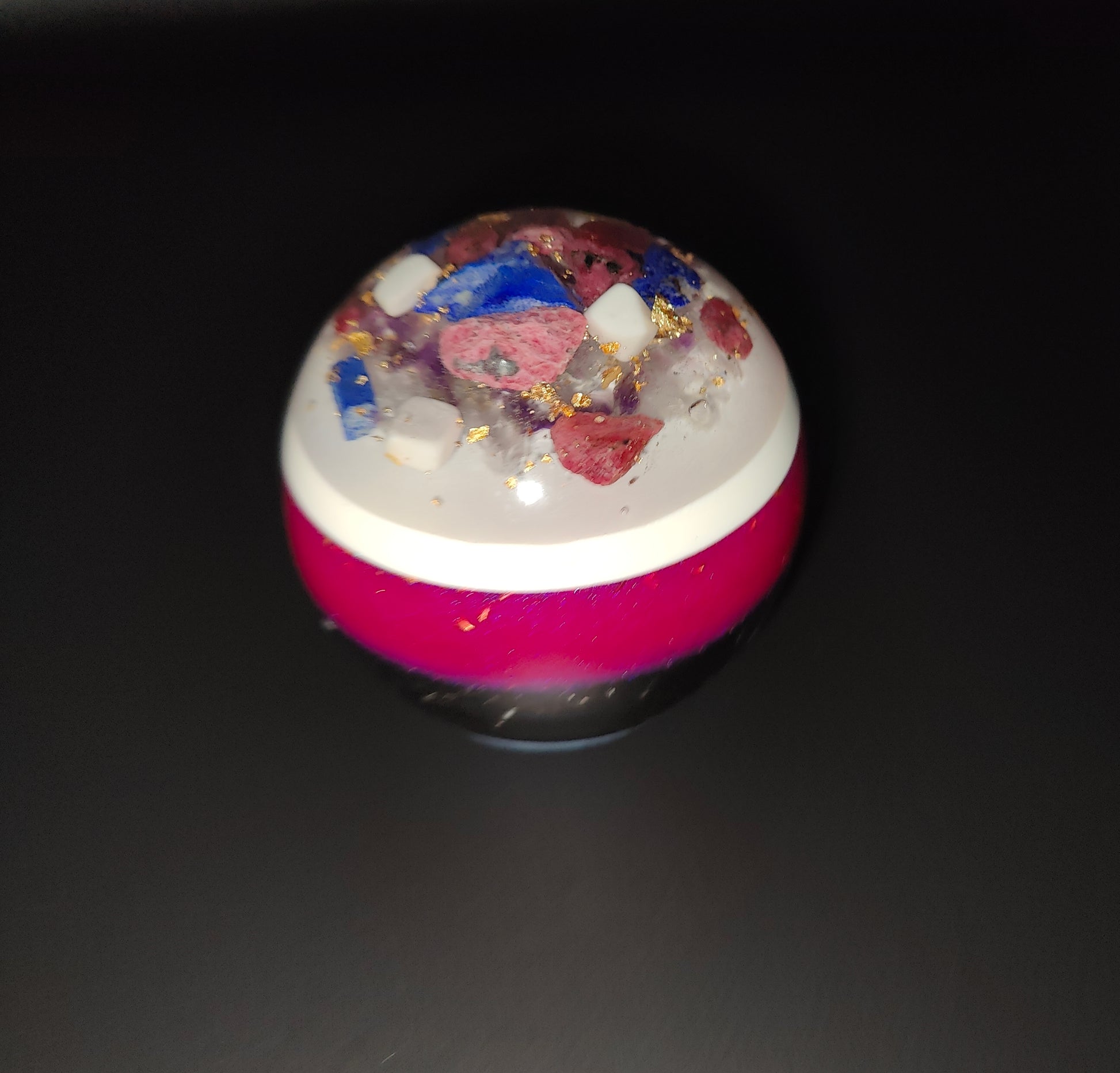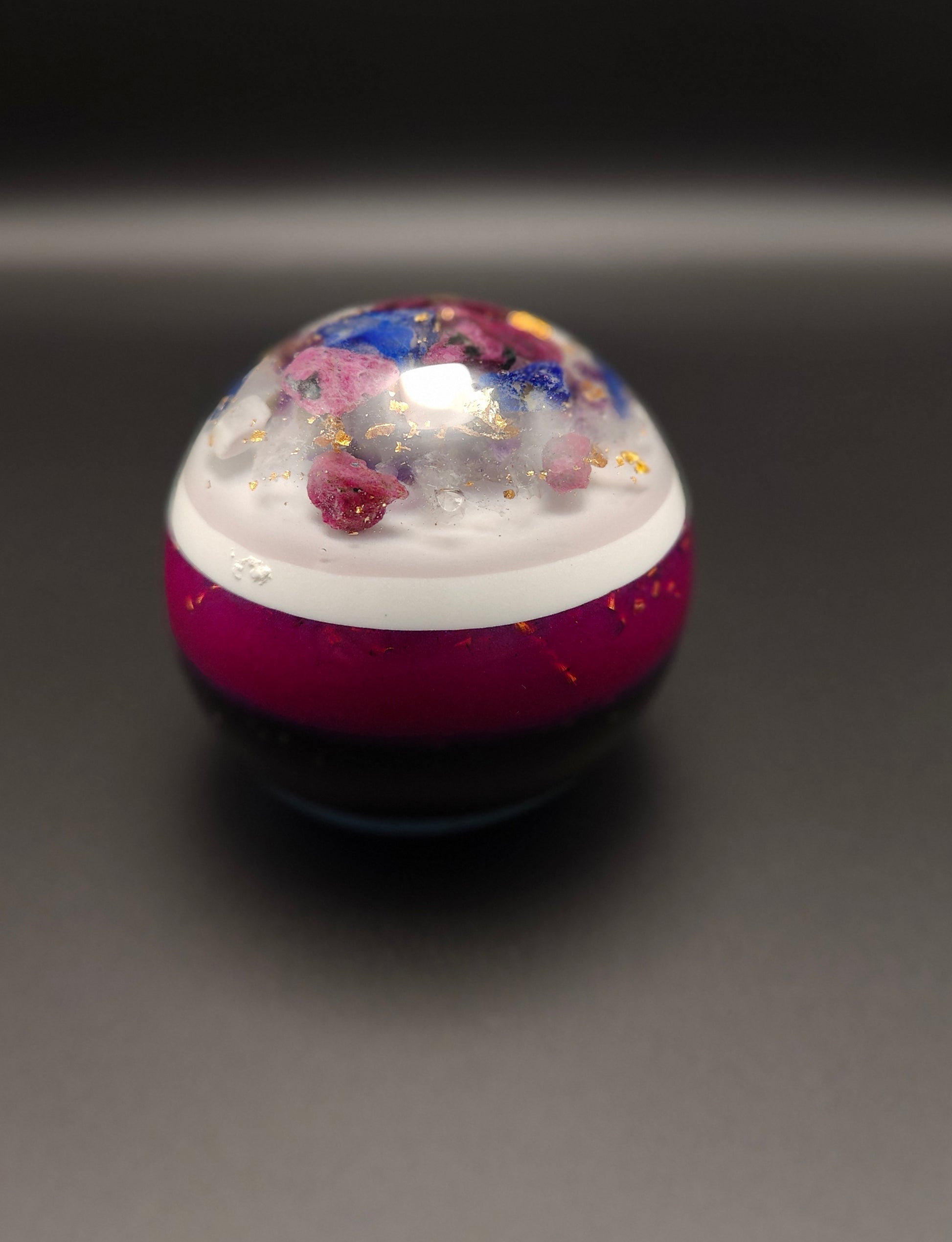 Diese Kugel enthält Rubin, Lapislazuli, Magnesit, Bergkristall, Amethyst und Shungit, zu sehen in der Kuppel inmitten von 24K Blattgold.