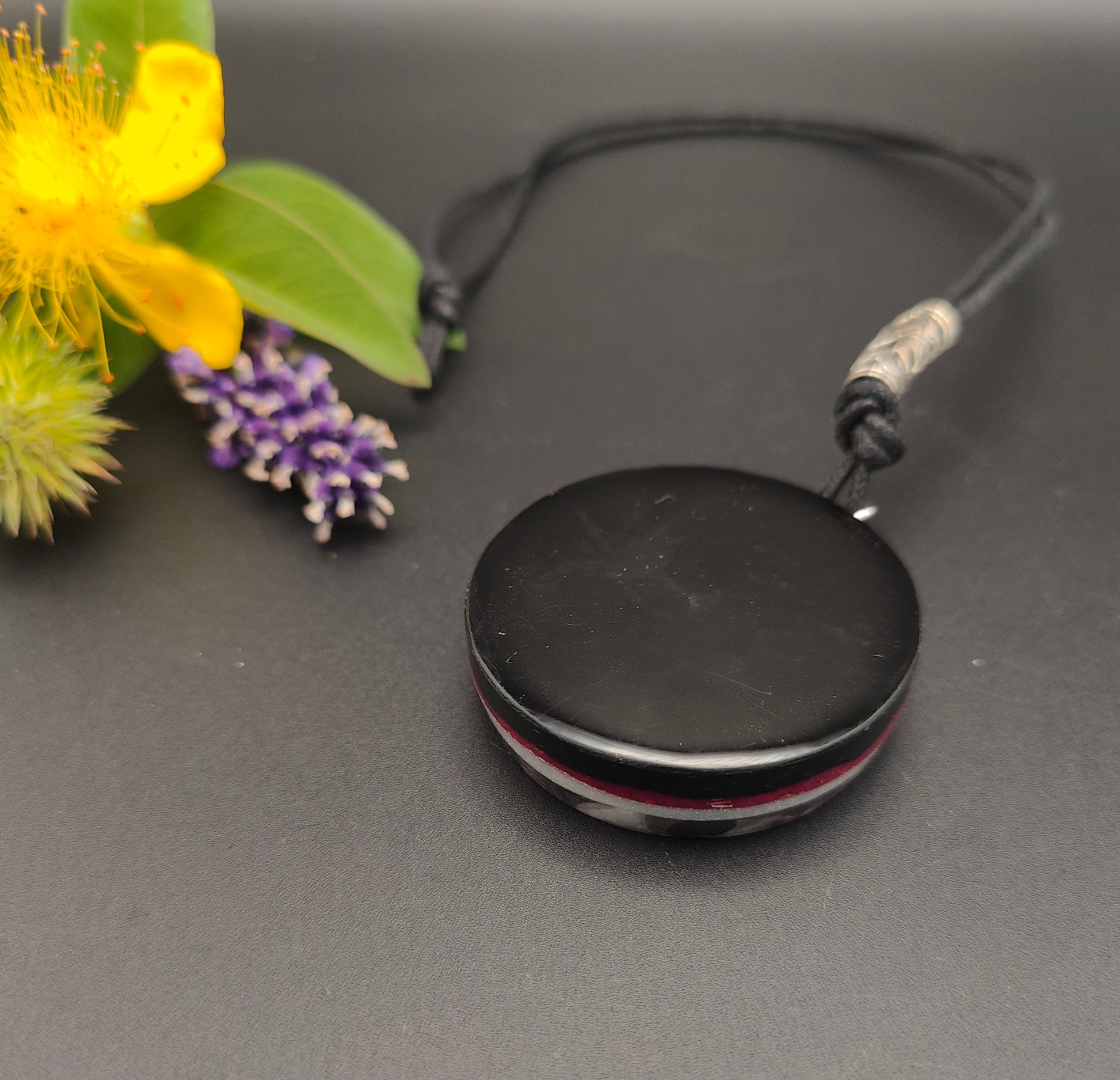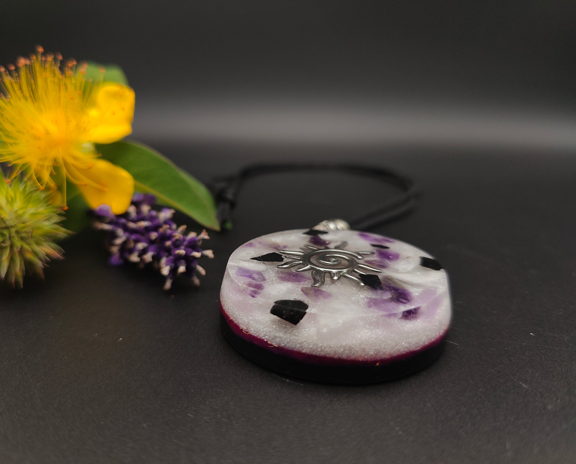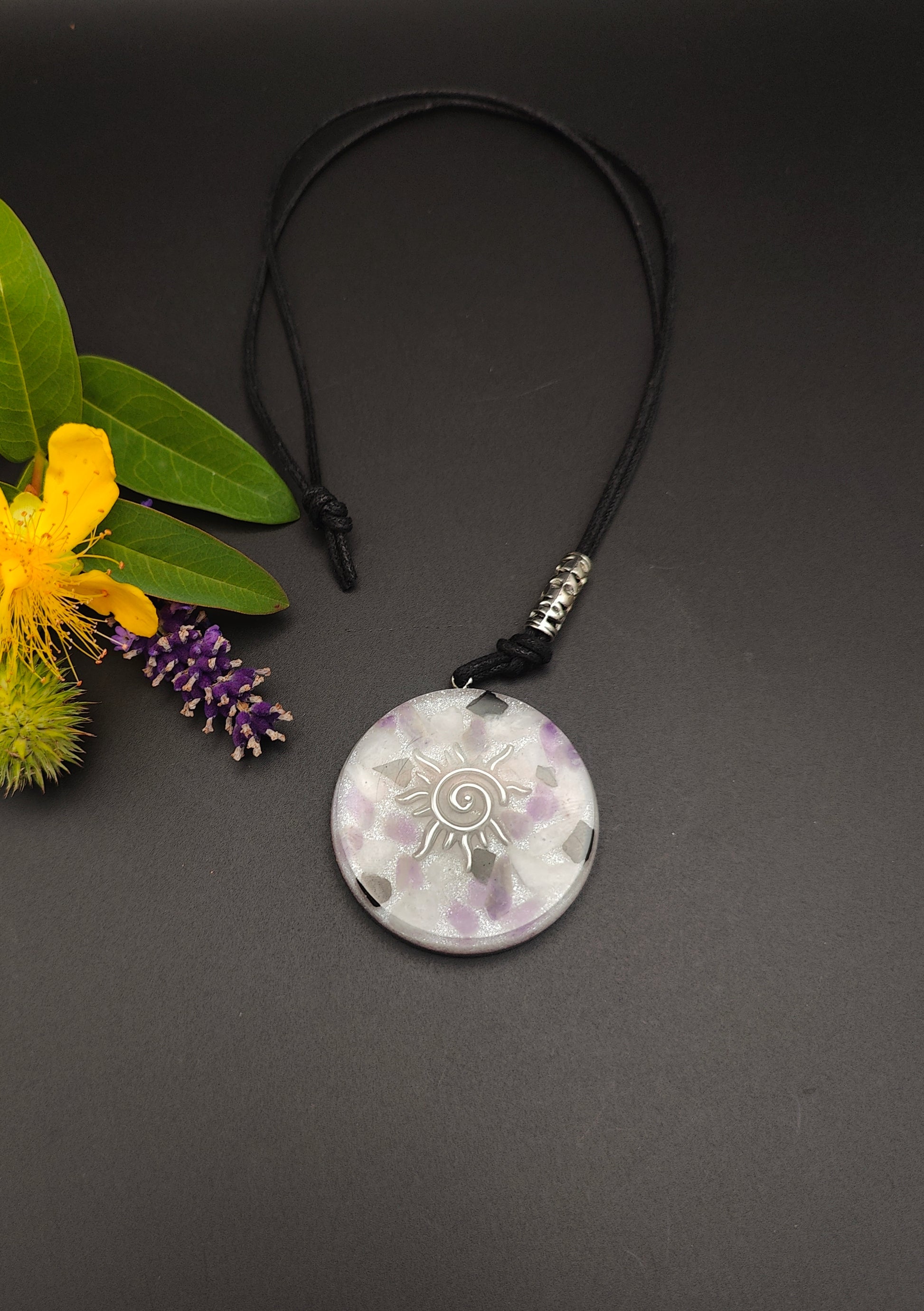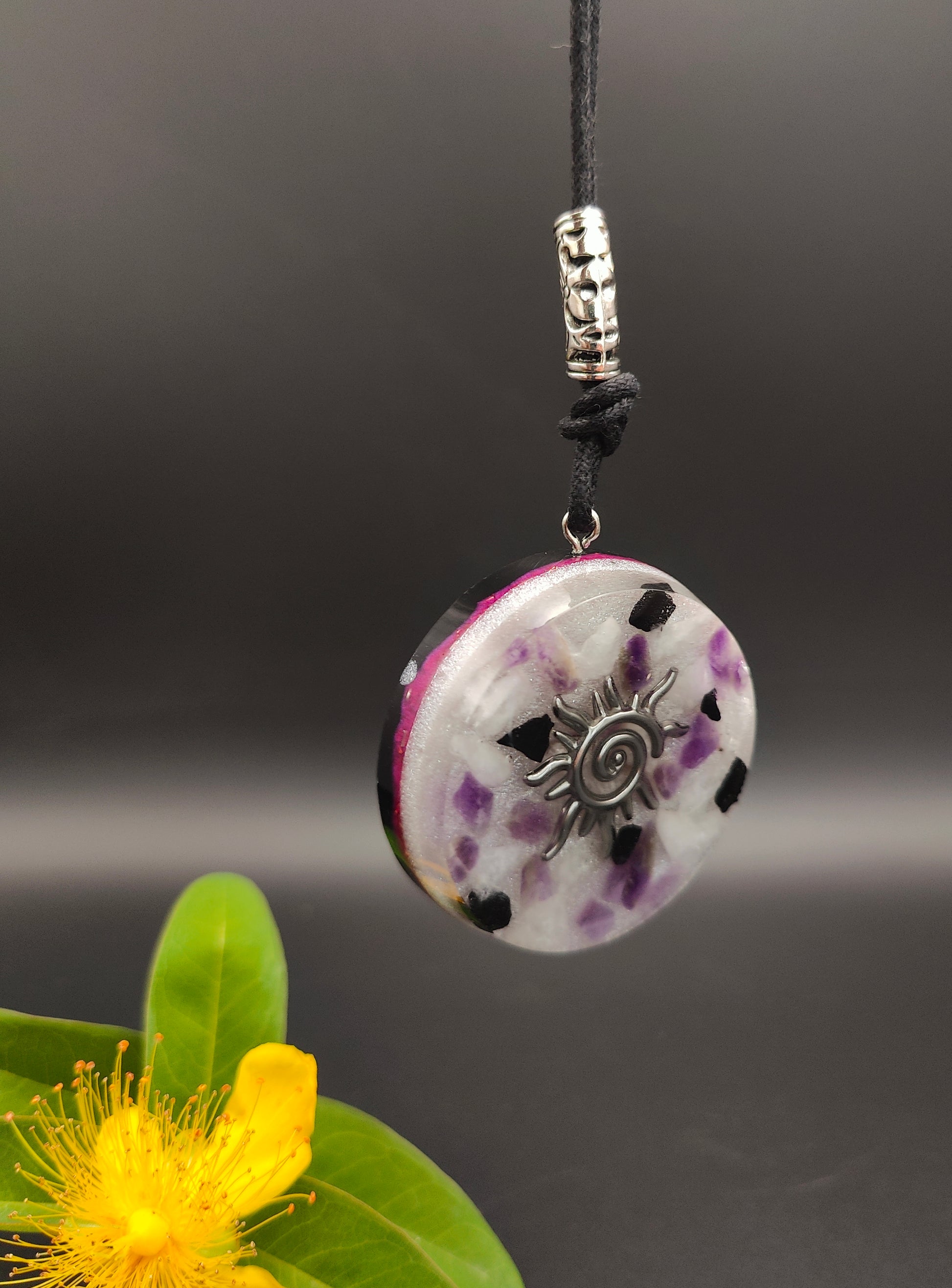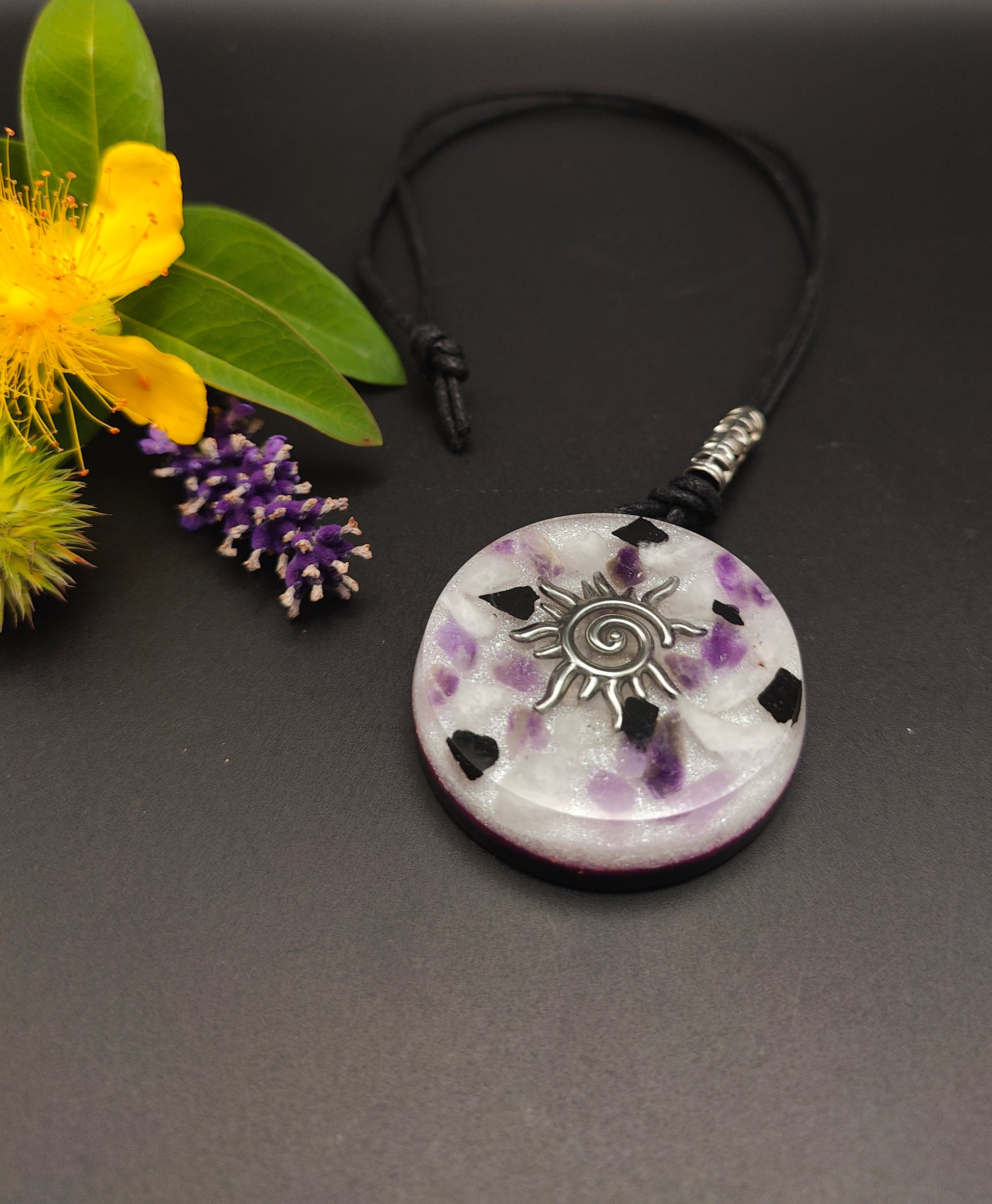 Auf der vorderen Seite liegen um eine Sonne aus Metall Bergkristalle, Amethyst und Shungit. Darunter kommt eine schimmernde Perlmutt-Schicht, danach ein dunkles rot, dann eine schwarze Schicht, welche mit Shungit-Pulver gefärbt wurde.
