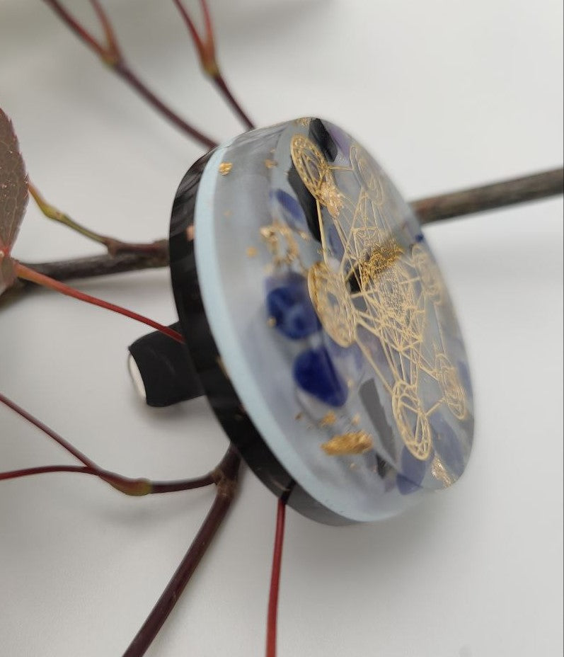 Ein goldenes Metatrons-Würfel Symbol ziert die obere Schicht. Darunter liegen Sodalith, Bergkristall, Amethyst und Shungit. In den Farbschichten befinden sich Eisenoxid, Bergkristallpulver, Agnihotraasche, Kupfer, Messing und Eisen.
