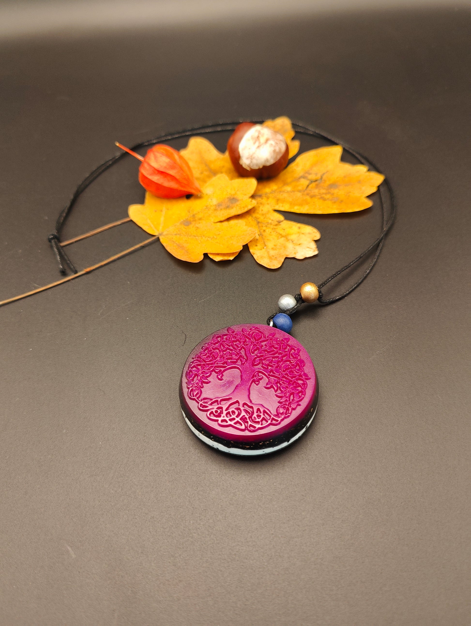 Der Baum des Lebens ist in Pink ausgegossen. Danach folgt eine schwarze Schicht mit viel Shungitpulver, Agnihotraasche, Eisenoxid, Eisen, Messing und Kupfer. Die weiße Schicht enthält viel Bergkristallpulver und Amethyst.