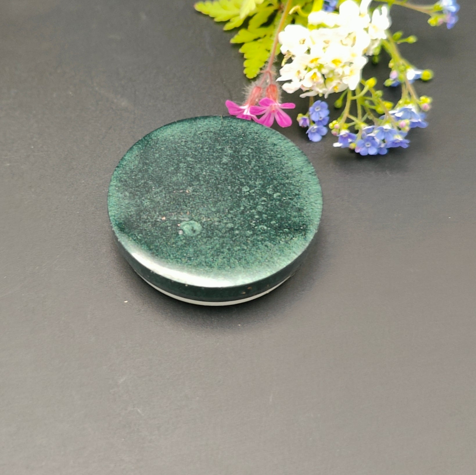 Dieser Orgonit hat ca. 5 cm Durchmesser und ist ca. einen cm hoch.