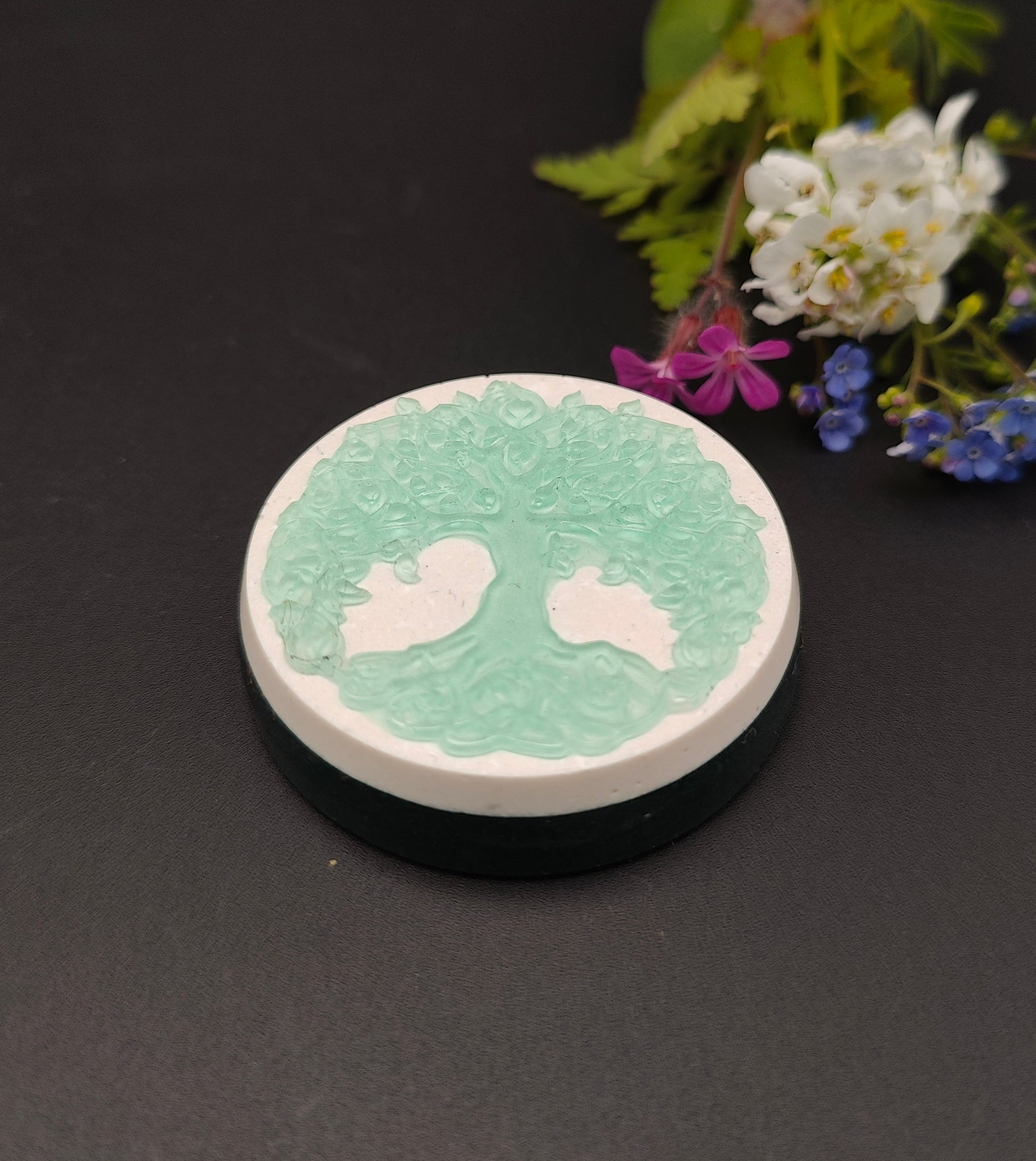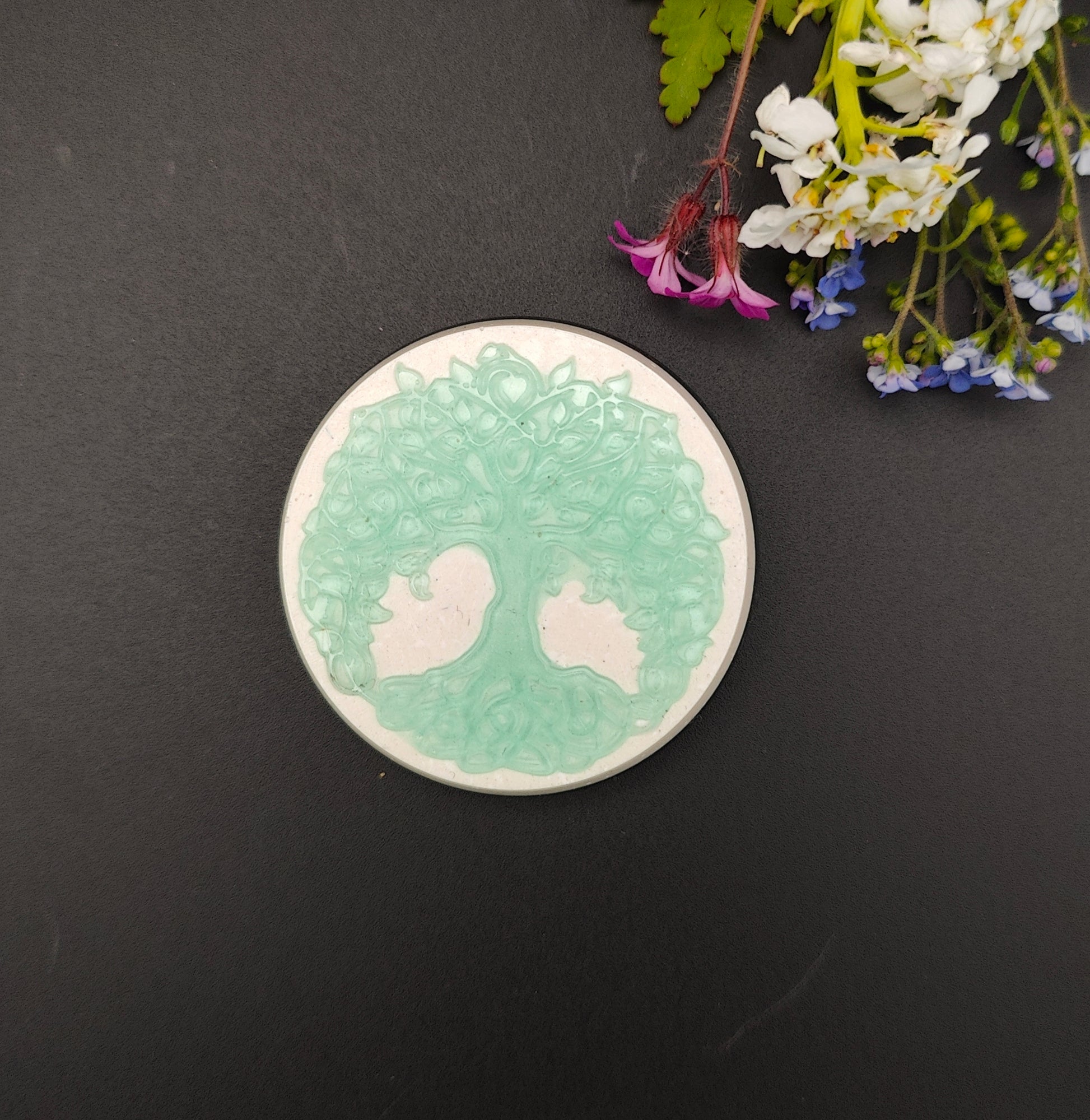 Das Baum-des-Lebens-Symbol ist mit einer grünen Tinte ausgegossen. In der weißen Schicht ist viel Bergkristallpulver enthalten, sowie Eisenoxid. In der dunkelgrünen Farbschicht sind Eisen, Messing, Kupfer, Agnihotraasche und Shungit-Rohsteine.