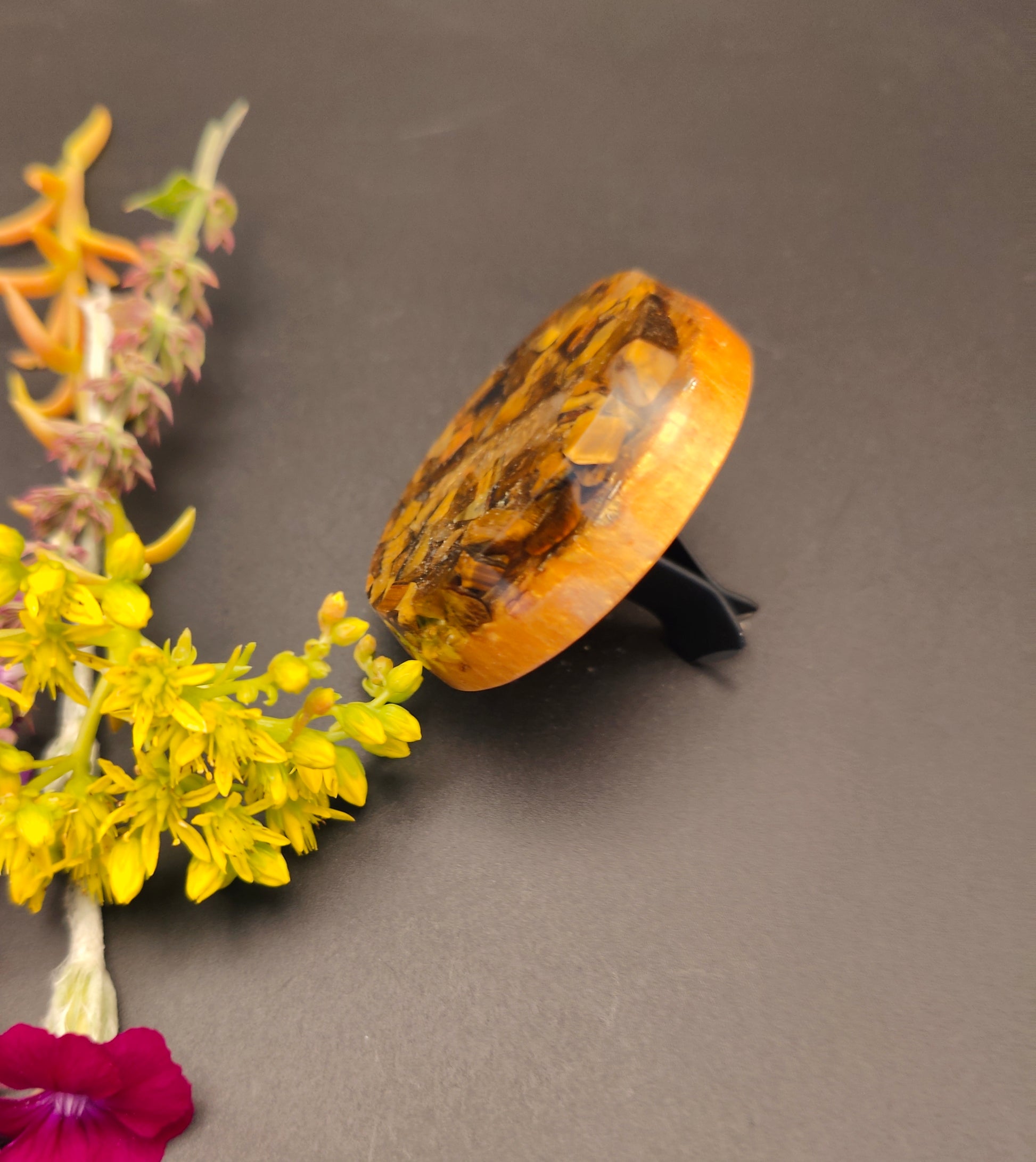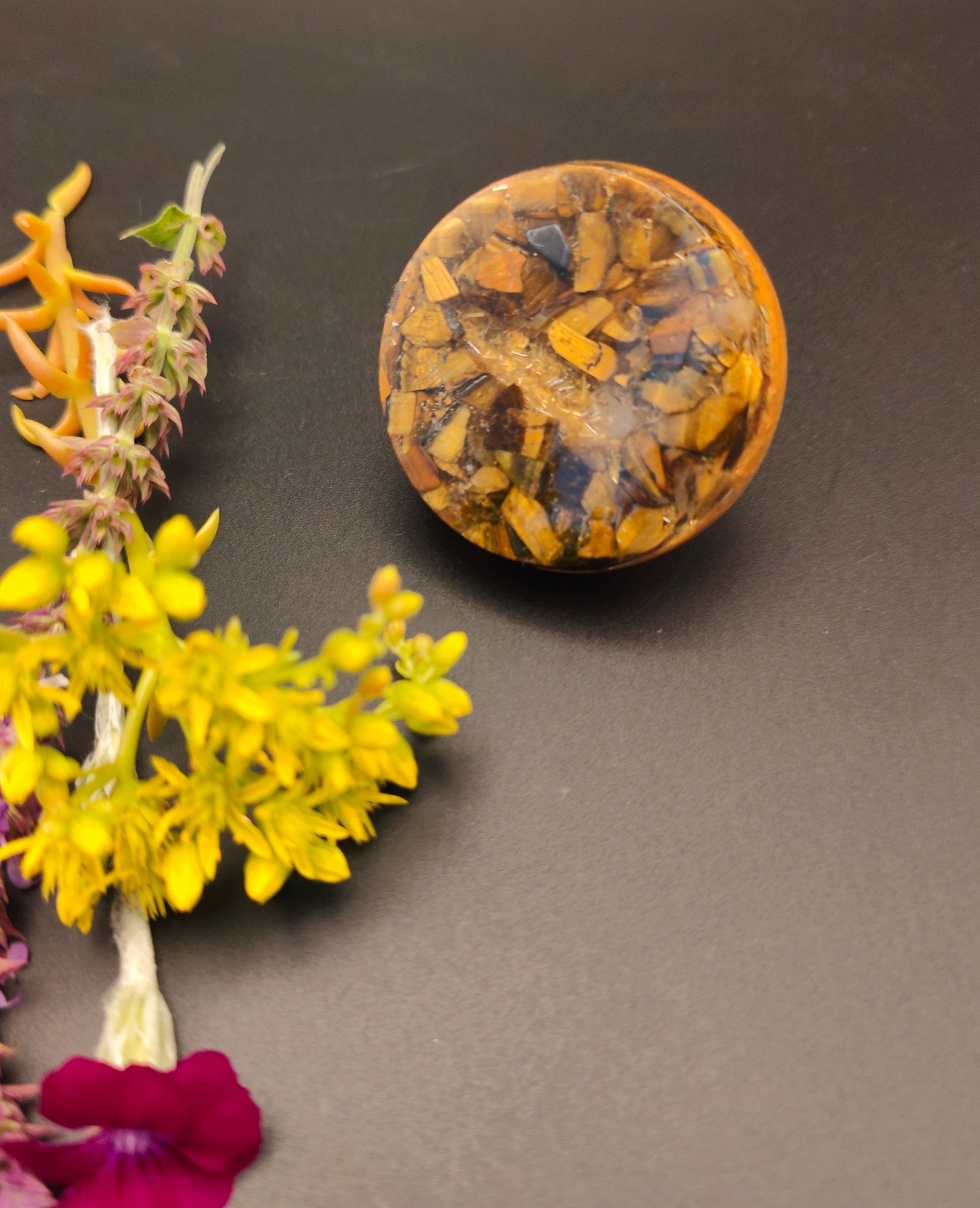Auf der vorderen Seite liegt eine Bergkristallspitze inmitten von Tigerauge. In der goldenen Farbschicht sind Eisen, Messing, Kupfer, Agnihotraasche und Shungit-Rohsteine enthalten.