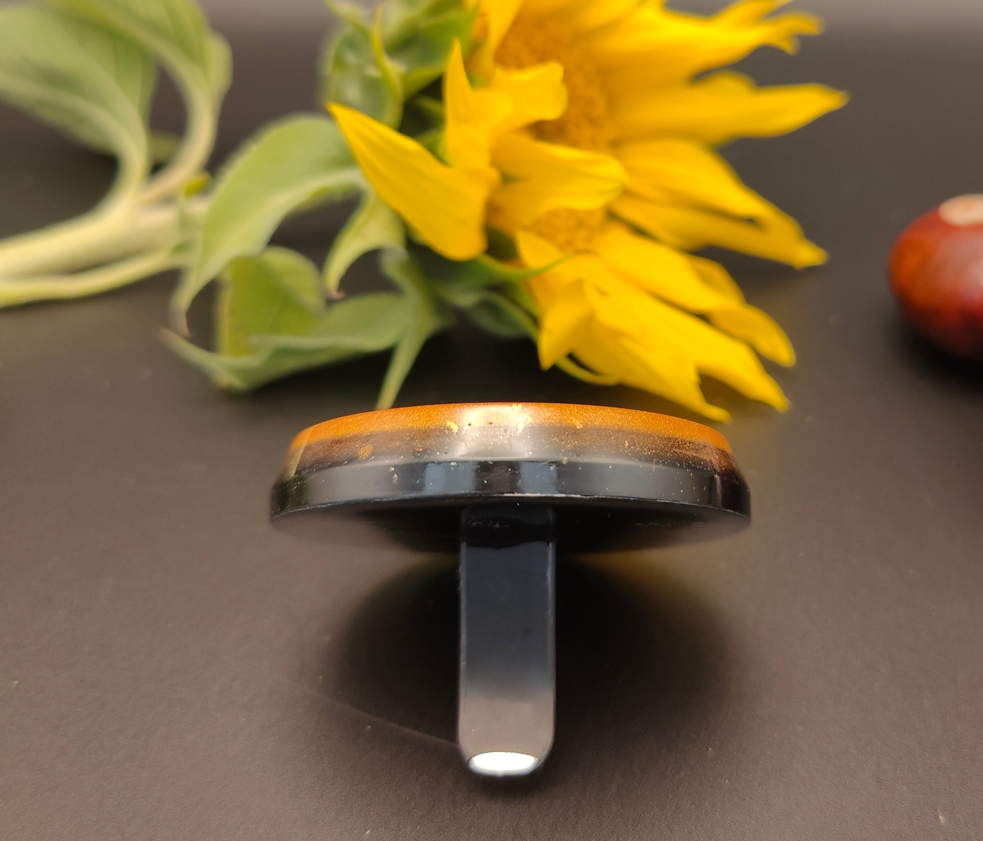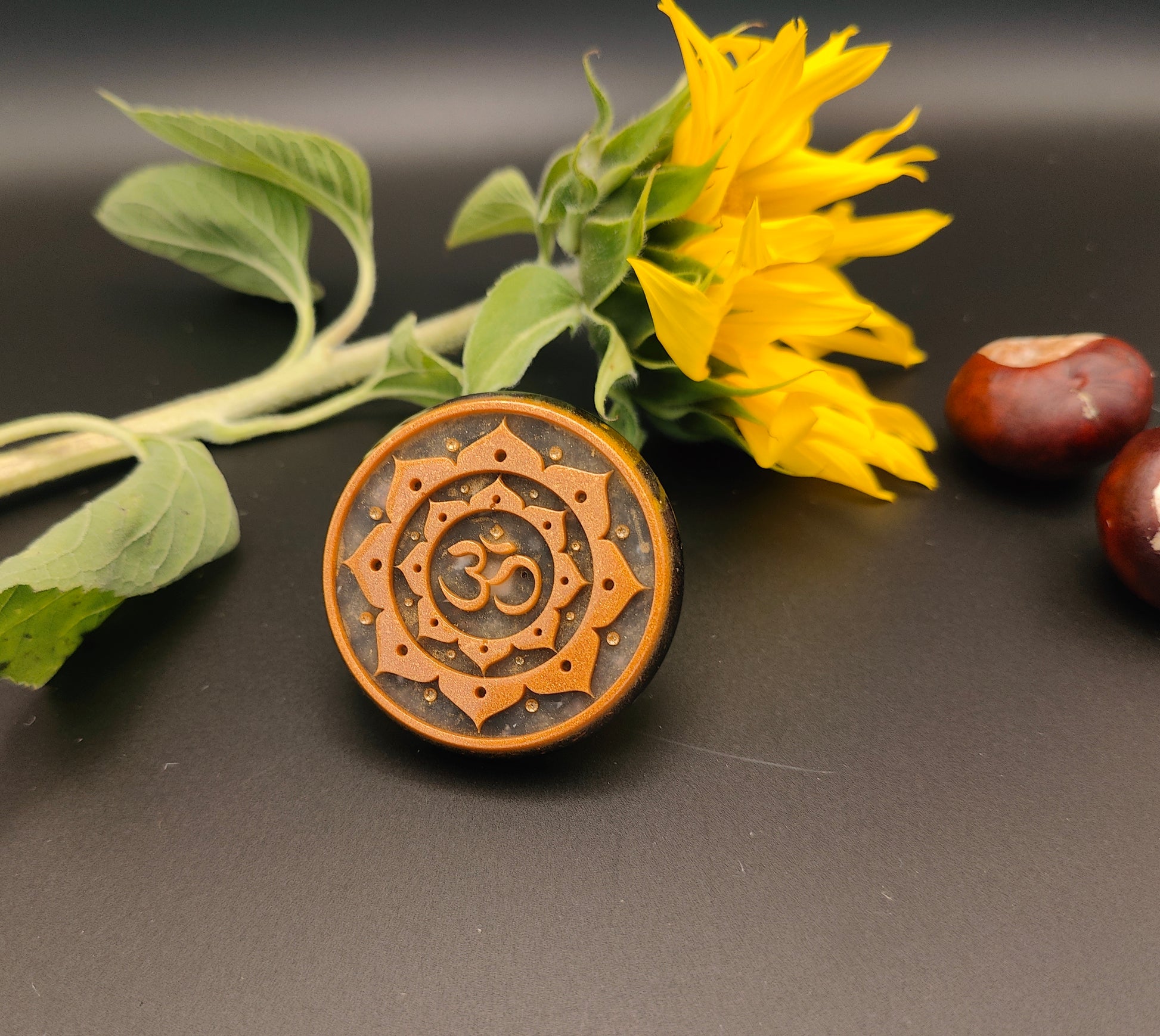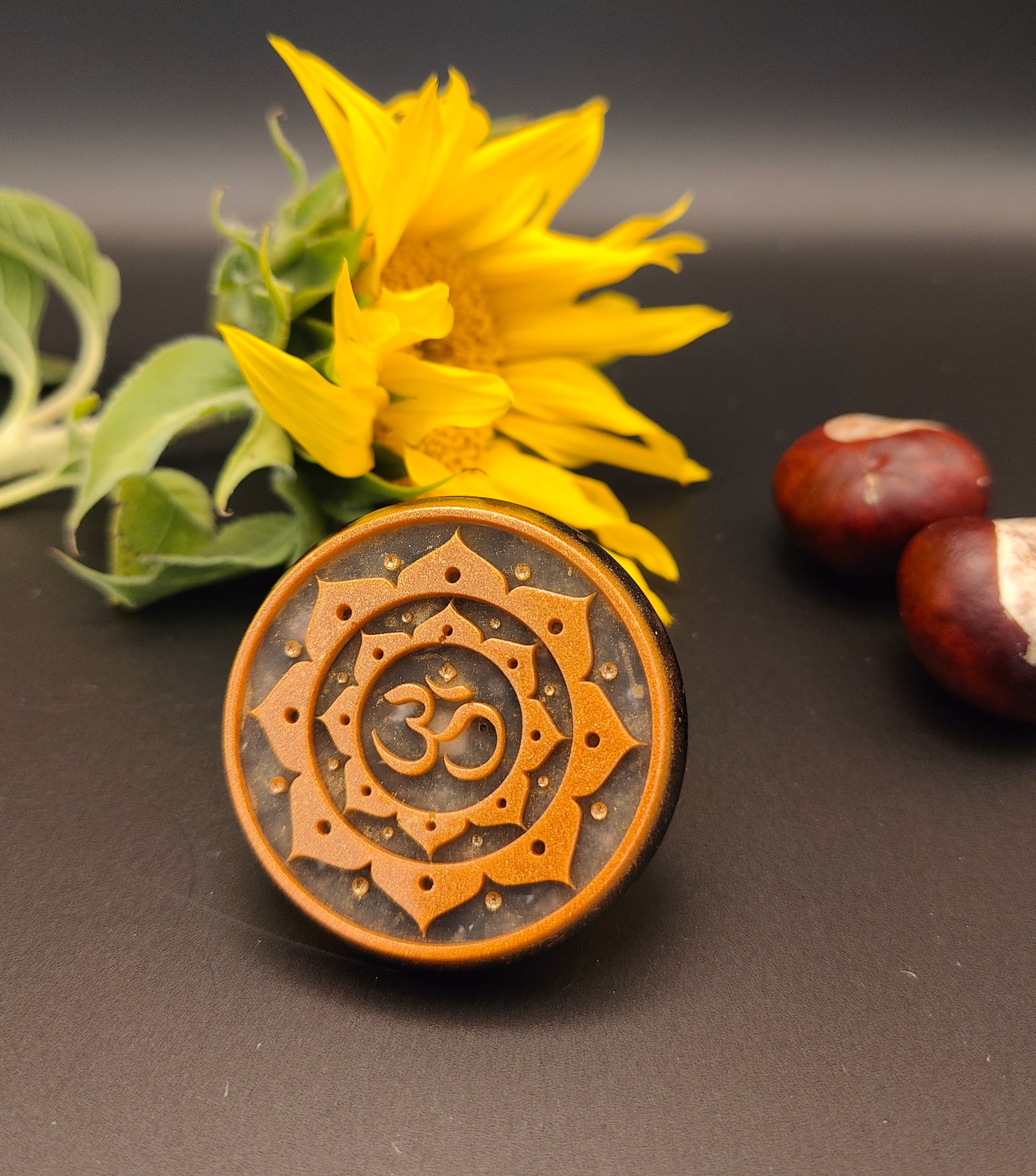 Ein in Gold gegossenes Om liegt über einer tranparenten - aber mit goldenem Schimmer - Schicht, Epoxitharz, in der Bergkristallsteine liegen. Die schwarze Schicht darunter enthält Shungit in Pulverform, zudem Eisenoxid, Kupfer, Messing und Eisen.