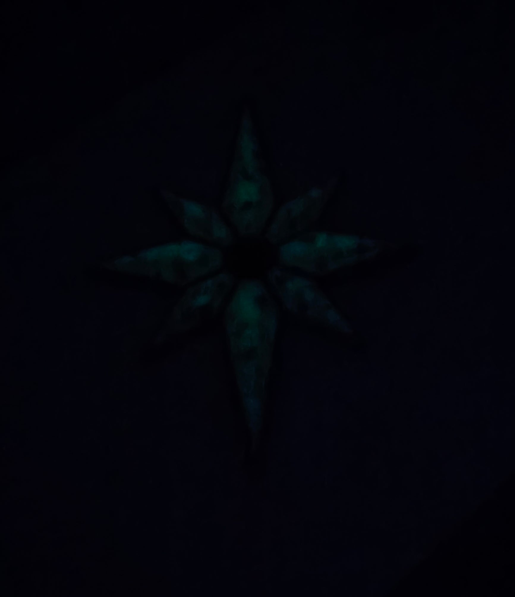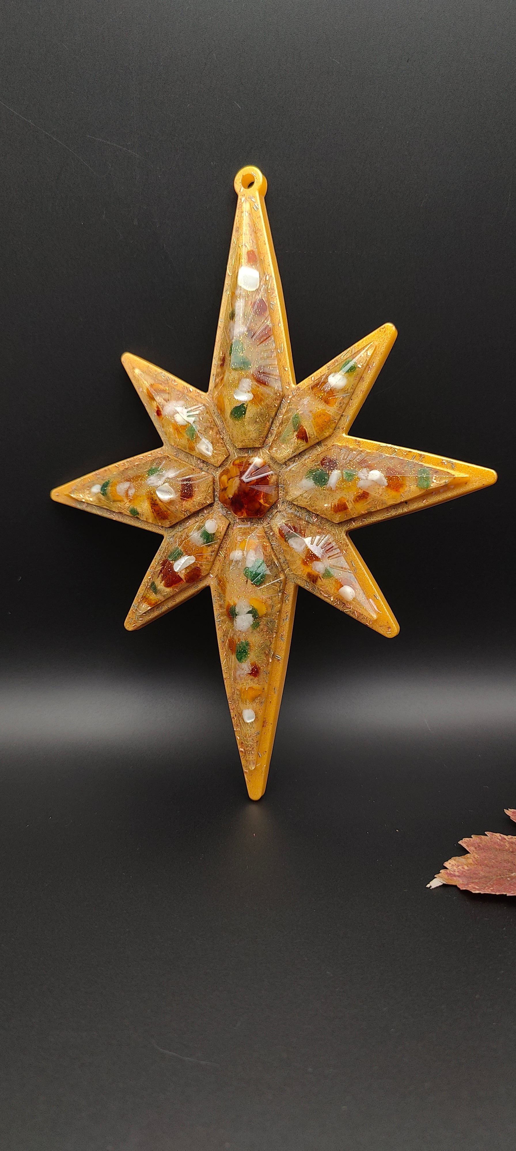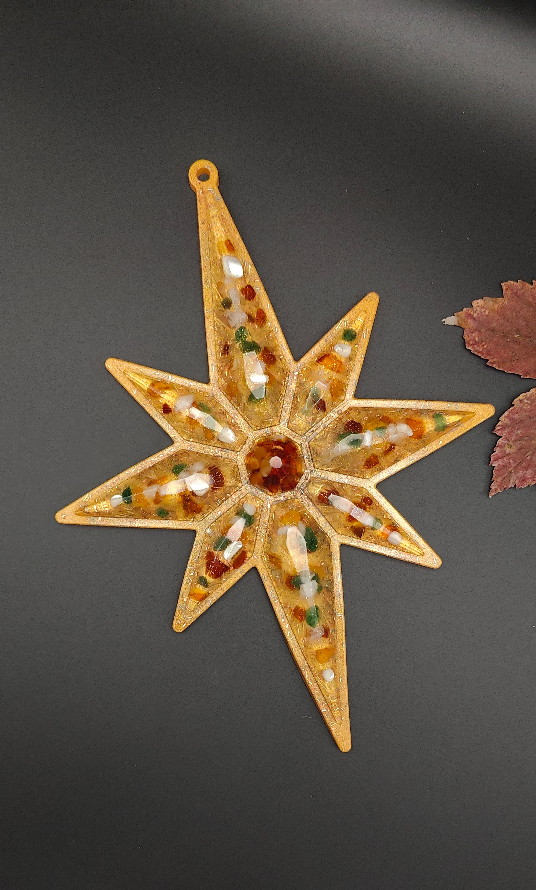 In der Mitte des Sterns befindet sich ein Bernstein-Achteck, die Strahlen mit einer leicht grün fluoreszierender klaren Schicht enthalten Bergkristall, Bernstein, Aventurin und Perlmutt und mit ein wenig goldenen Glitzer. In der goldenen Schicht finden sich Eisen, Kupfer, Messing und natürlich auch noch Agnihotraasche