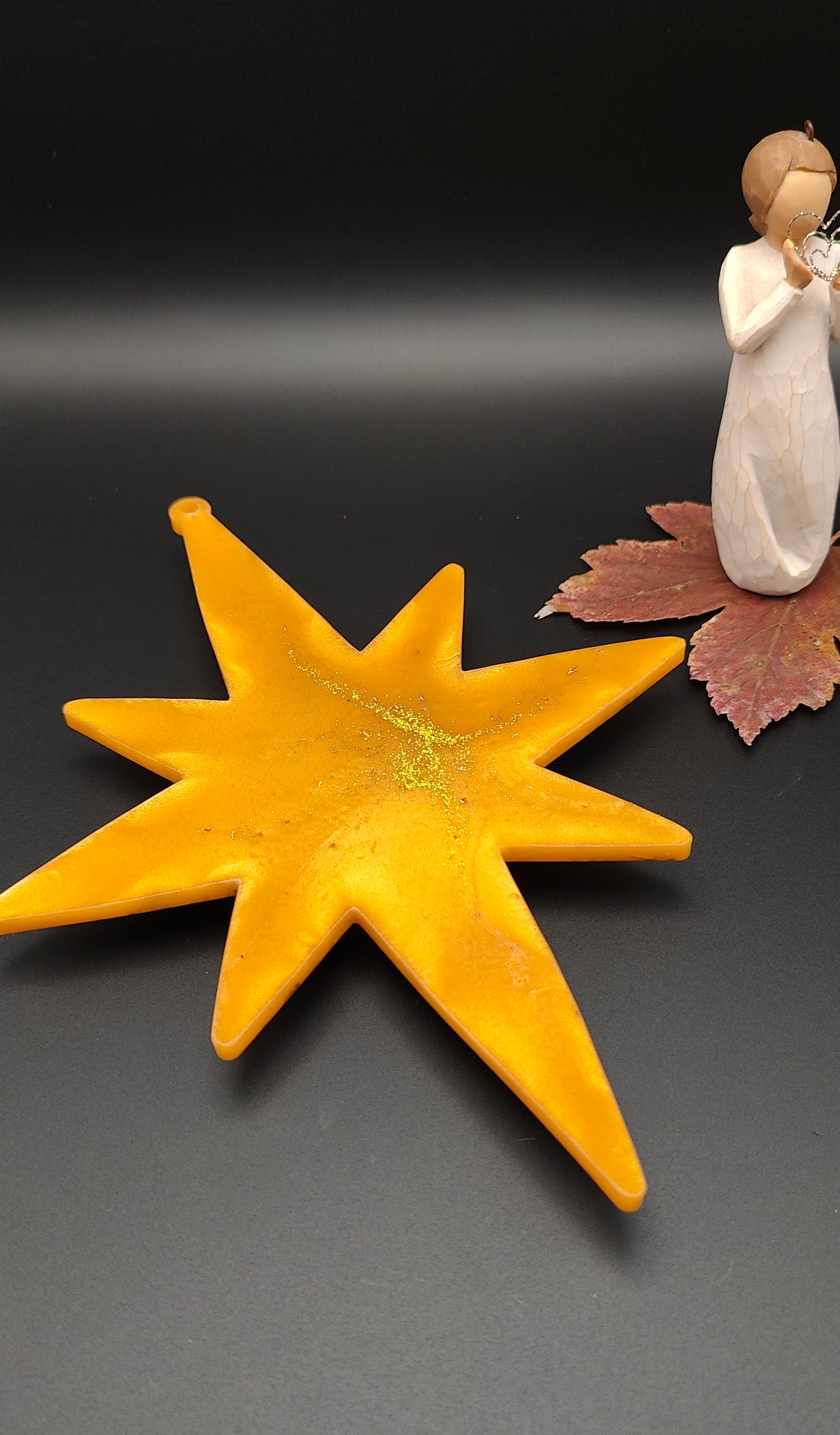 Der Stern ist ca. 17 cm breit, ca. 23 cm hoch und ca. 2 cm stark. Er eignet sich durch das enthaltende Loch an einem der langen Strahlen wunderbar dazu, aufgehängt zu werden.