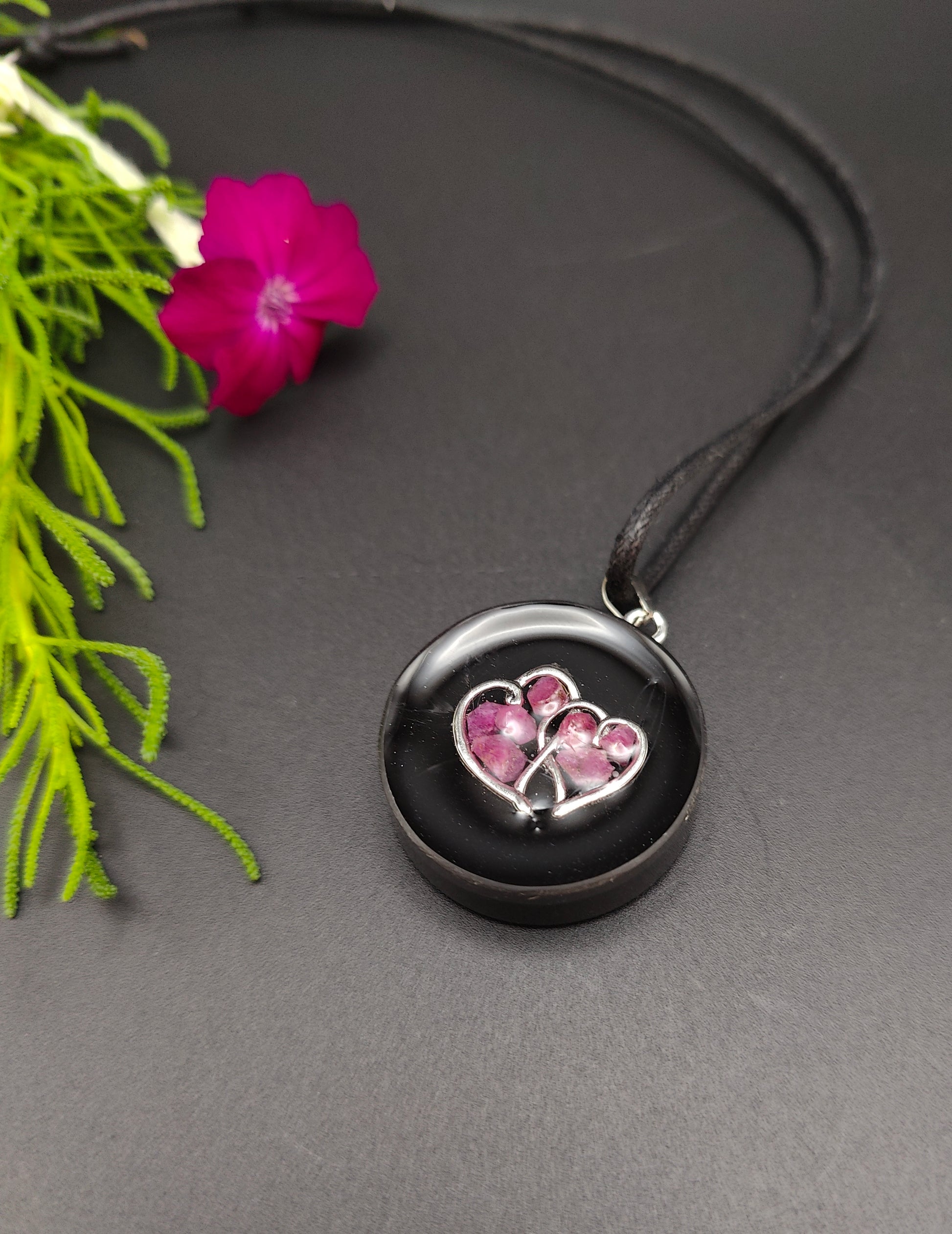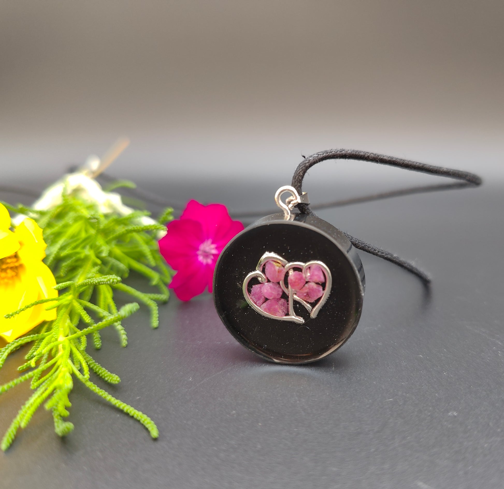 Wunderschöner Anhänger mit zwei verbundenen Herzen in silbernem Metall. Diese Herzen sind mit kleinen Rubinsteinchen gefüllt, die man zum Teil noch erhaben fühlen kann. Enthalten in der schwarzen Farbe sind Bergkristall und Shungit in Pulverform, außerdem Eisen, Messing und Kupfer. Der Durchmesser des Amulettes beträgt 3 cm und die Höhe ca. 0,9 cm.