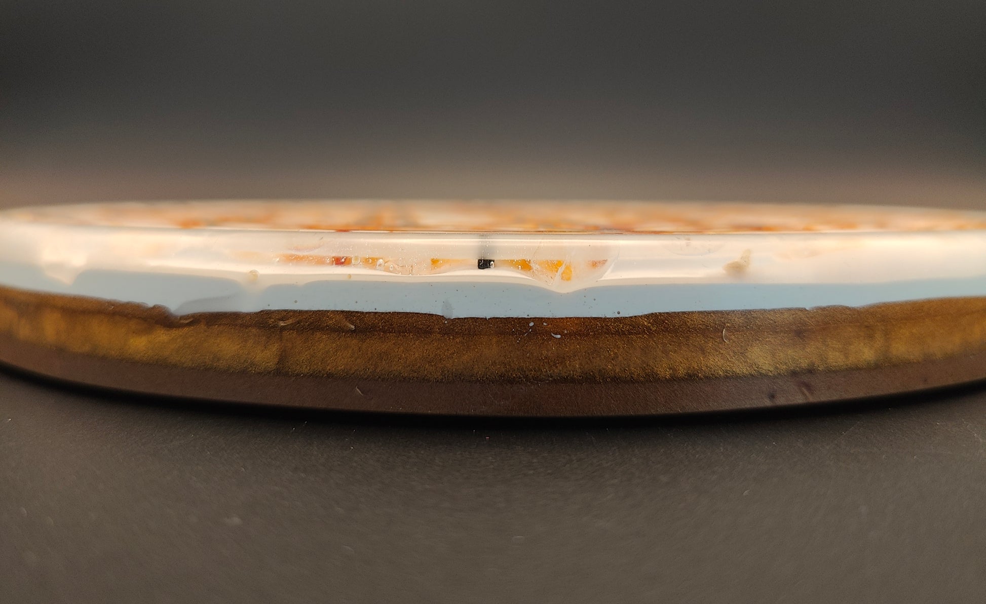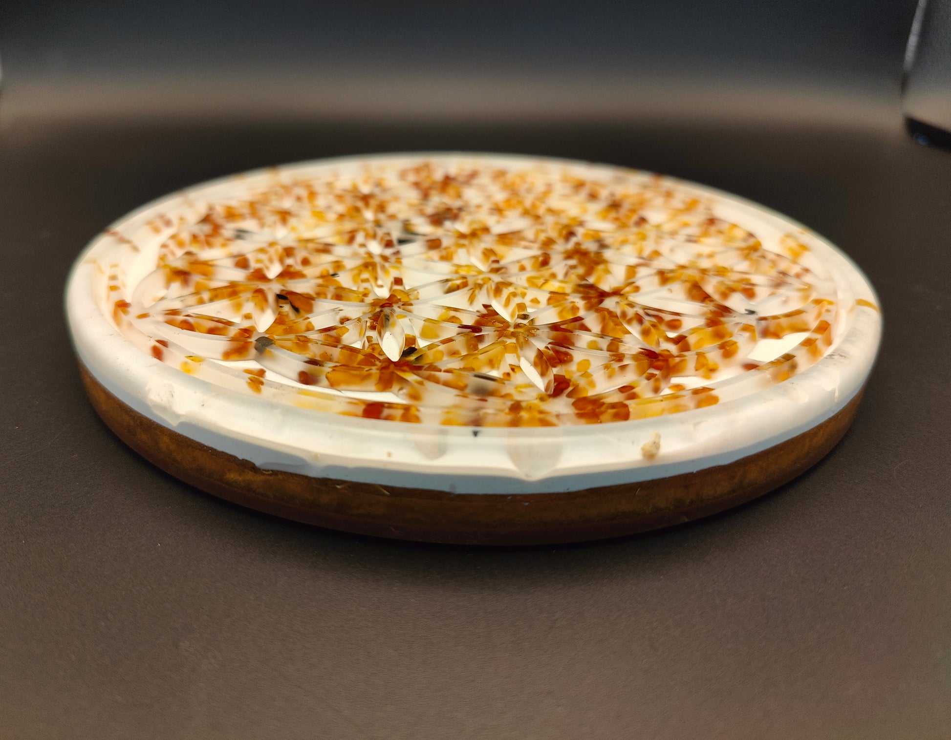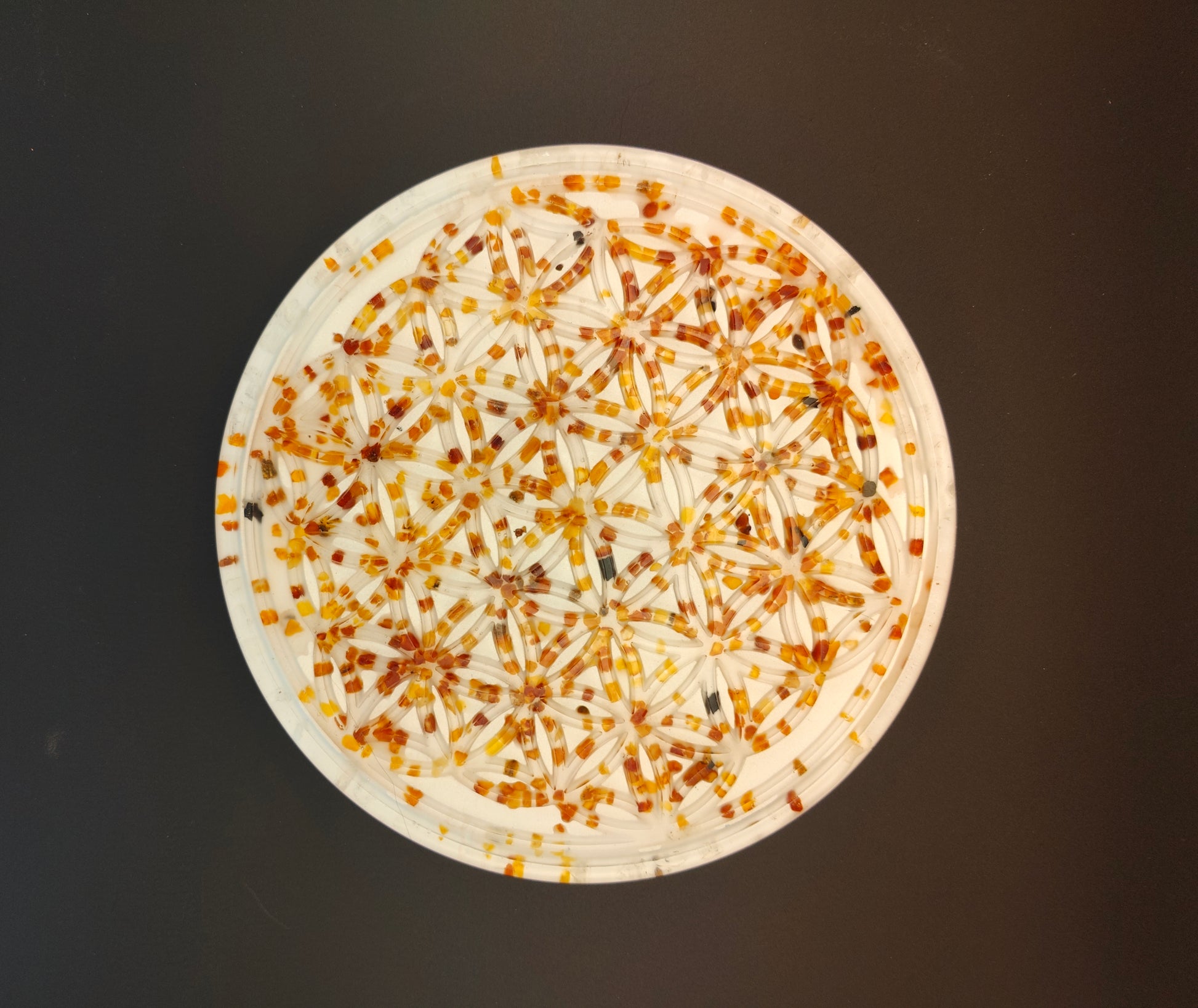 Diese Orgon-Platte mit einem Durchmesser von knapp 19 cm ist ca. 1,6 cm hoch. Die Blume des Lebens ist mit kleinen Bernsteinen bestückt, Bergkristall liegt als Rohstein im äußeren Ring und als Pulver in der weißen Schicht. In dieser ist zusätzlich noch Eisenoxid enthalten. In der goldenen und braunen Schicht liegen Kupfer, Messing, Eisen und Agnithotraasche.