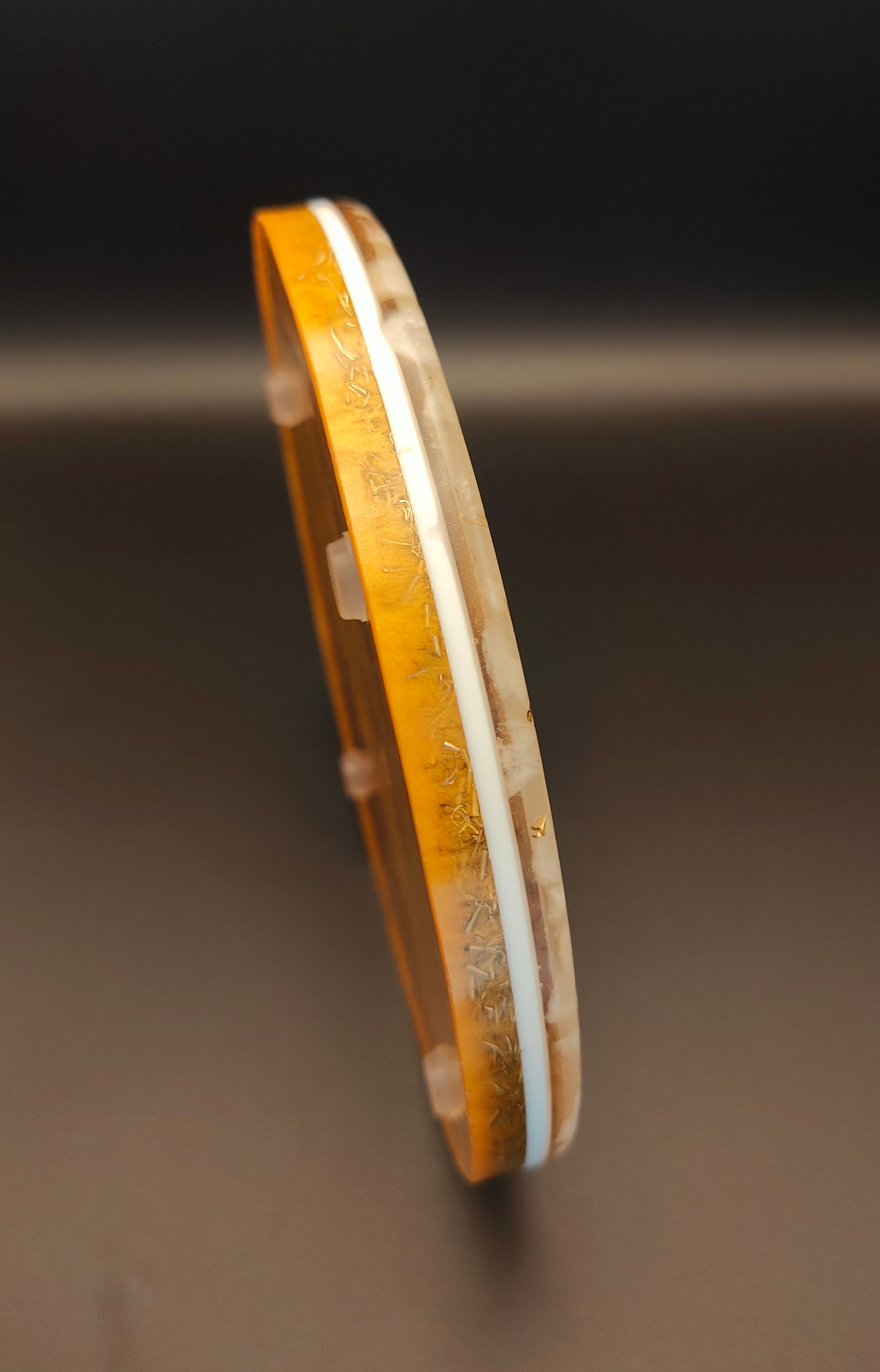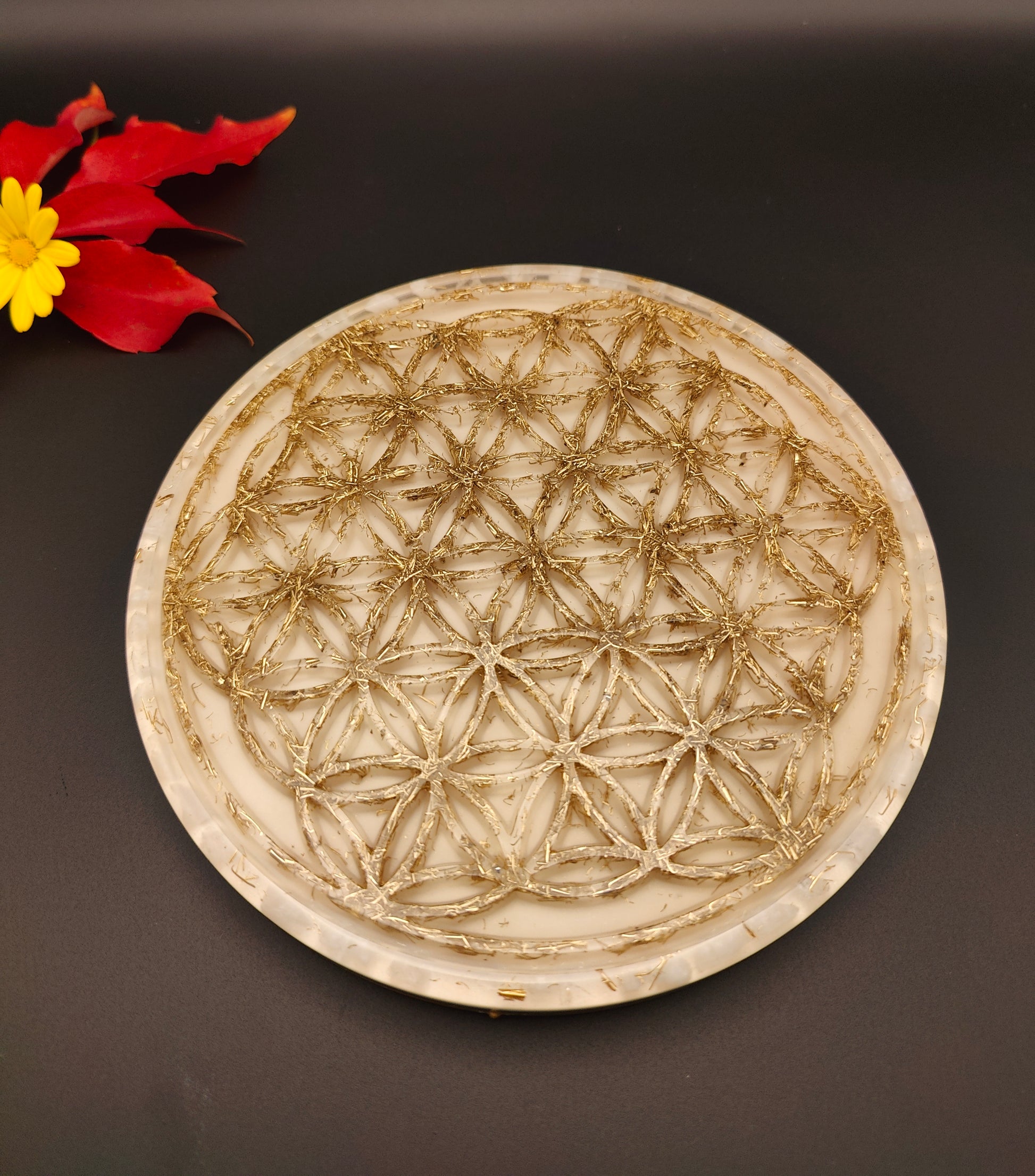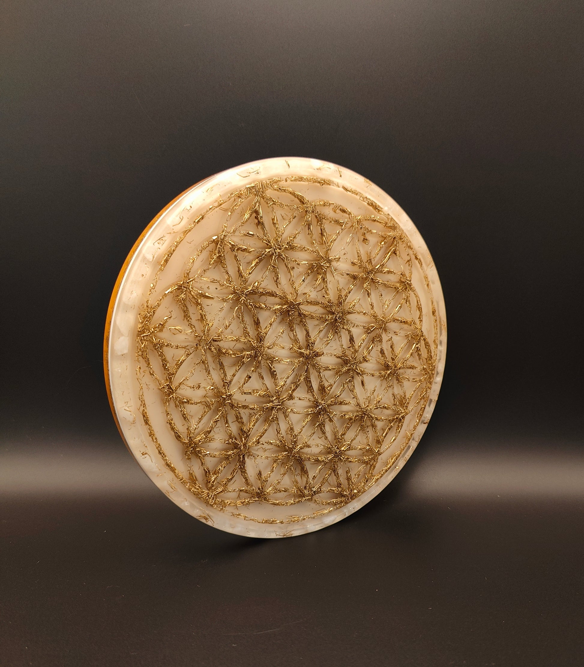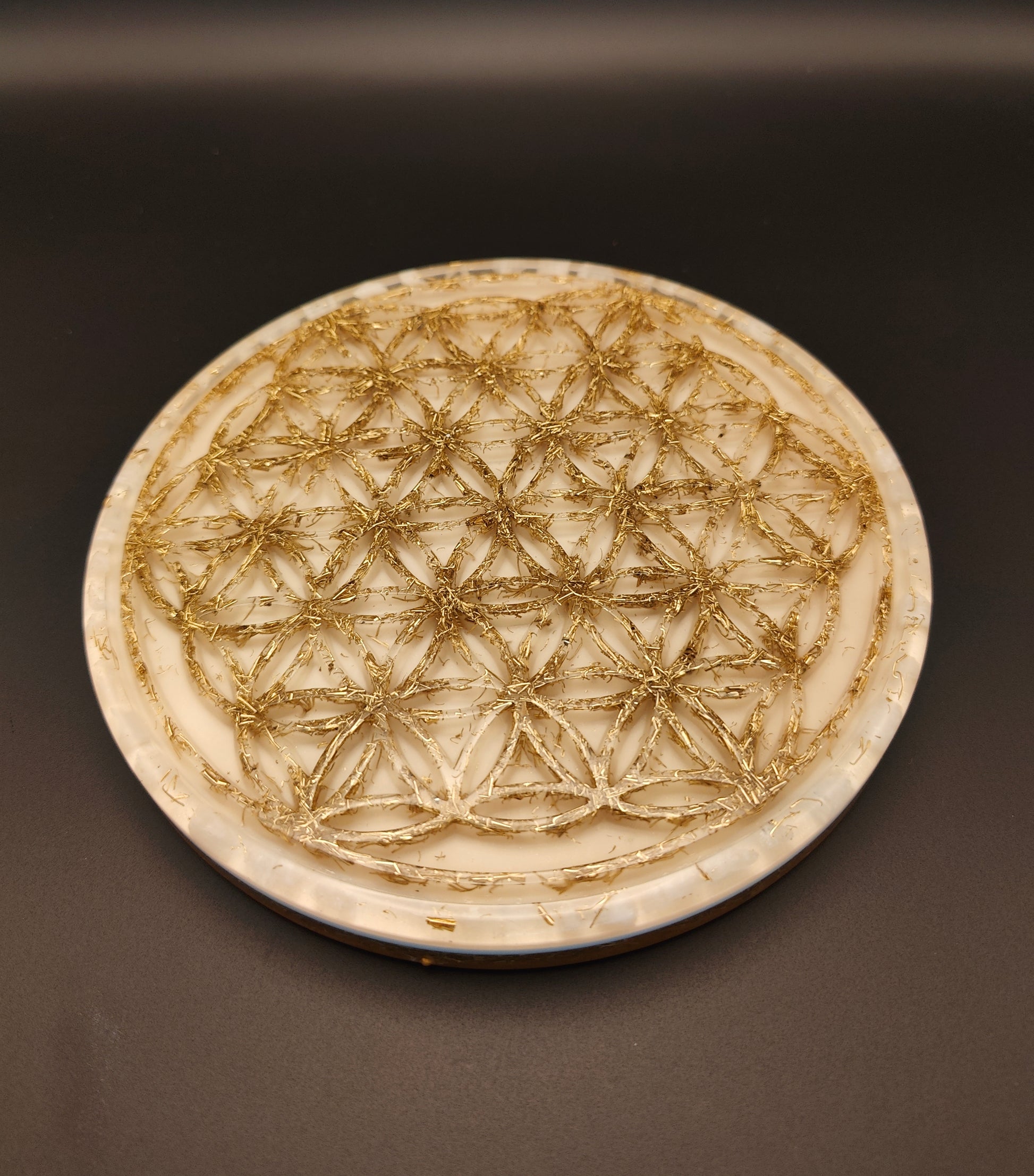Diese Orgon-Platte mit einem Durchmesser von knapp 19 cm ist ca. 1,8 cm Schwanz. Sie enthält viel Messing „in“ der Blume des Lebens, was der Platte einen tollen Style gibt. Bergkristall liegt als Rohstein im äußeren Ring, als Pulver in der weißen Schicht. Natürlich sind auch hier Kupfer, Messing, Eisen und Agnithotraasche in der Farbschicht enthalten.