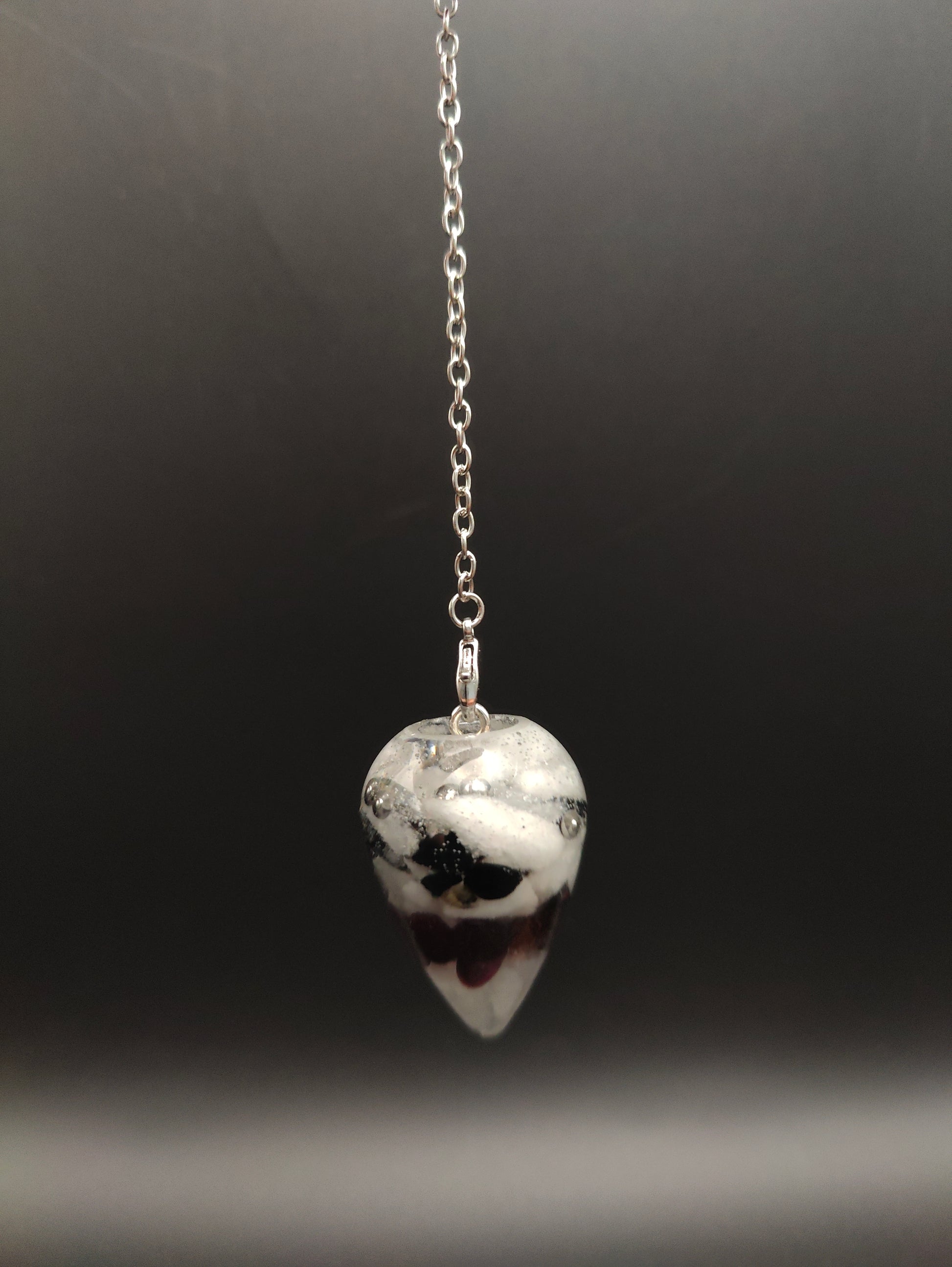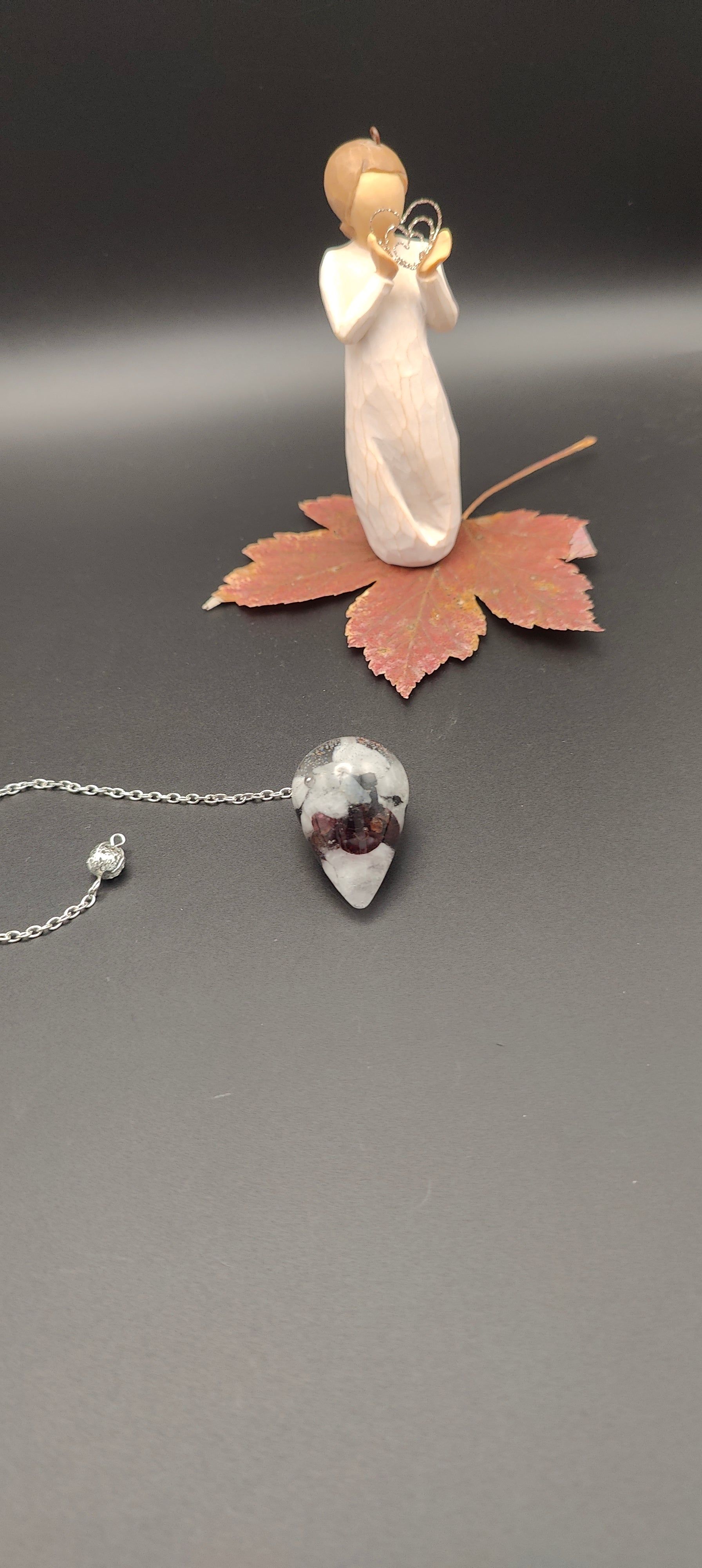 Wunderschöner Pendel mit Granat, Bergkristall, Shungit und ein paar Edelstahlkugeln an einem silber-farbenen Kettchen.