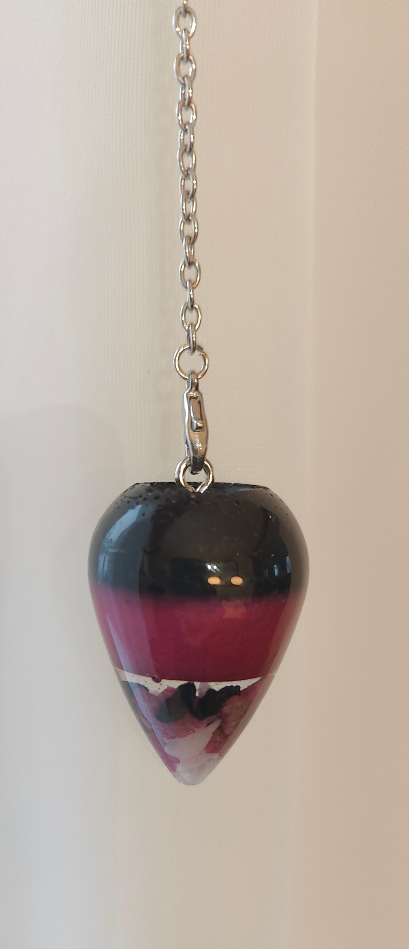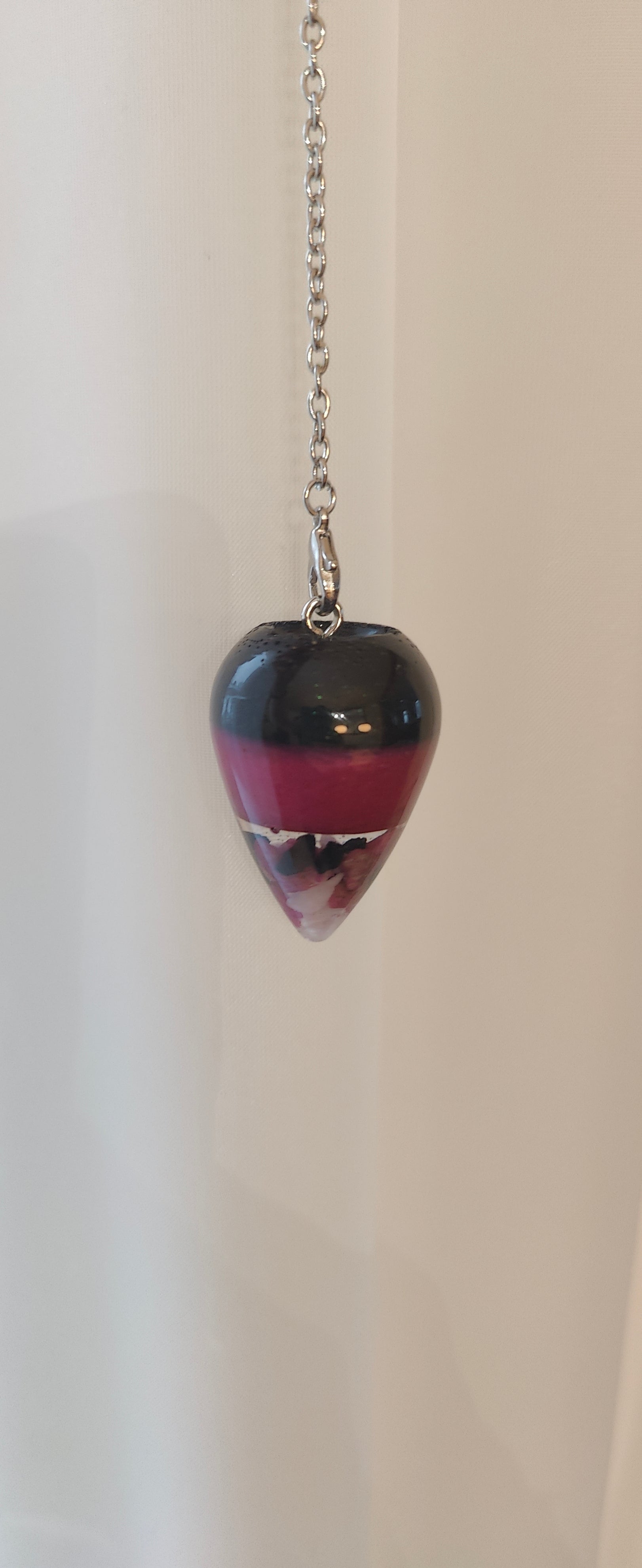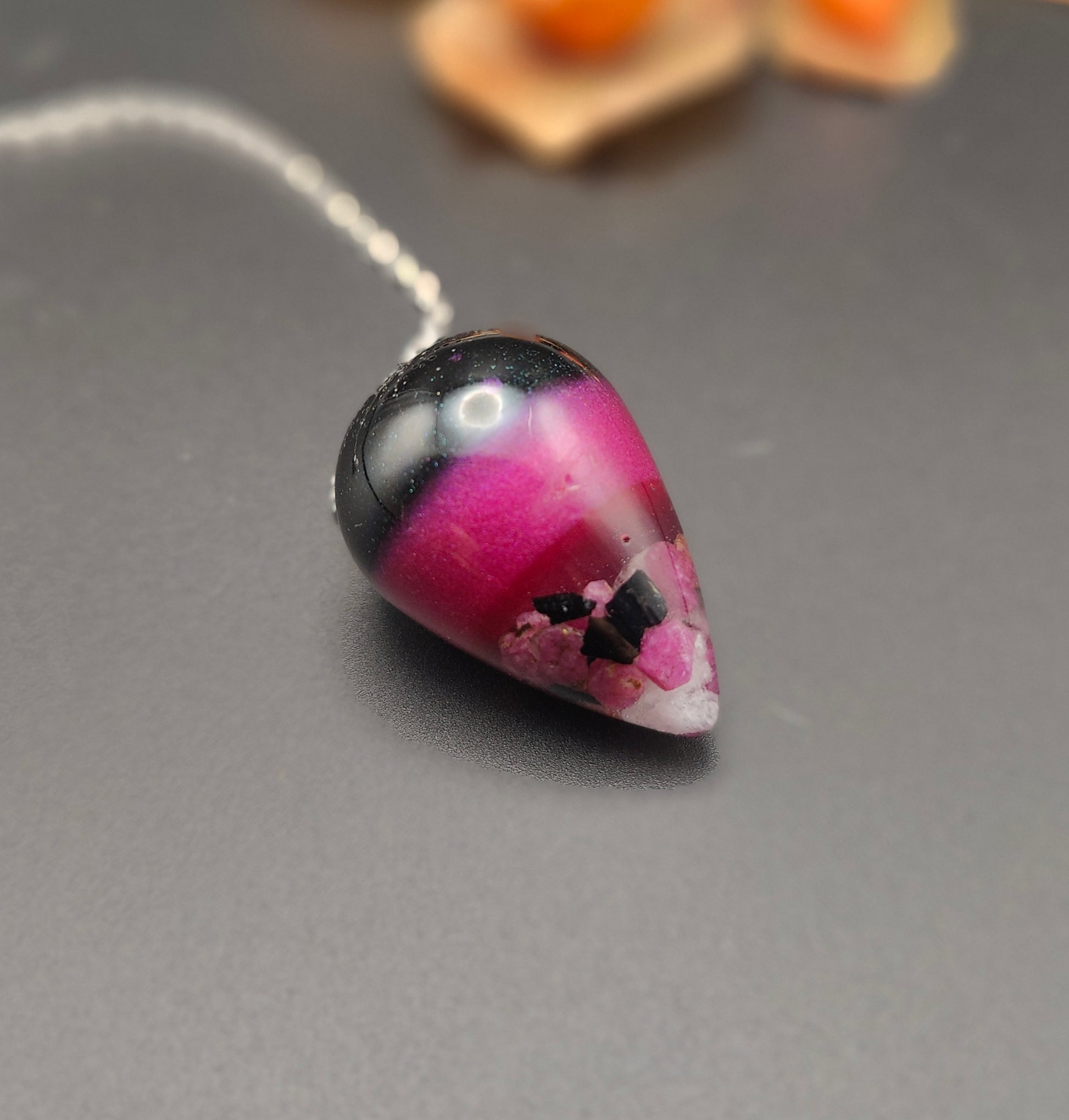 Wunderschöner Pendel mit Rubin, Bergkristall und Shungit in der Spitze und zwei schönen Farbschichten an einem silber-farbenen Kettchen.