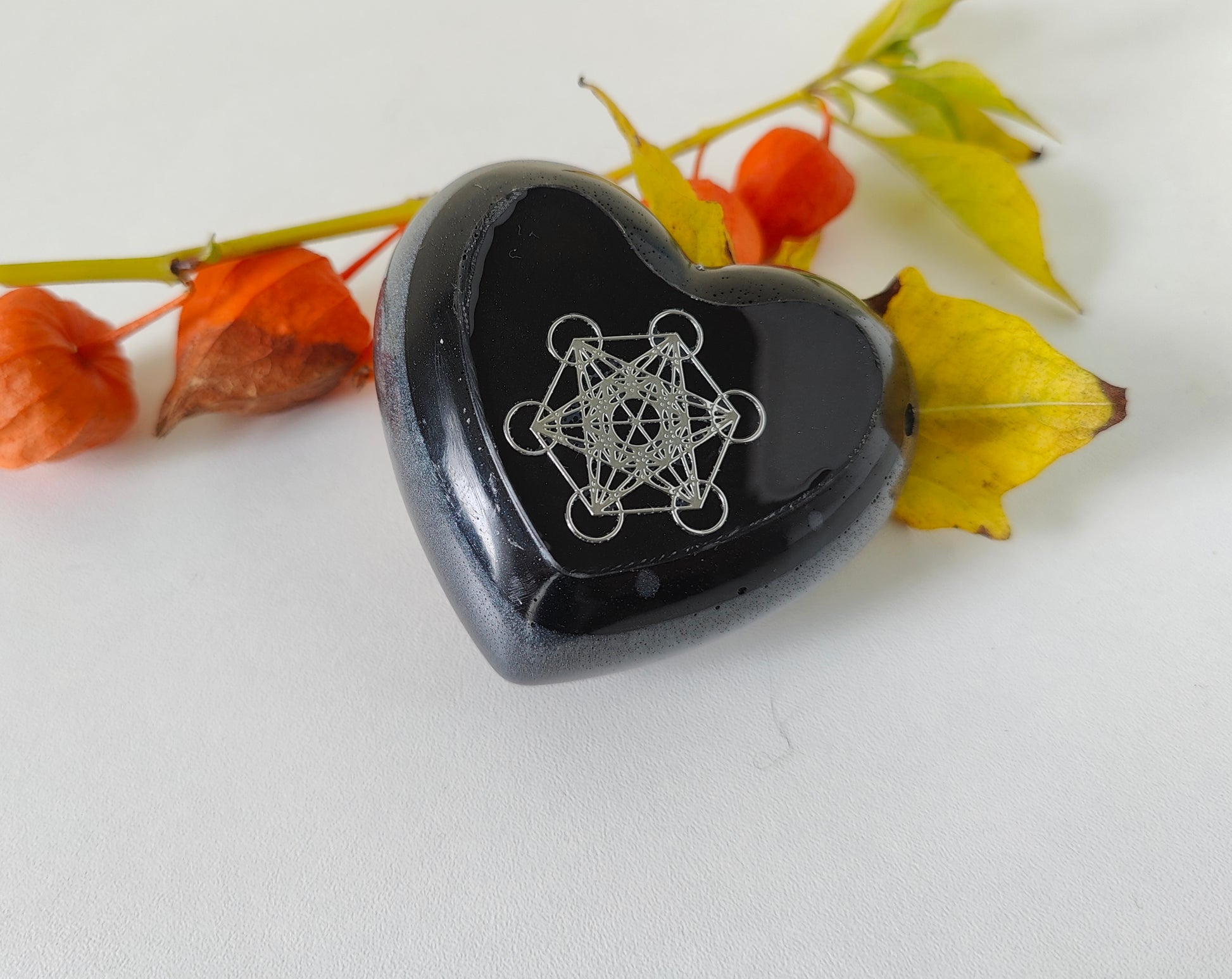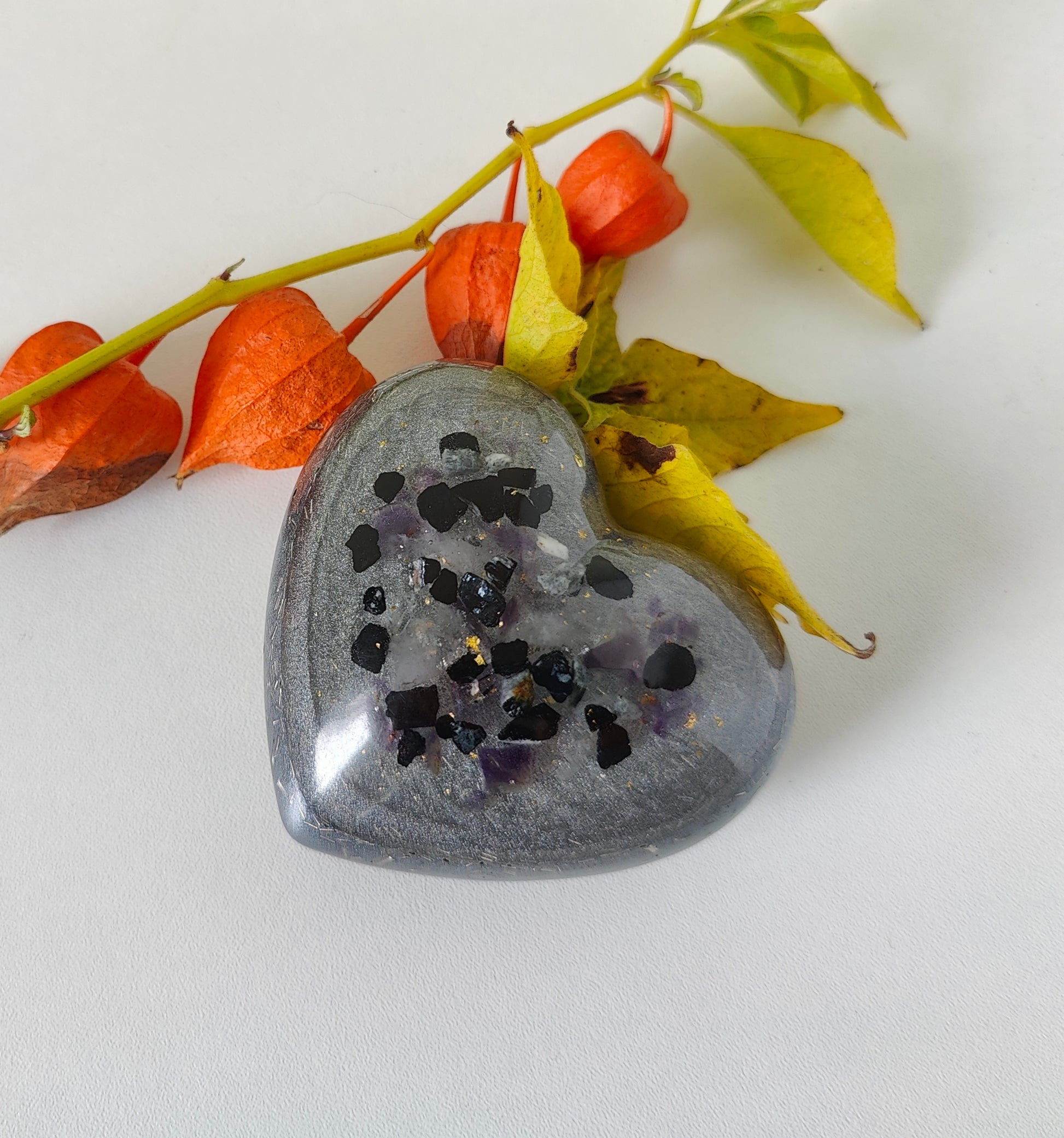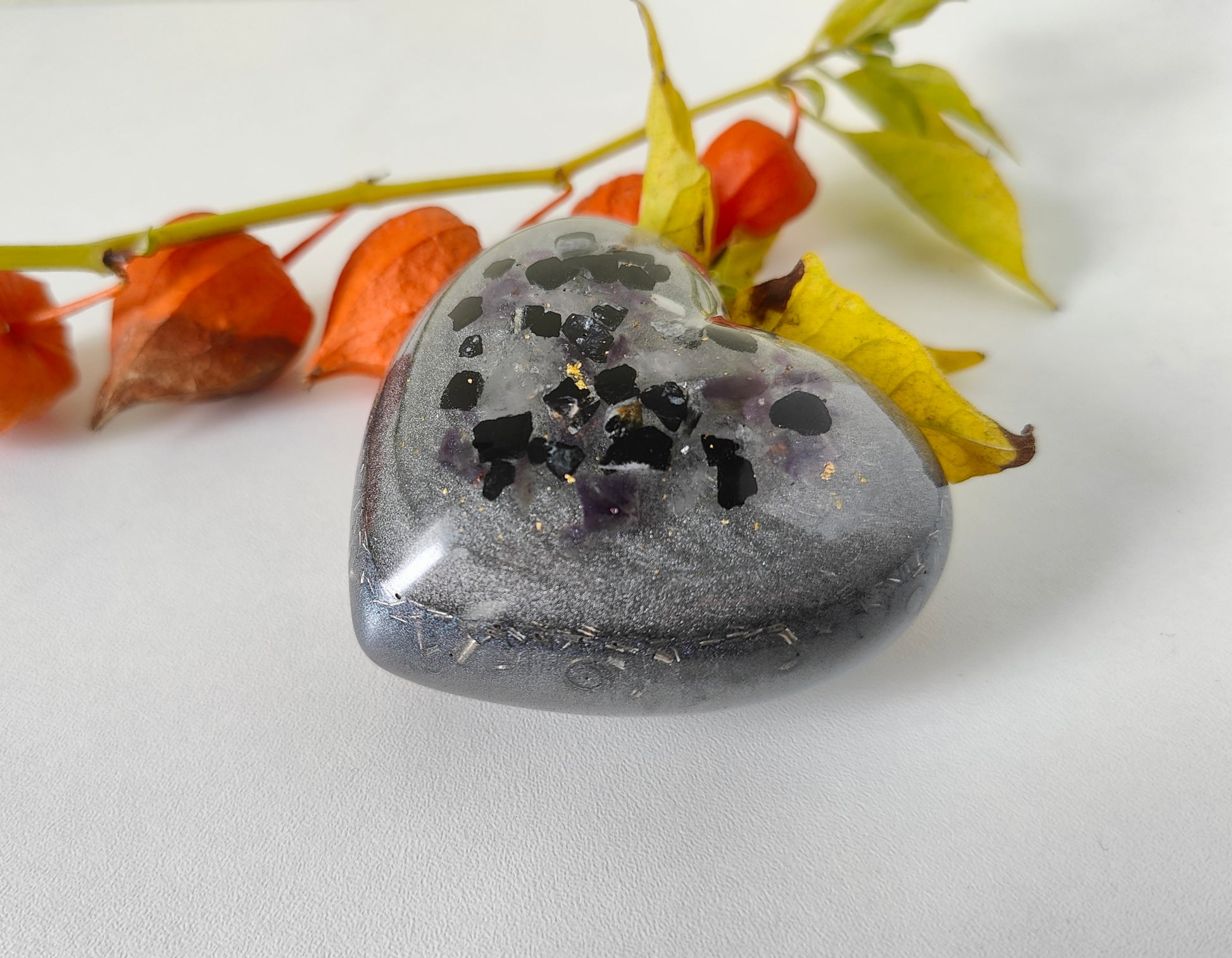 Dieses Herz enthält die Hauptsteine Bergkristall, Amethyst und Shungit, zudem 24K Blattgold.