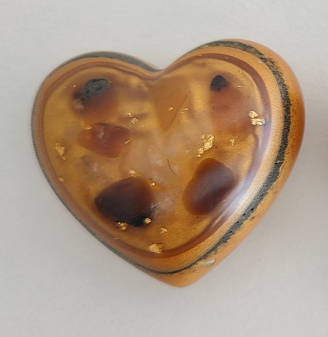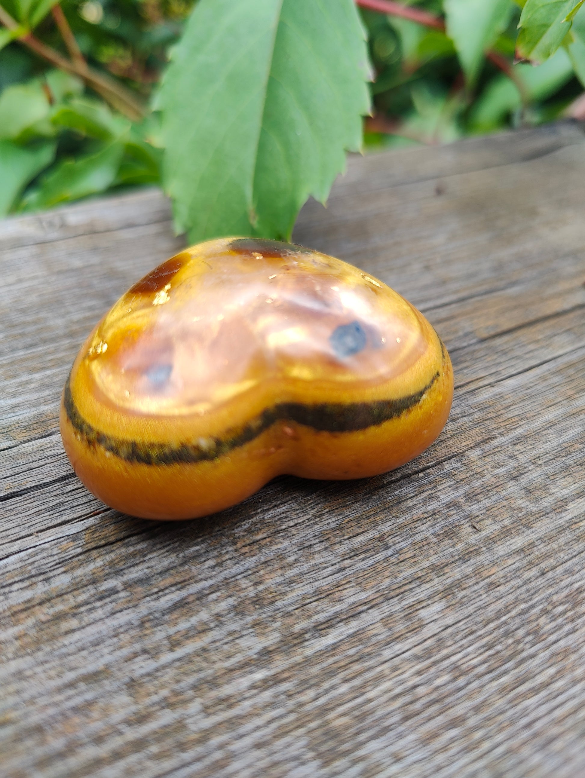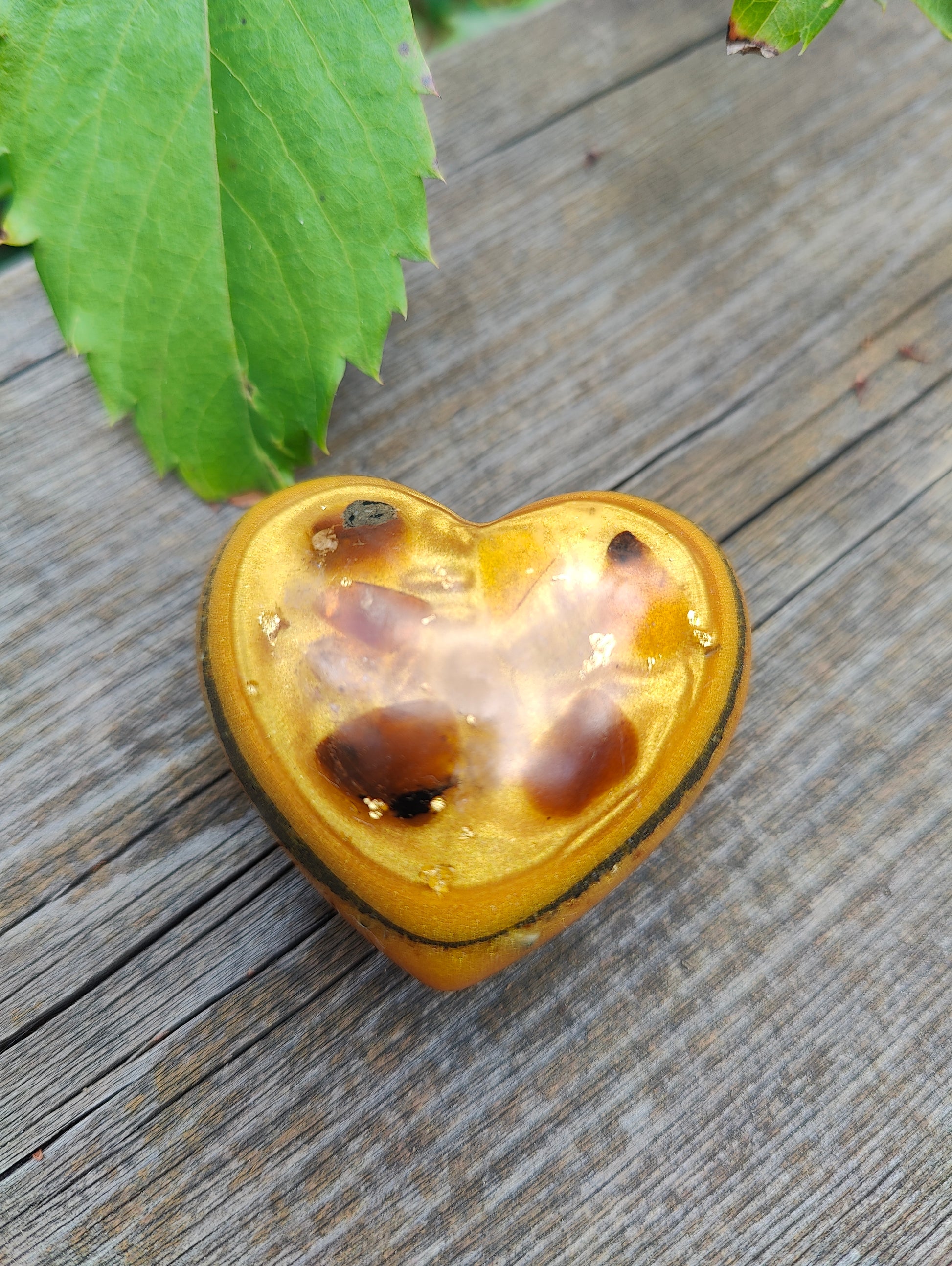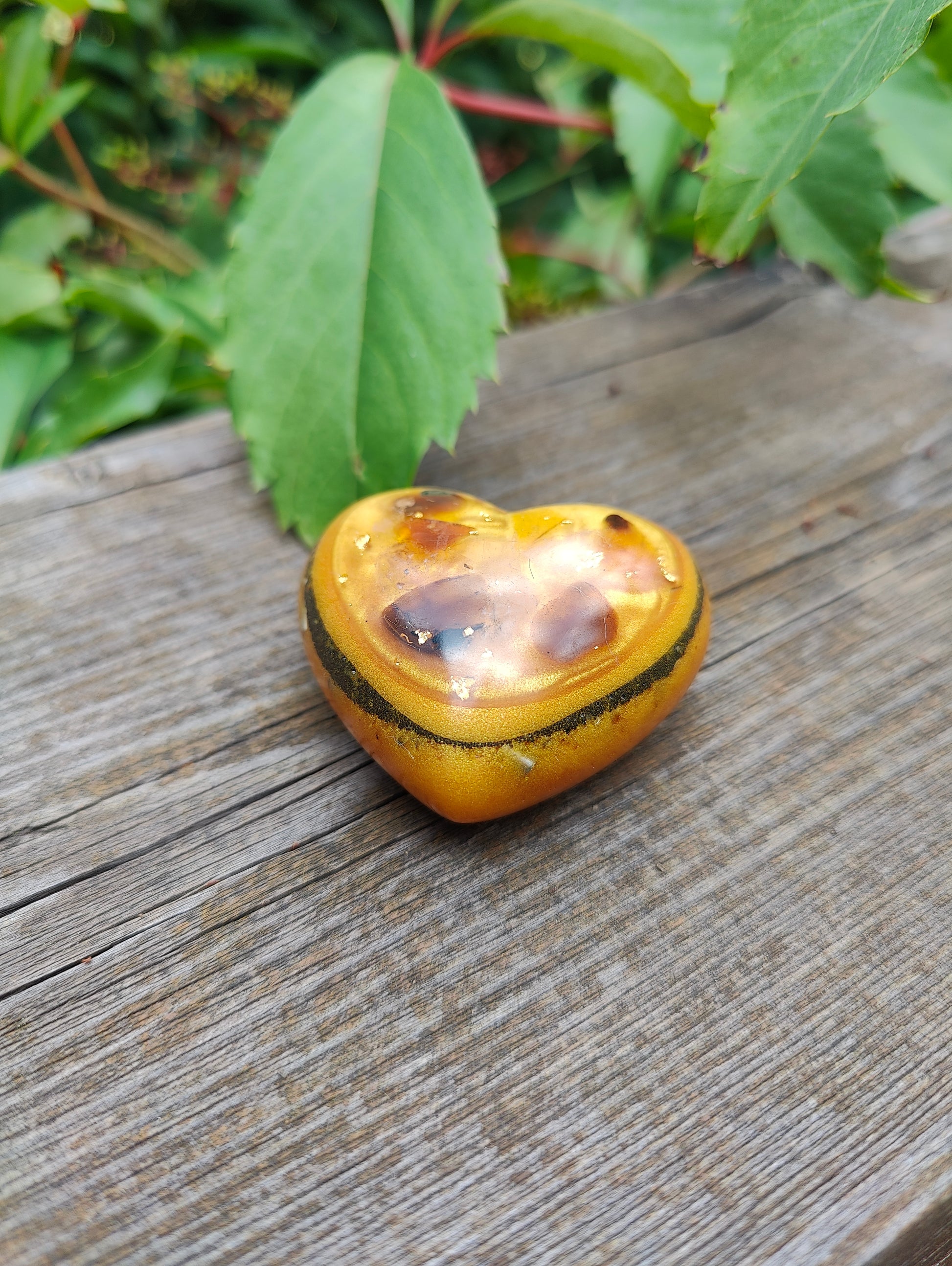In der klaren Schicht mit 24-Karat Blattgold liegen Bergkristall und Bernstein. Die goldene Farbschicht ist gefüllt mit einer dünnen Schicht feinem Stahlpulver, die dem Steinebett einen feinem Rahmen gibt, dazu natürlich auch Eisen, Messing, Kupfer und Agnihotraasche. Dieser Orgonit hat eine sehr warme und harmonische Ausstrahlung.