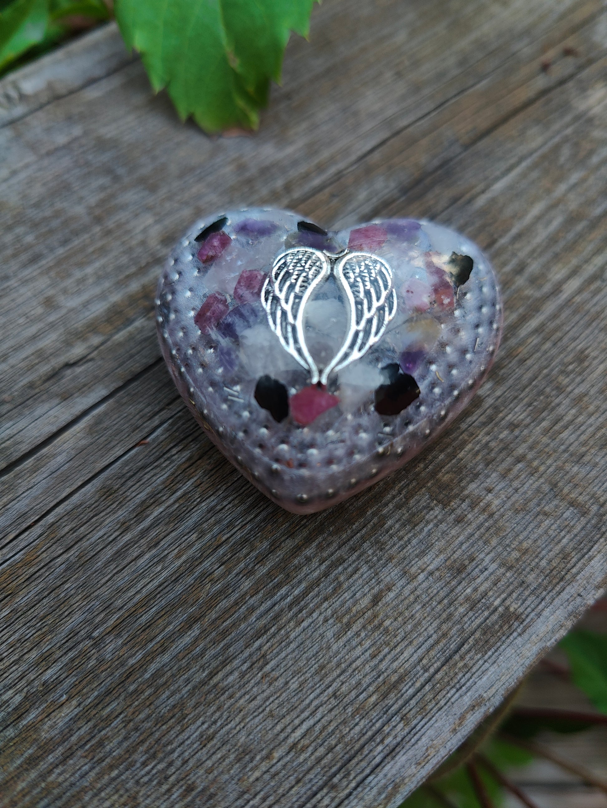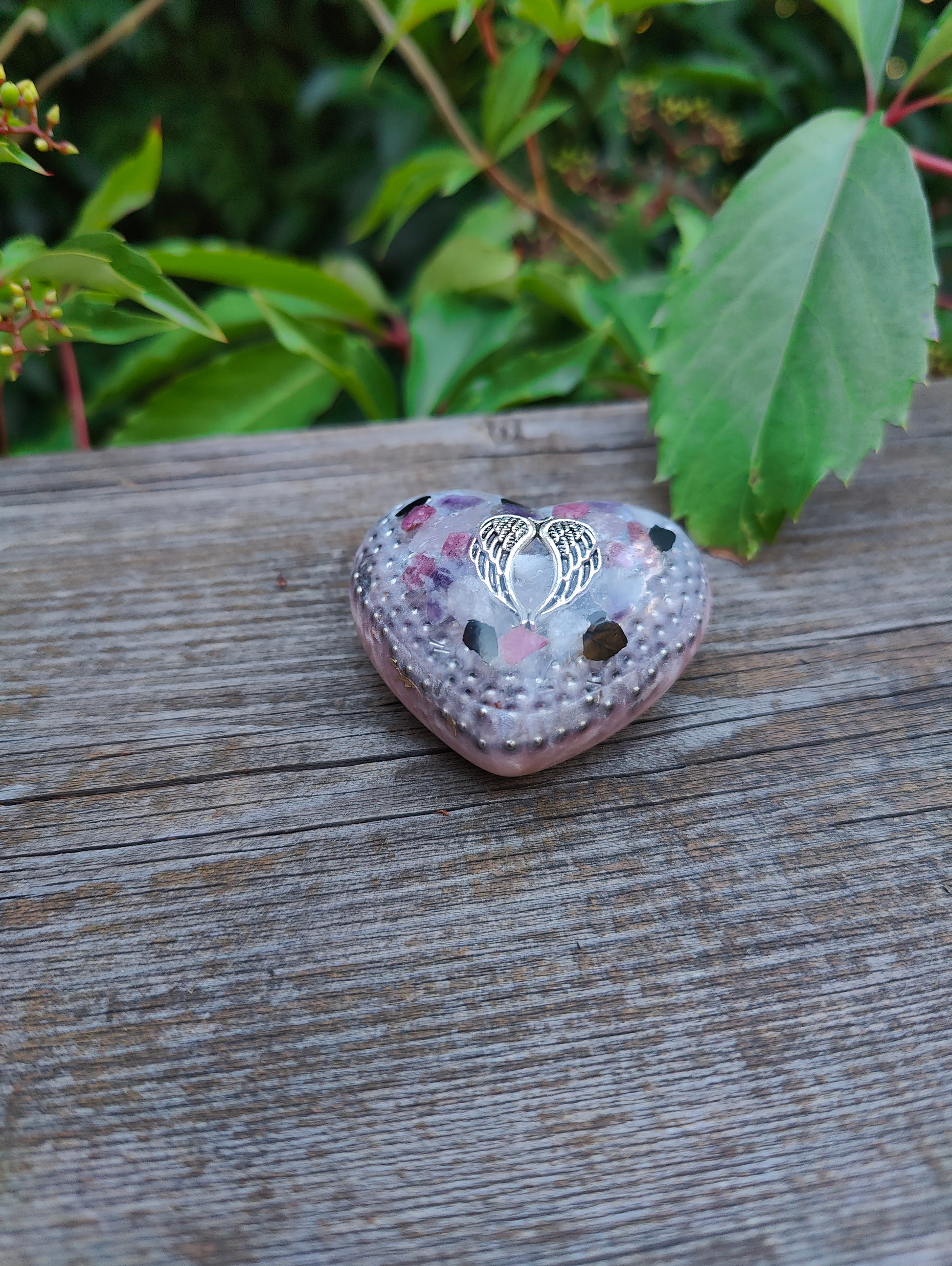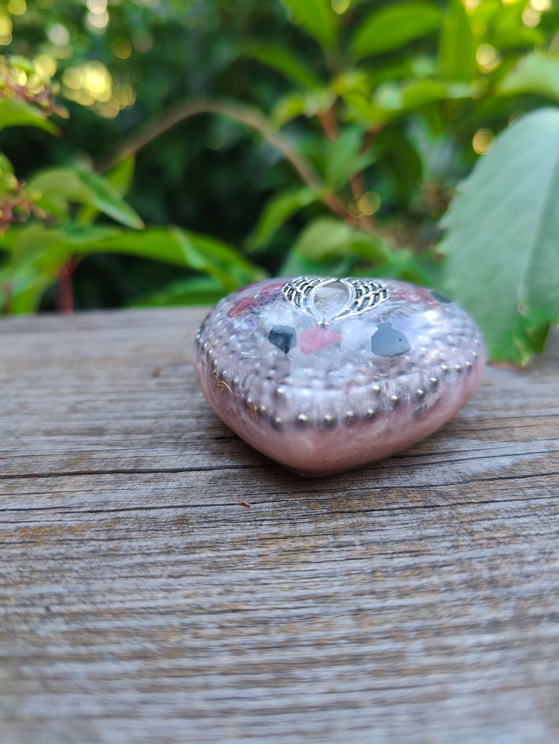 In der klaren Schicht liegen unter den bezaubernden silbernen Engelsflügeln, Bergkristall, Rubin, Rosenquarz, Amethyst und Shungit. Darunter liegen in der rosaroten Farbschicht zuerst Edelstahlkugeln, dann Eisen, Messing, Kupfer und Agnihotraasche.