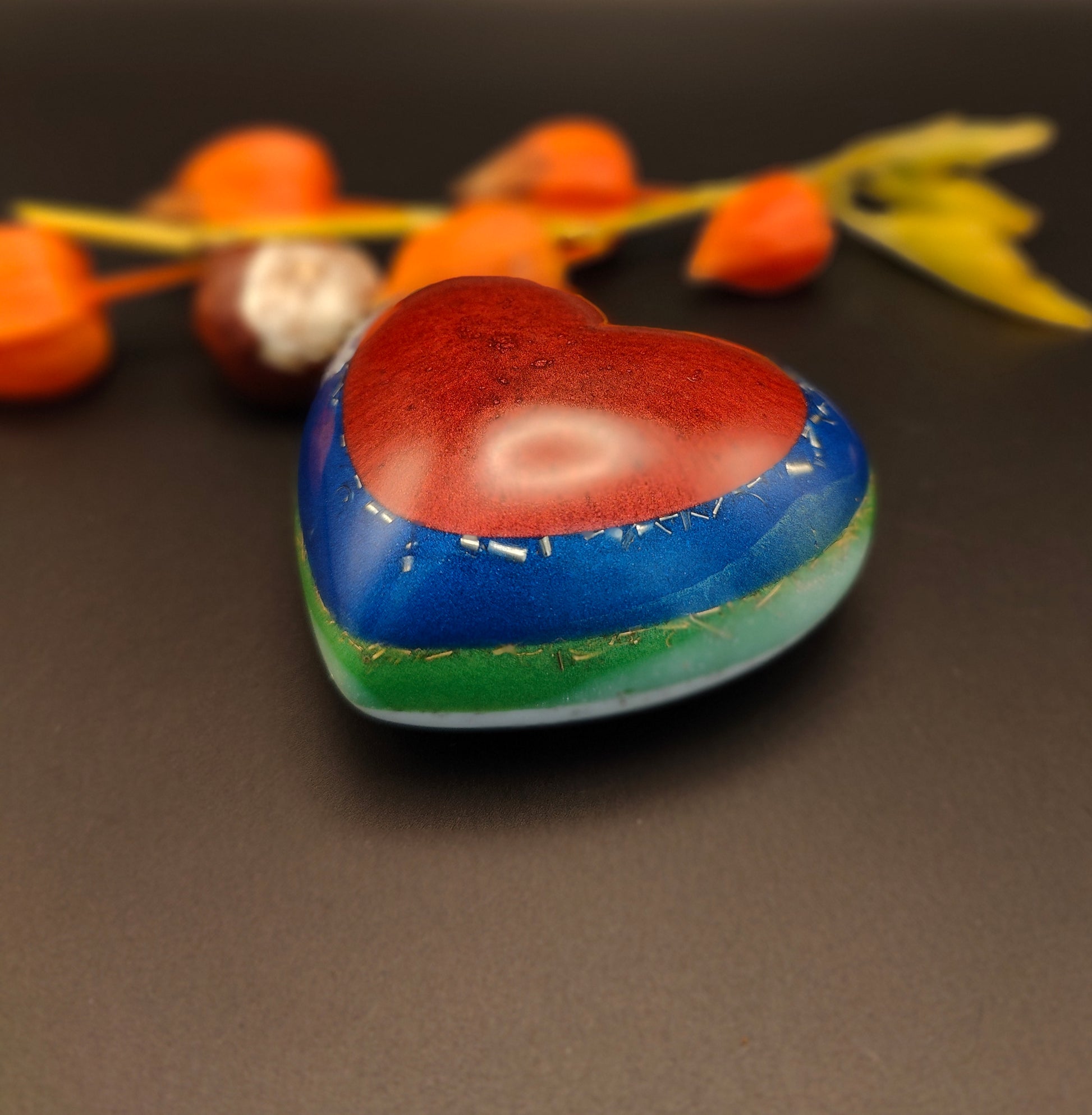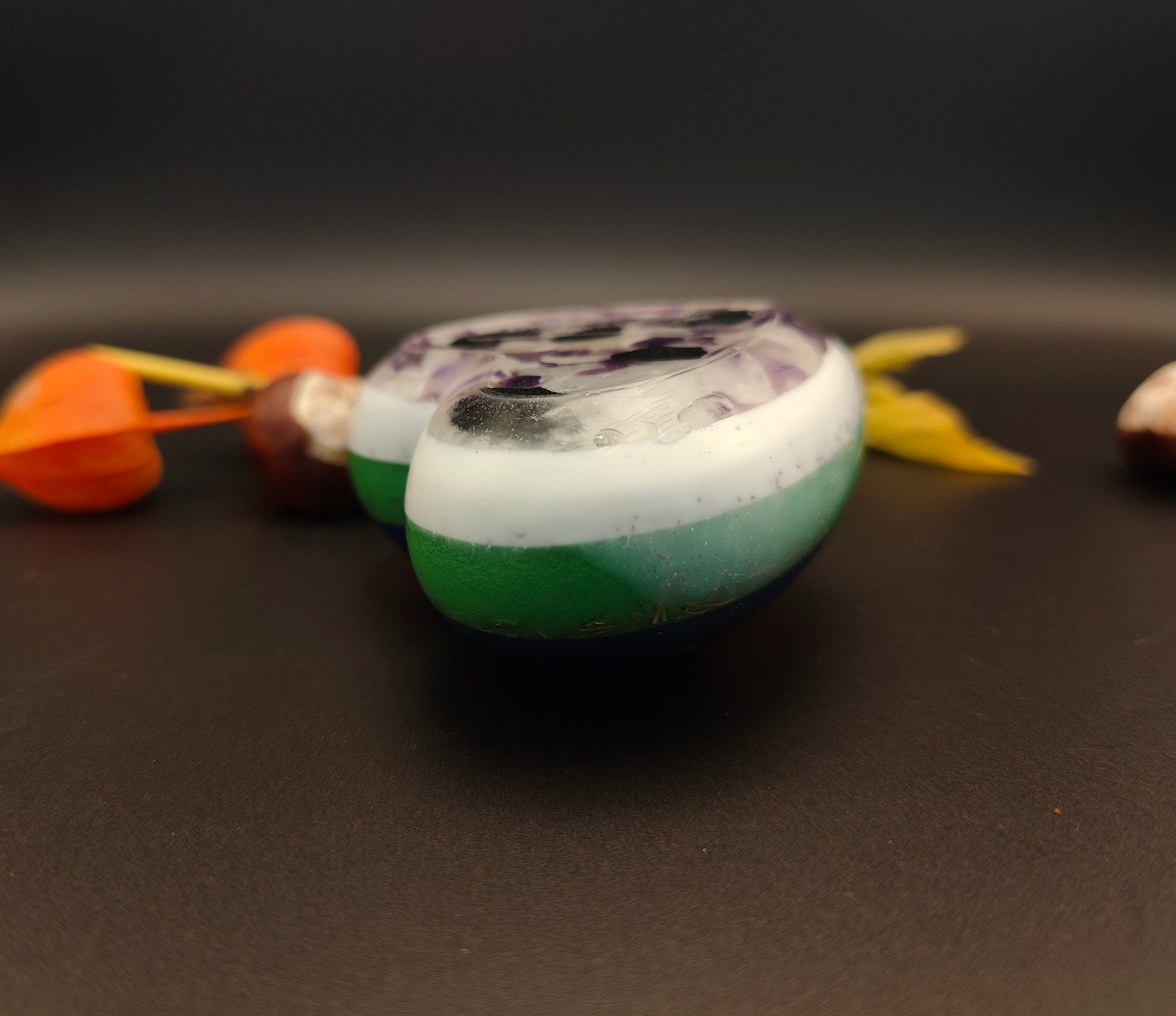 Die Farbschichten sind gefüllt mit Bergkristallpulver, Eisen, Eisenoxid, Messing, Kupfer und Agnihotraasche. In der klaren Schicht am Boden liegen viel Bergkristall, Amethyst und Shungit.