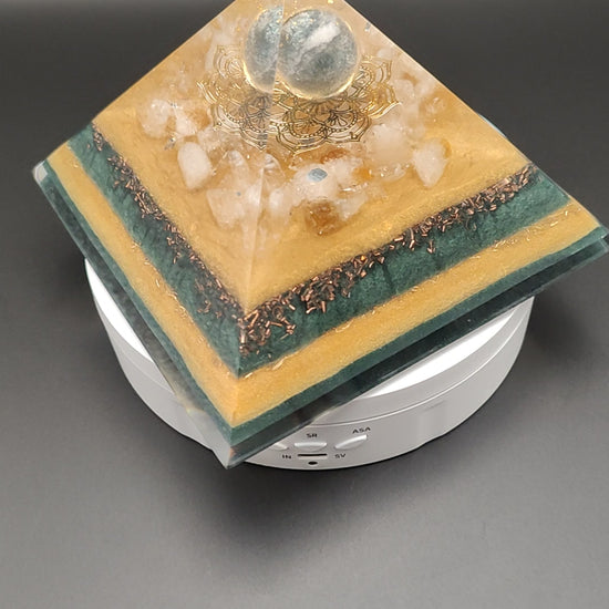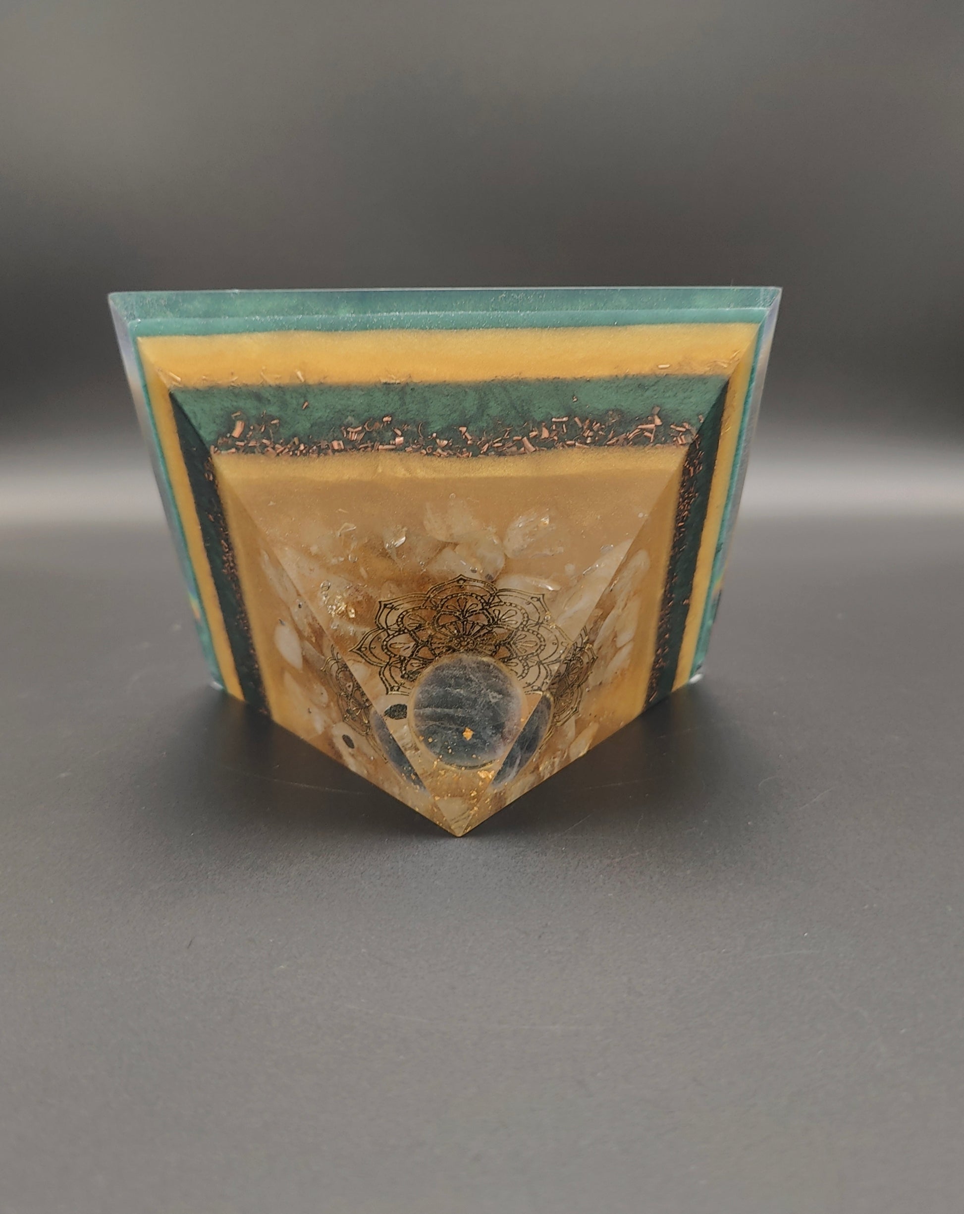 Unter einem 24K-Blattgold-Schicht schwebt eine grüne Achat-Kugel. Unter ihr liegt eine wunderschöne goldene Mandala-Blume aus Metall, diese ist gebettet auf Citrin und 4 Bergkristallspitzen. In den Farbschichten versteckt finden sich noch Shungit und Selenit.