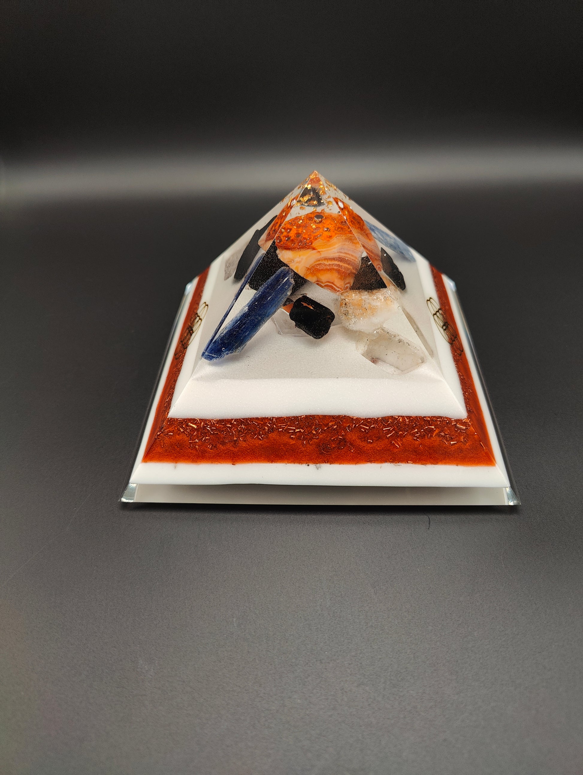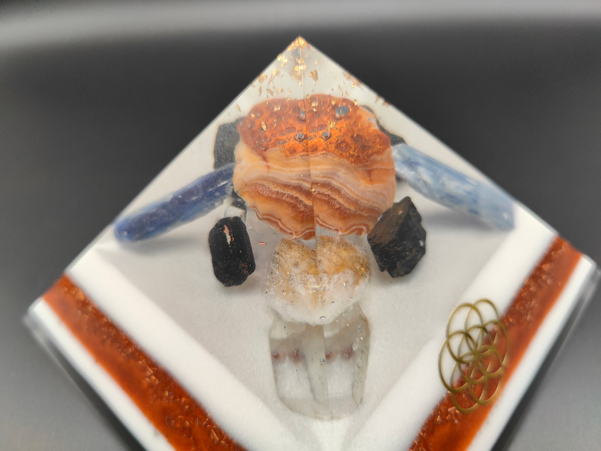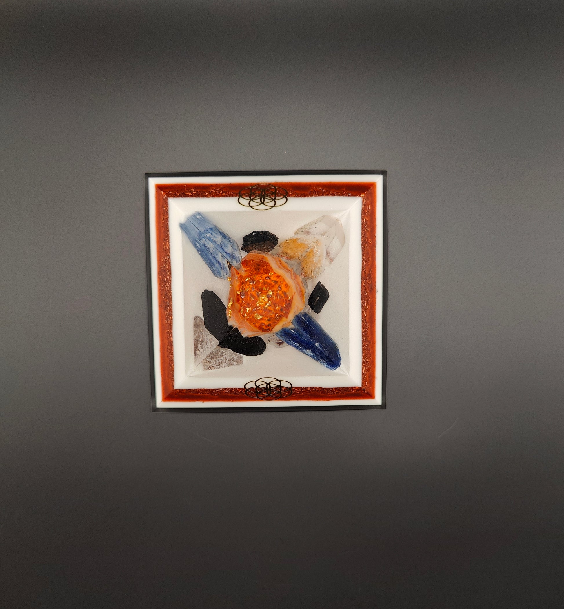 In der klaren Schicht thront ein großer Karneol unter einem Dach mit 24K-Blattgold. Dazu gesellen sich Bergkristall, Cyanith, Citrin, schwarzer Turmalin und Shungit.